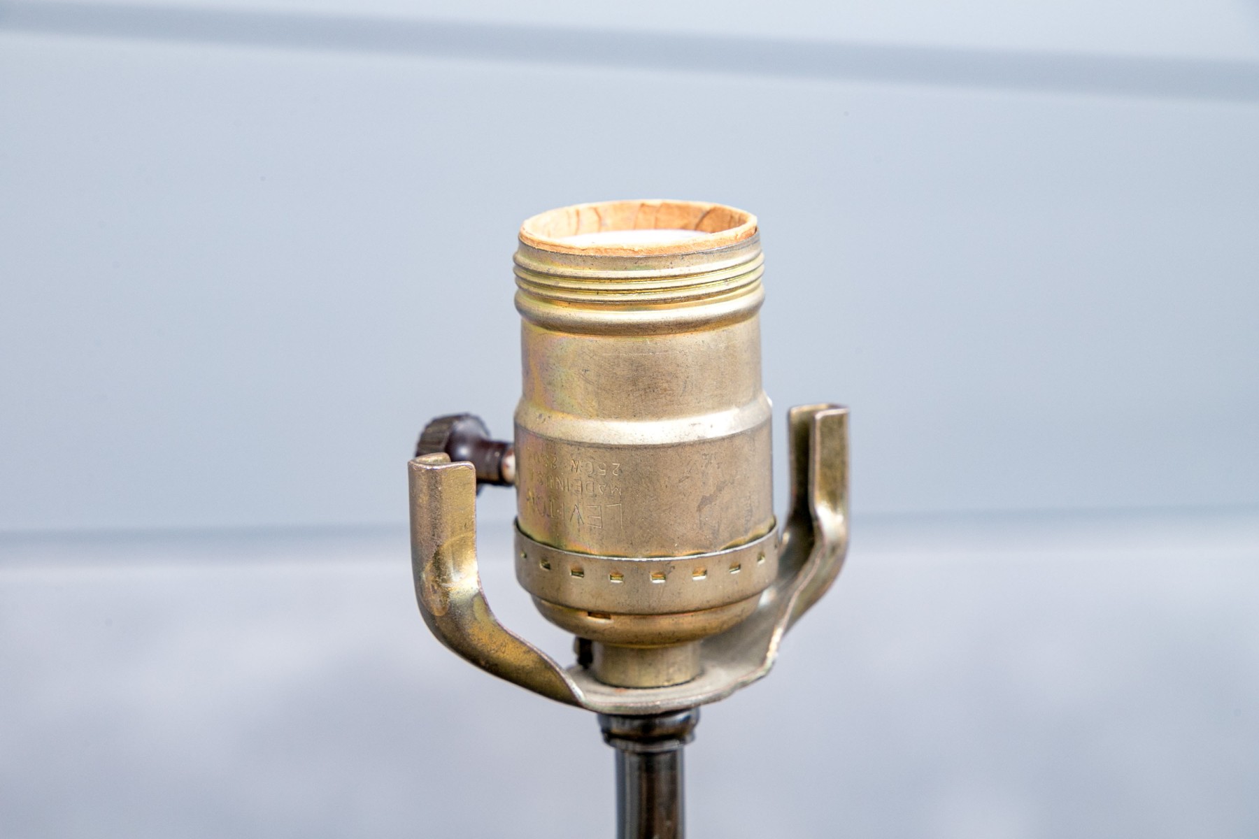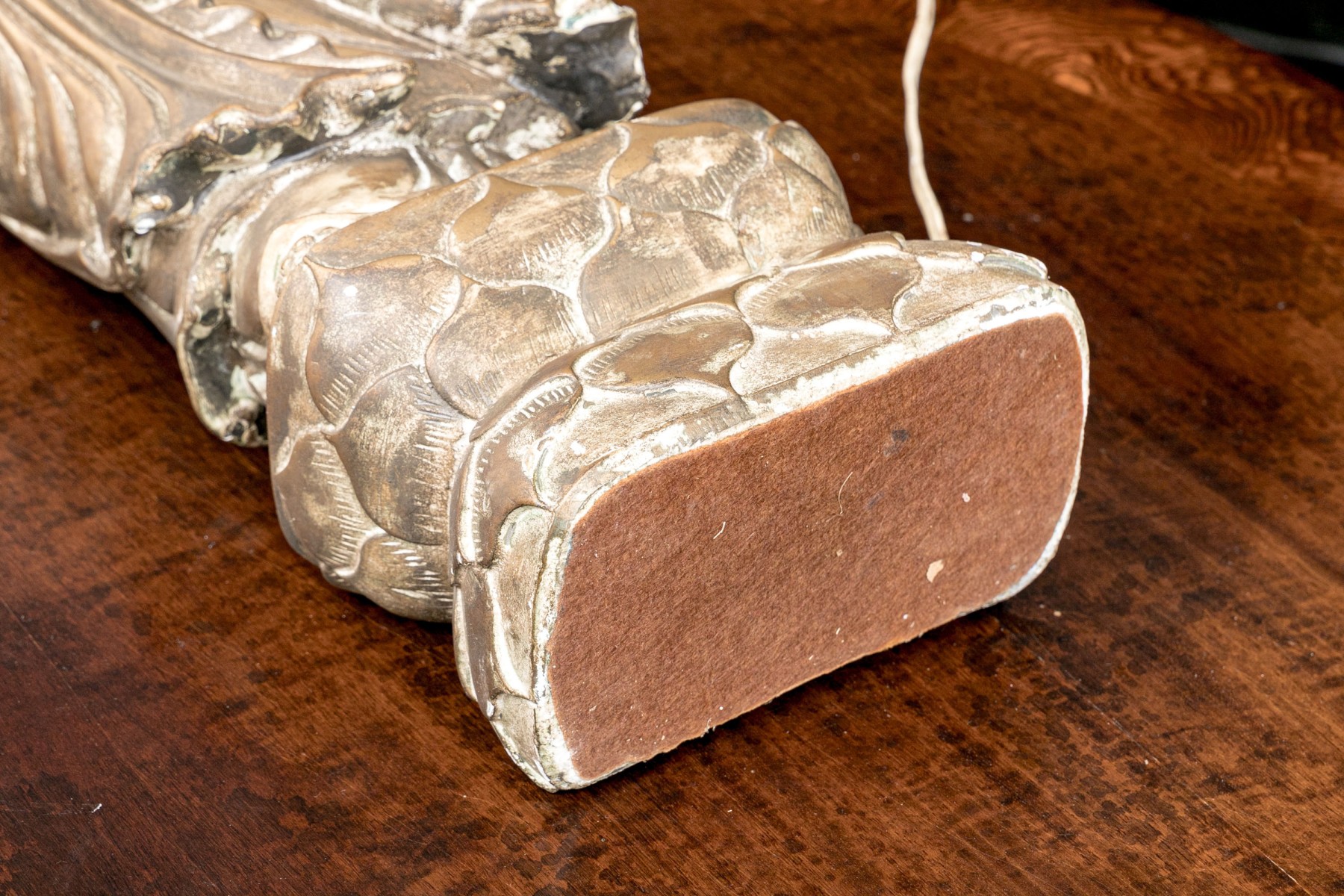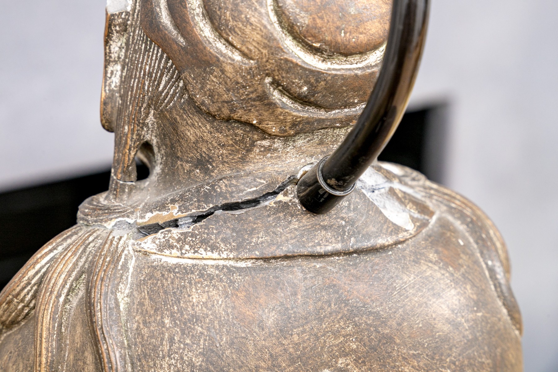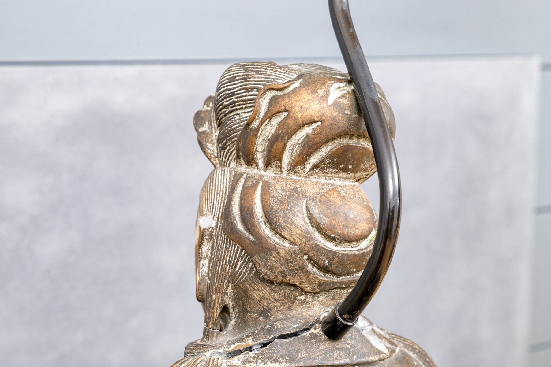 There is a break and loss to the back of the neck and wear to the finish. No harp, lamp shade or finial are present.
