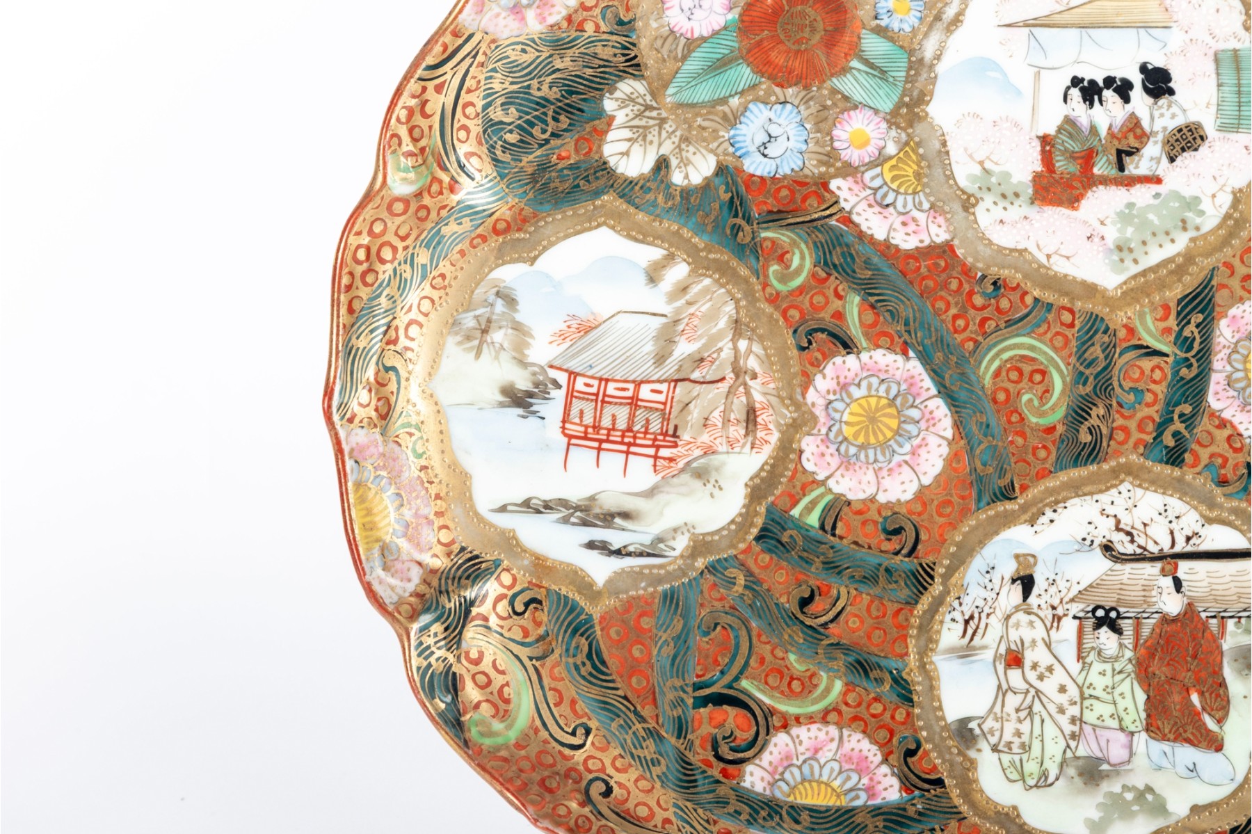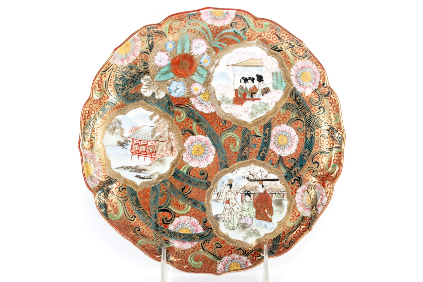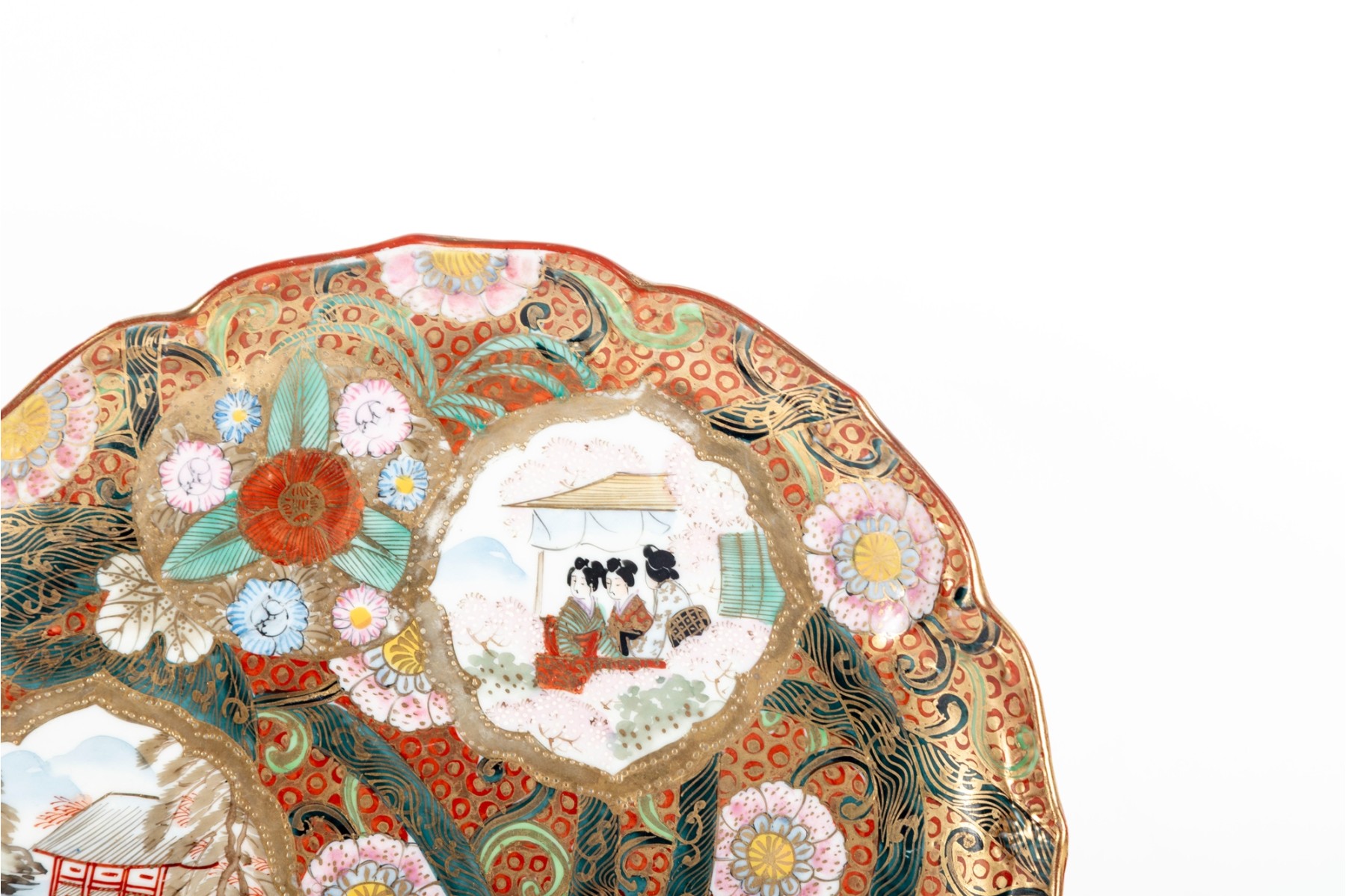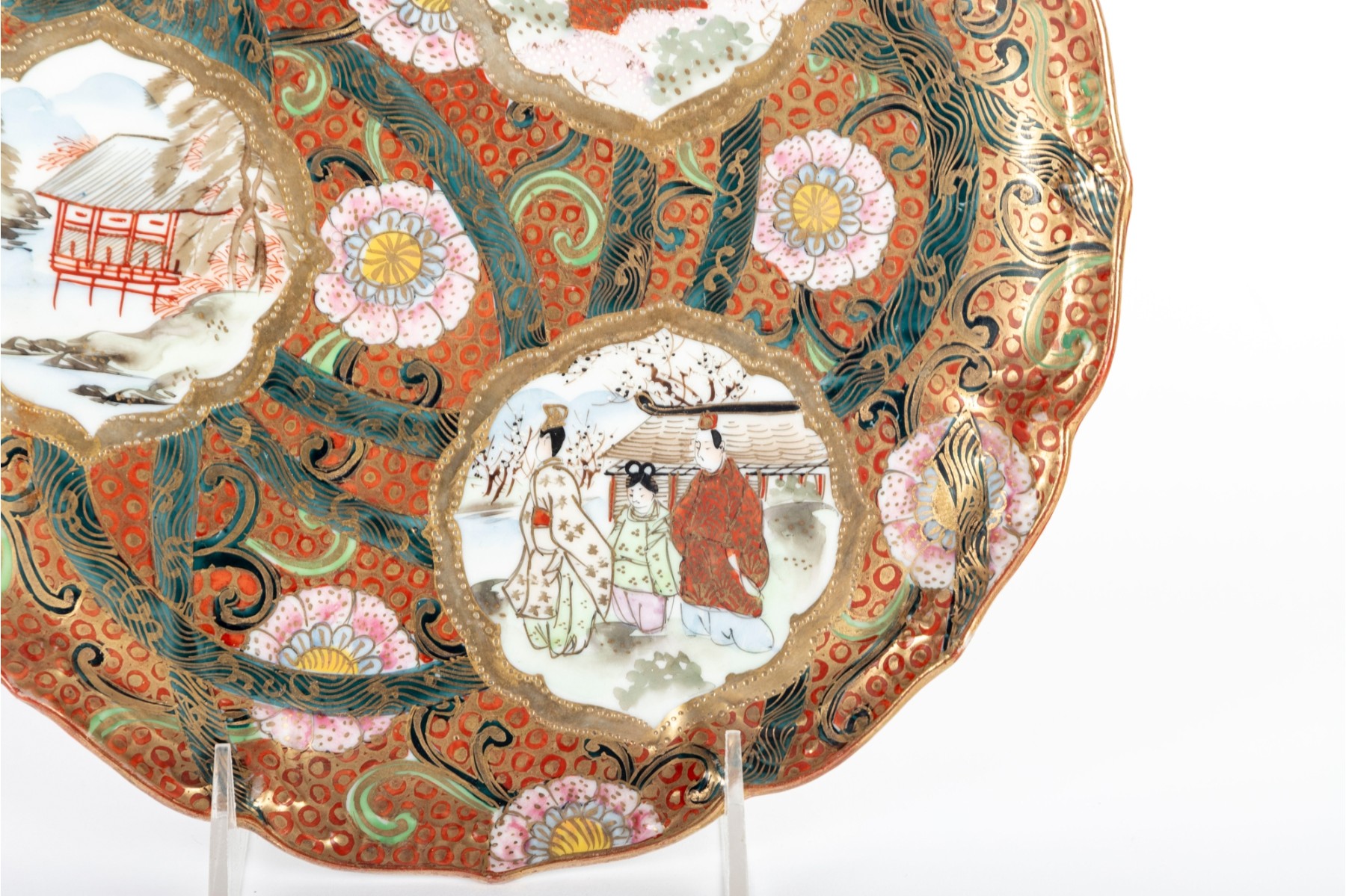 Ornate scalloped-edge Nippon ceramic plate, richly hand-painted with floral patterns and three scenic vignettes depicting landscapes and figures accented in gold and vibrant enamels.