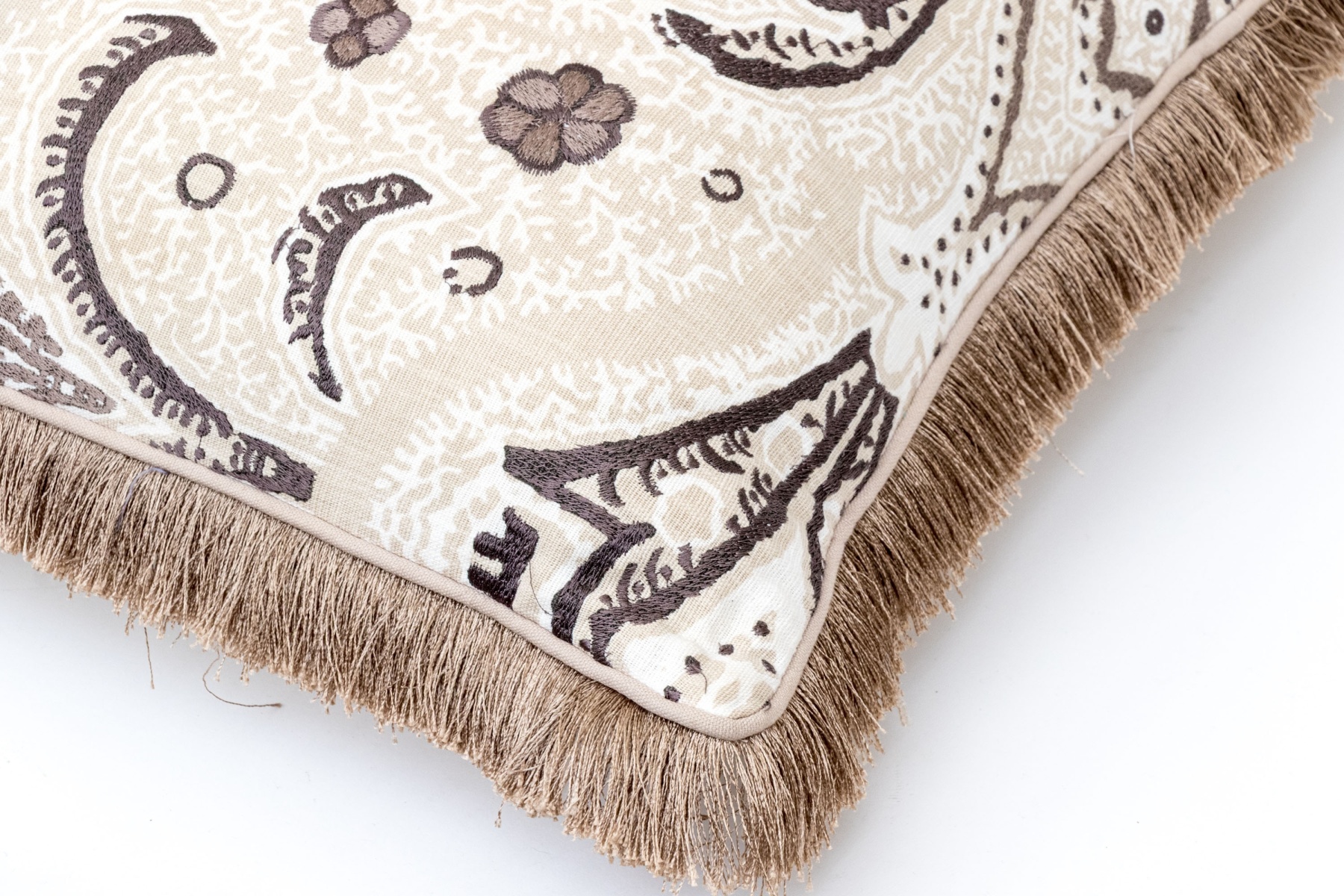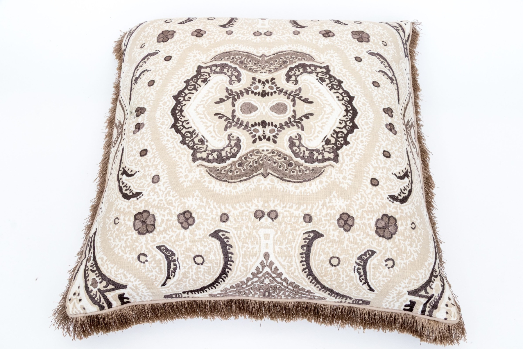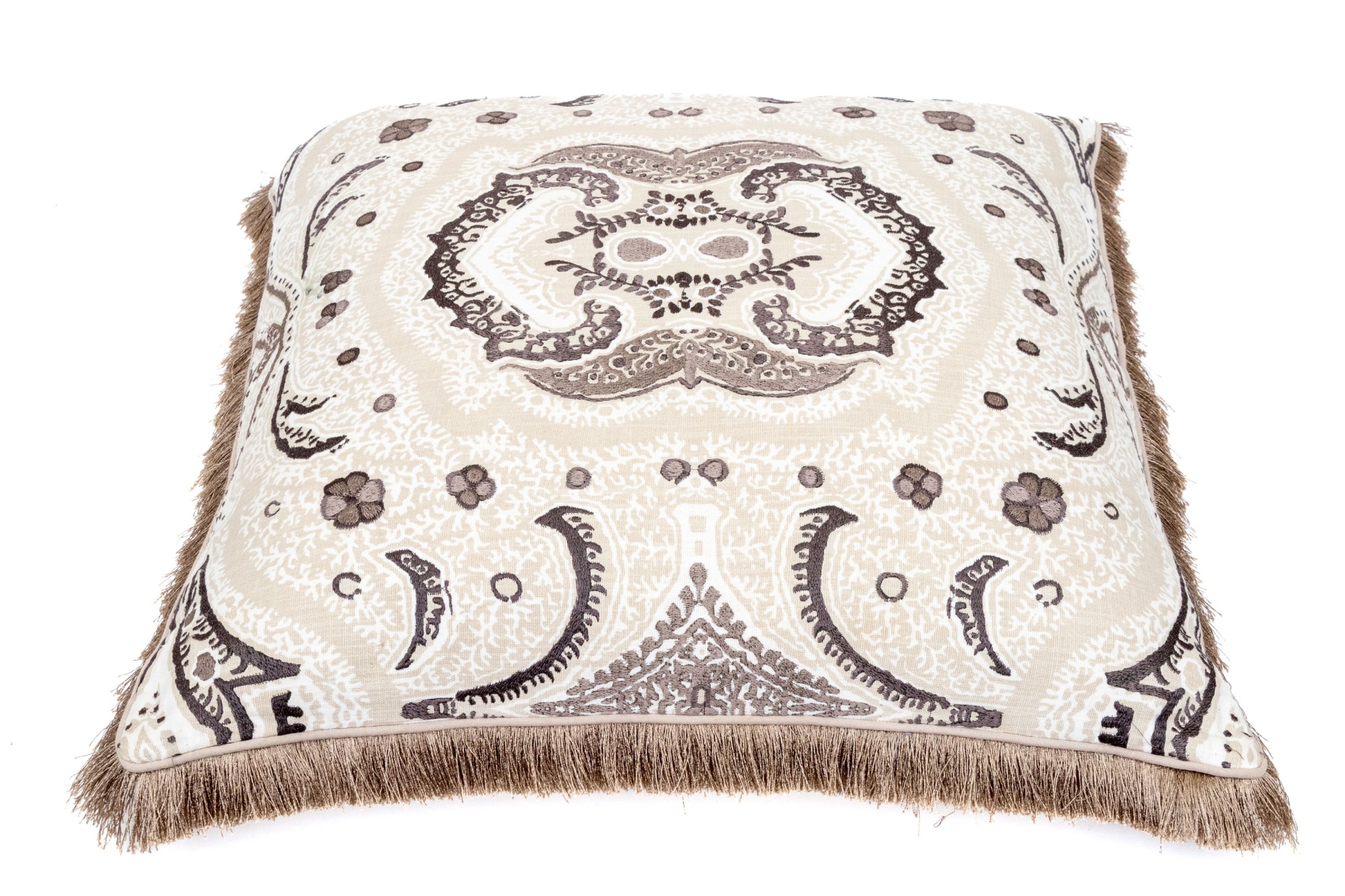 A fabulous Kim Seybert Living oversized accent pillow designed with a striking arabesque pattern in versatile neutrals including cream, mauve-brown, and gray. The front sports a shapely petaled medallion at the center, surrounded by fine, pale vining texture contrasted by striking swooping arms and smaller florals in darker hues. Finished with a fringe border and a white backing.