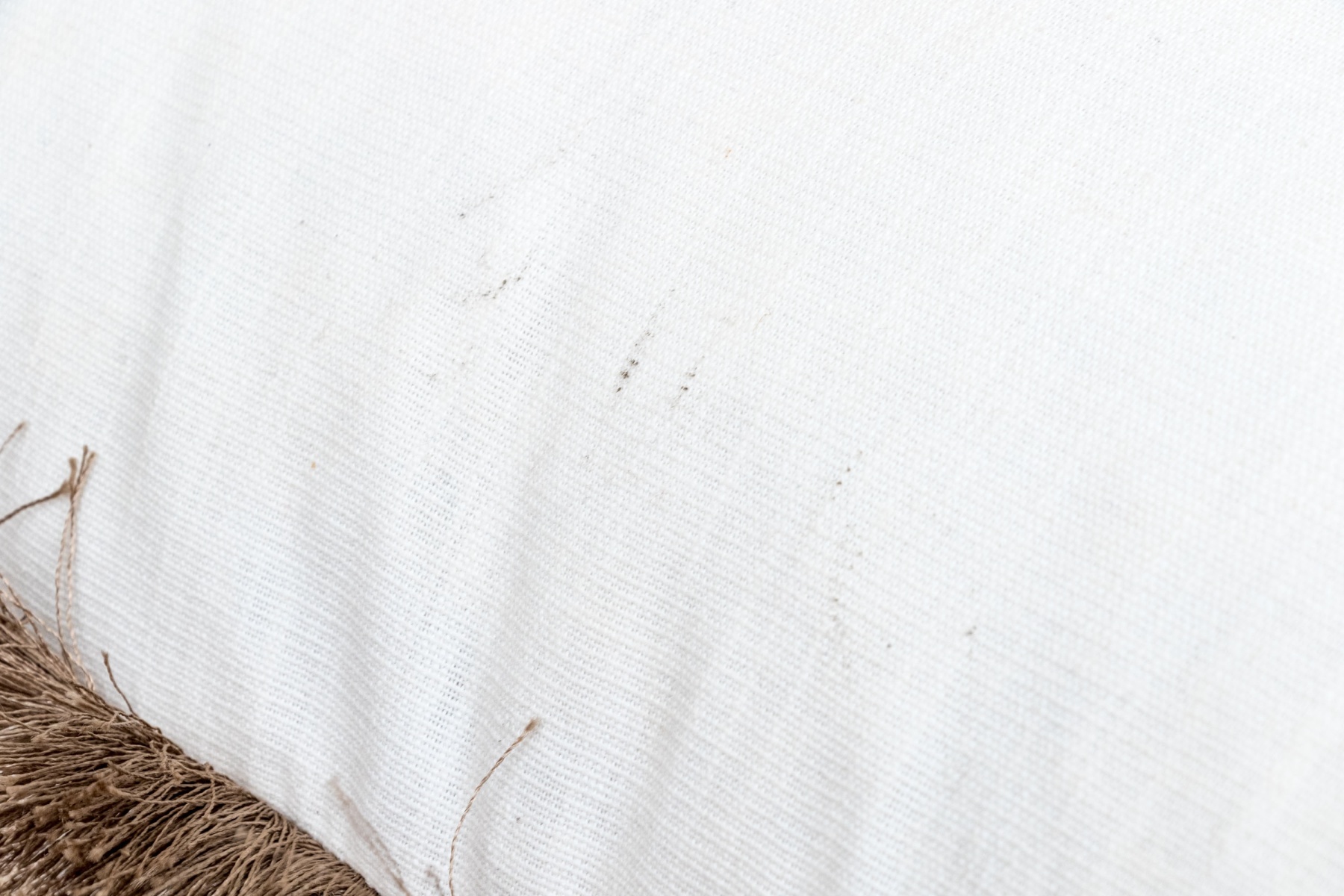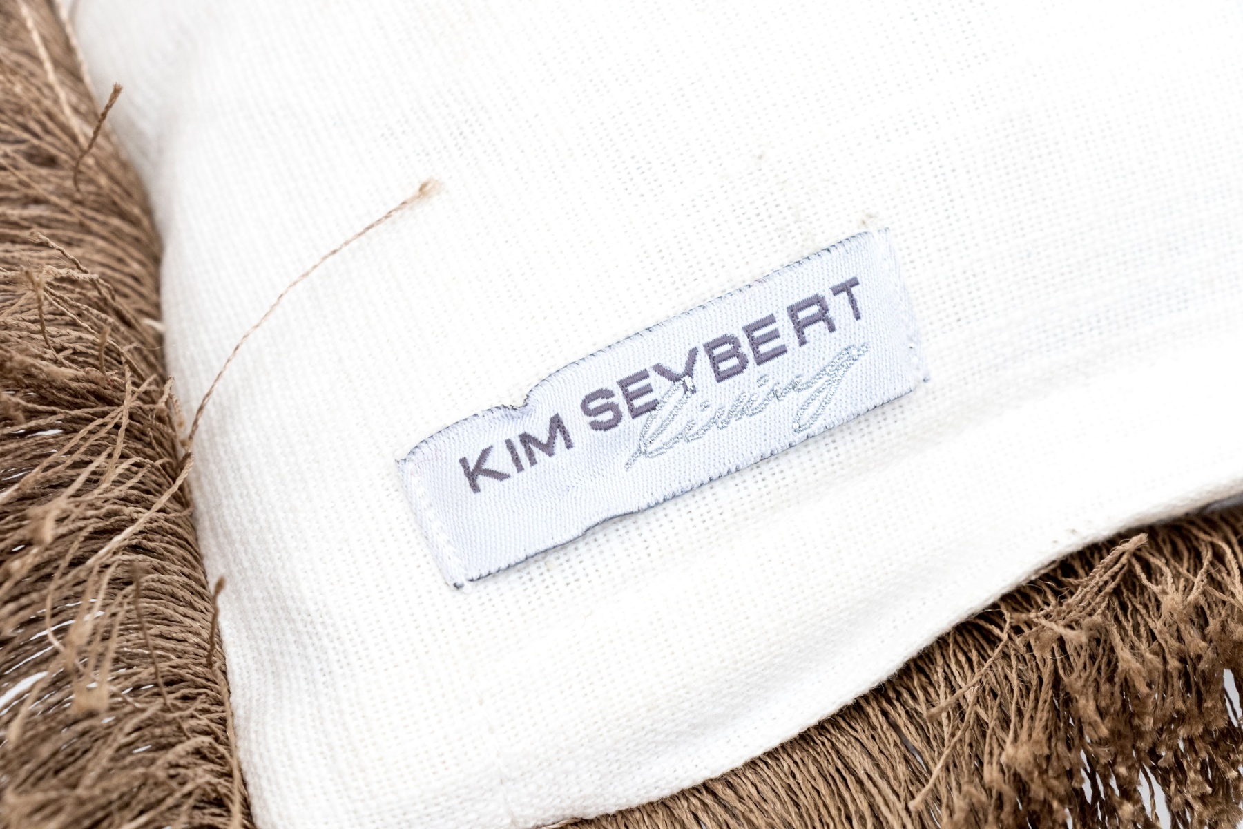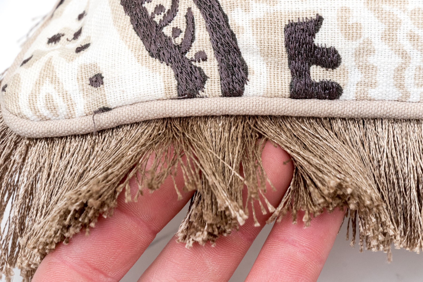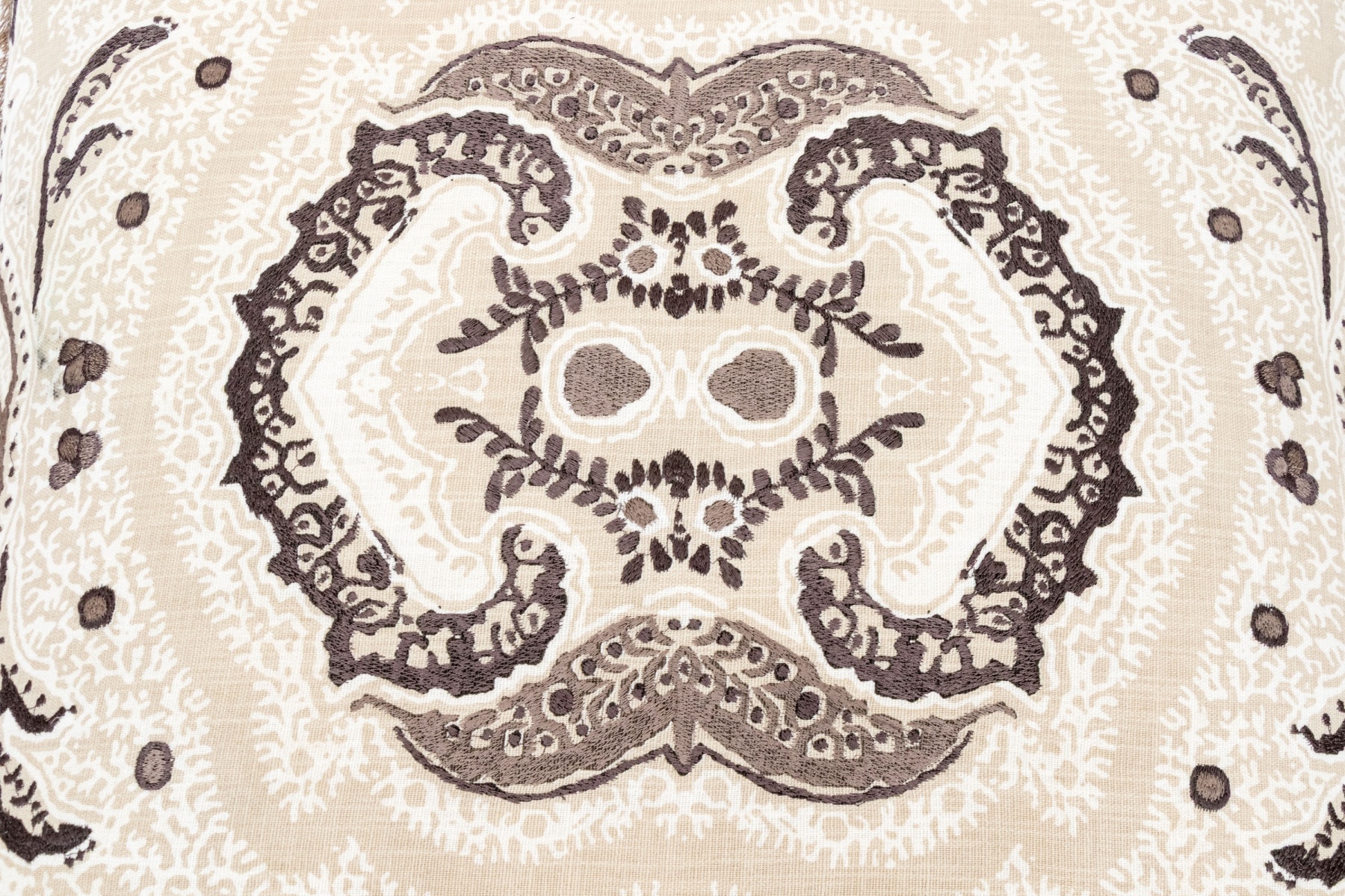 A fabulous Kim Seybert Living oversized accent pillow designed with a striking arabesque pattern in versatile neutrals including cream, mauve-brown, and gray. The front sports a shapely petaled medallion at the center, surrounded by fine, pale vining texture contrasted by striking swooping arms and smaller florals in darker hues. Finished with a fringe border and a white backing.