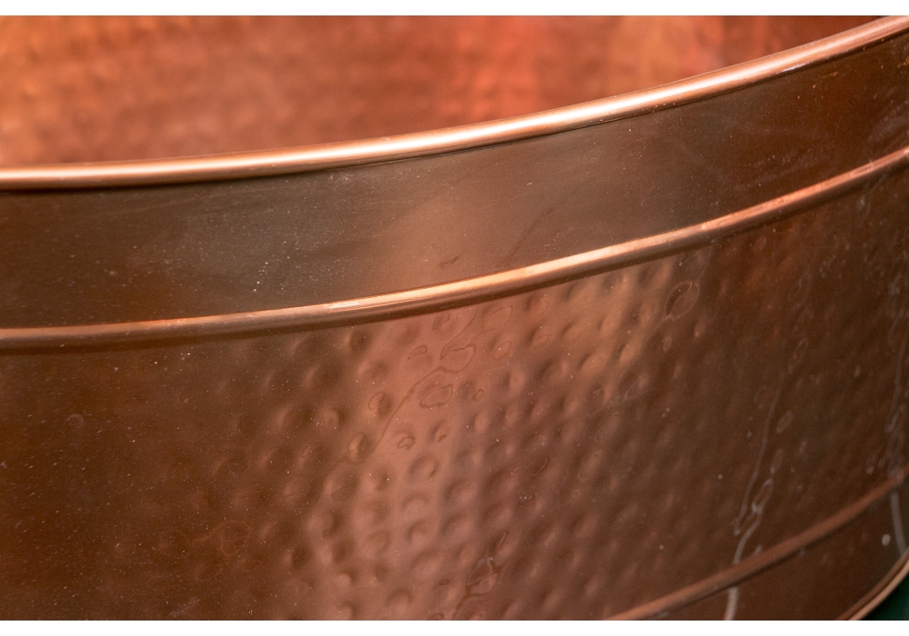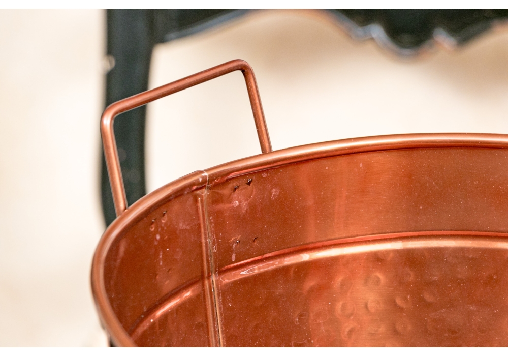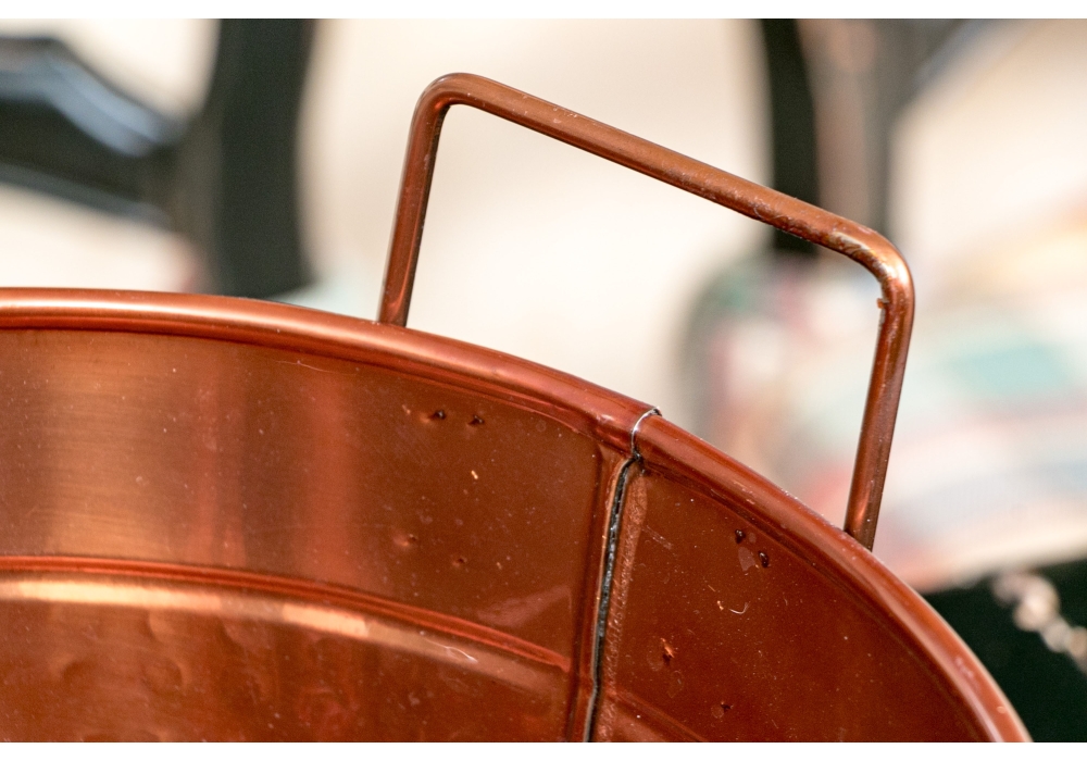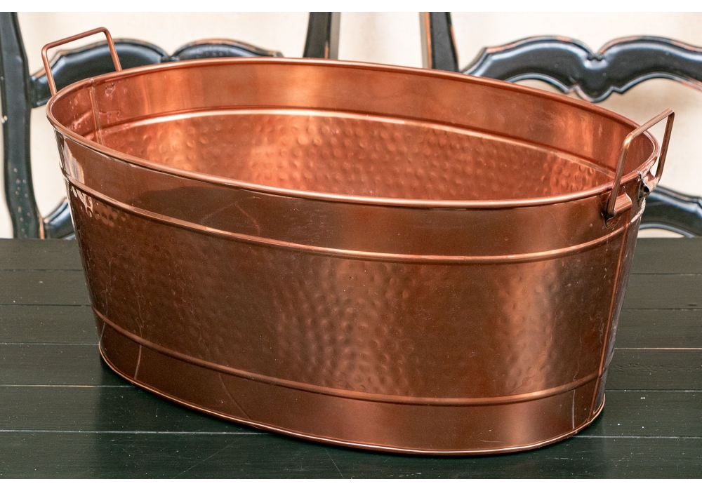 A copper tone lacquered metal oval bin with twin handles and hammered sides.