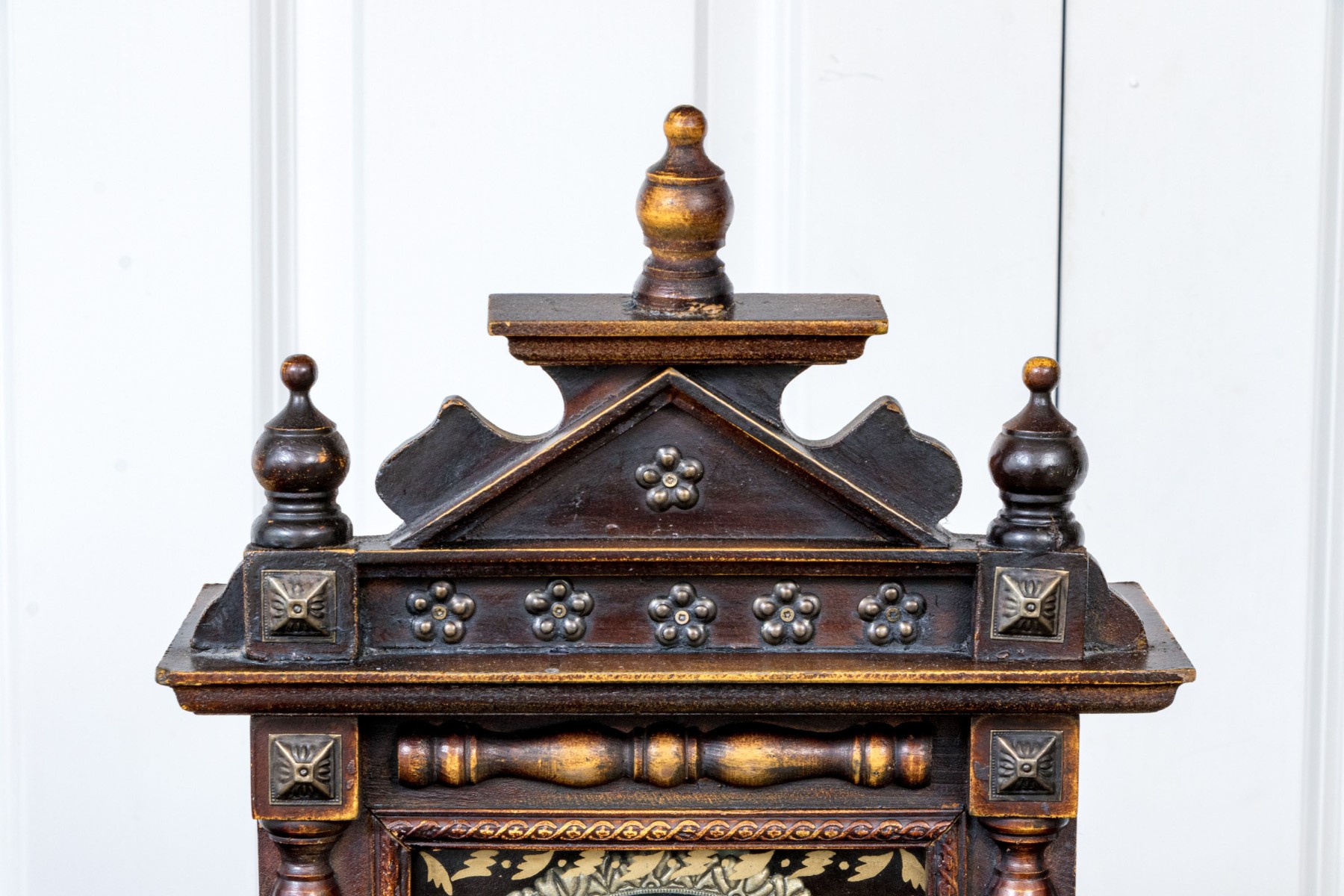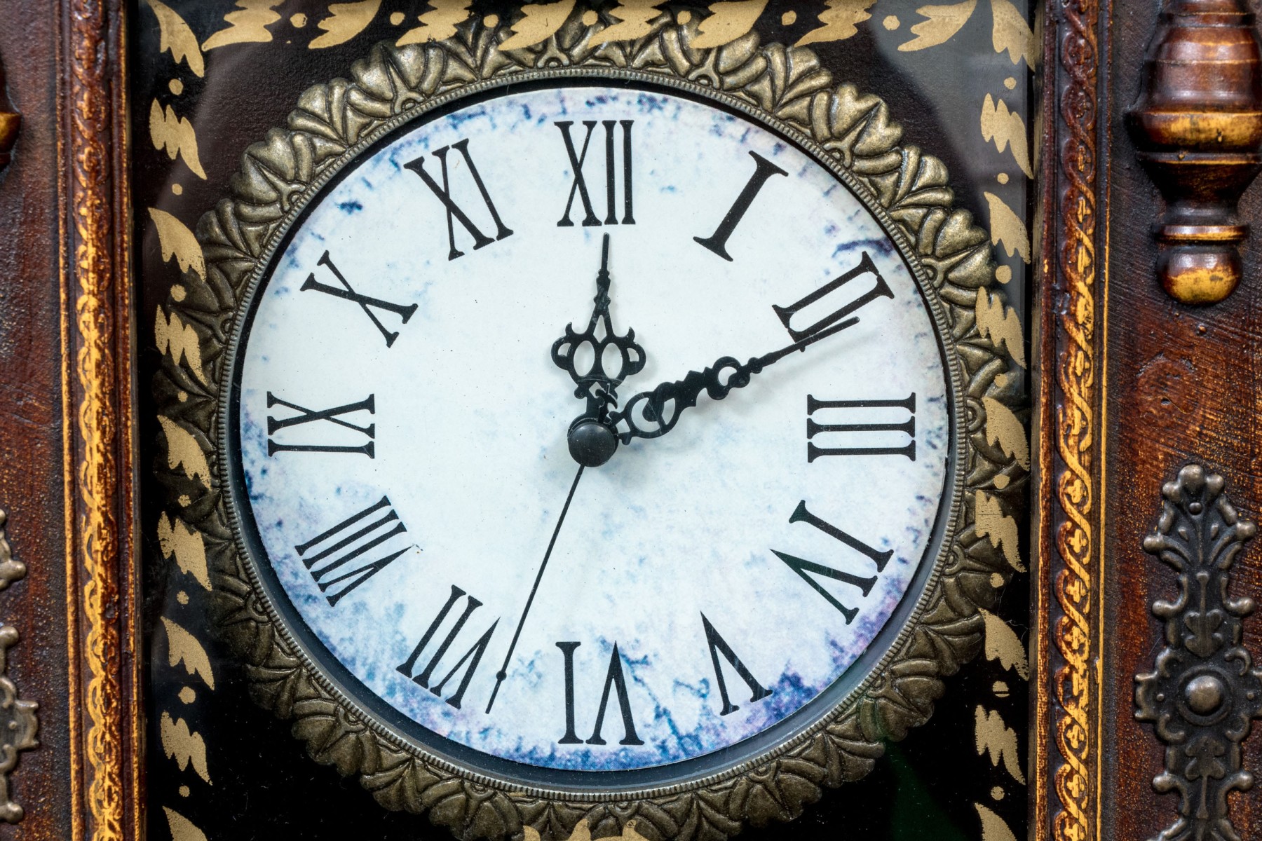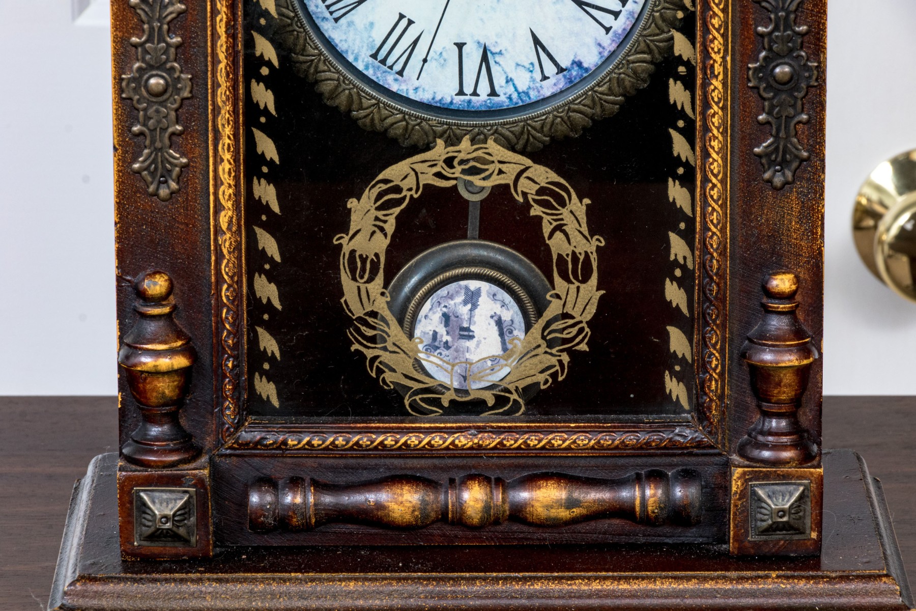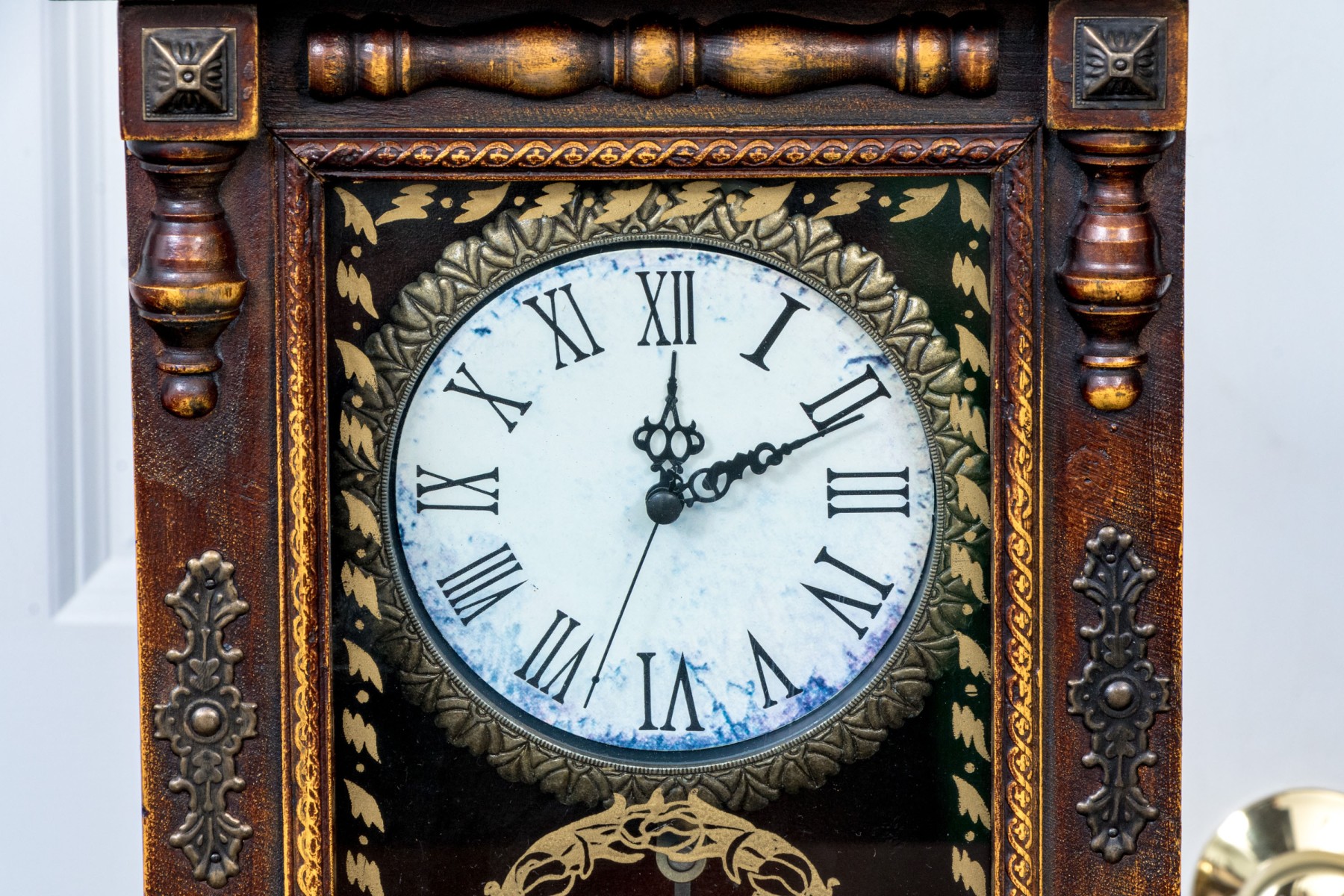The glass panel presents the clock face with Roman numerals on a white hued face with pendulum below.