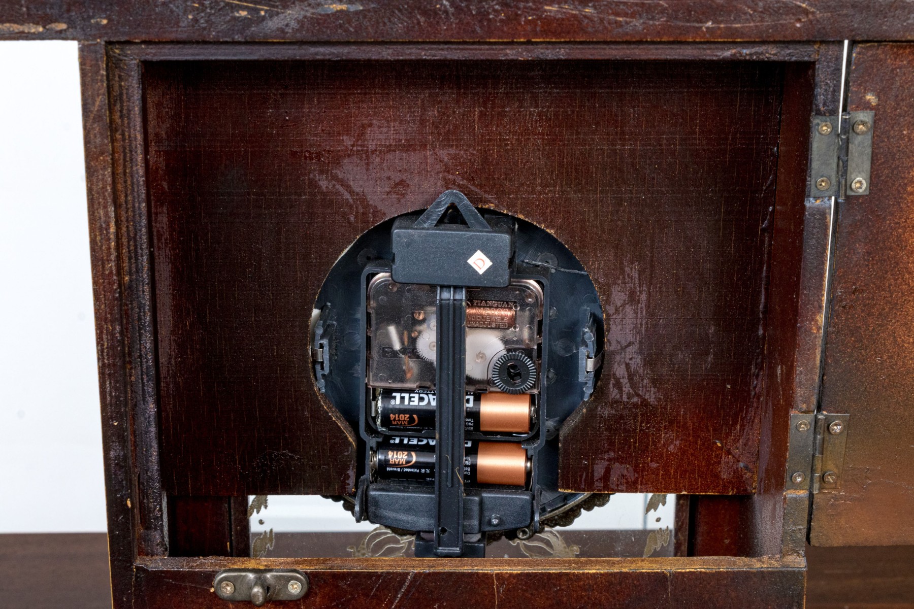 The clock face is pushed back a bit with wear to the white face. For refurbishment. Please review the photos as they are part of the condition report.