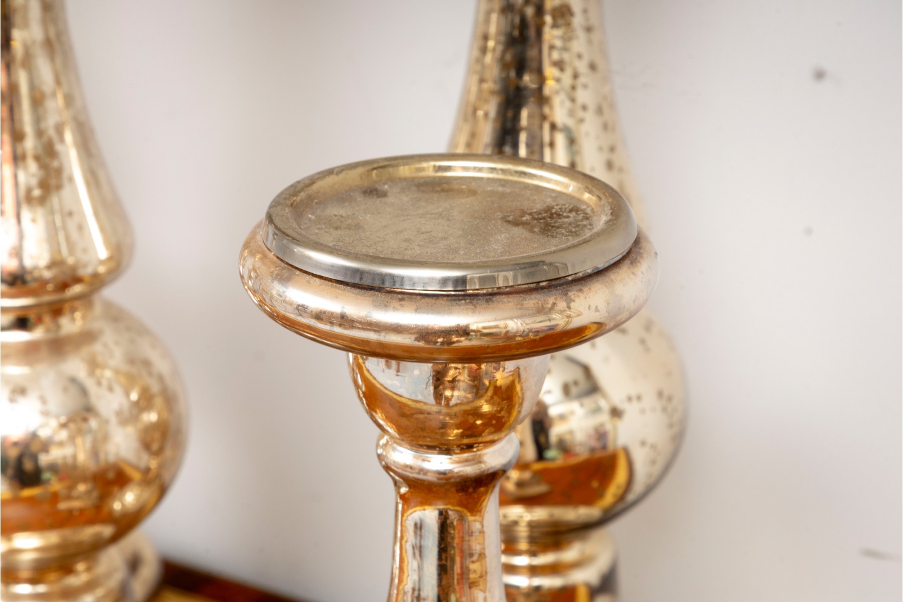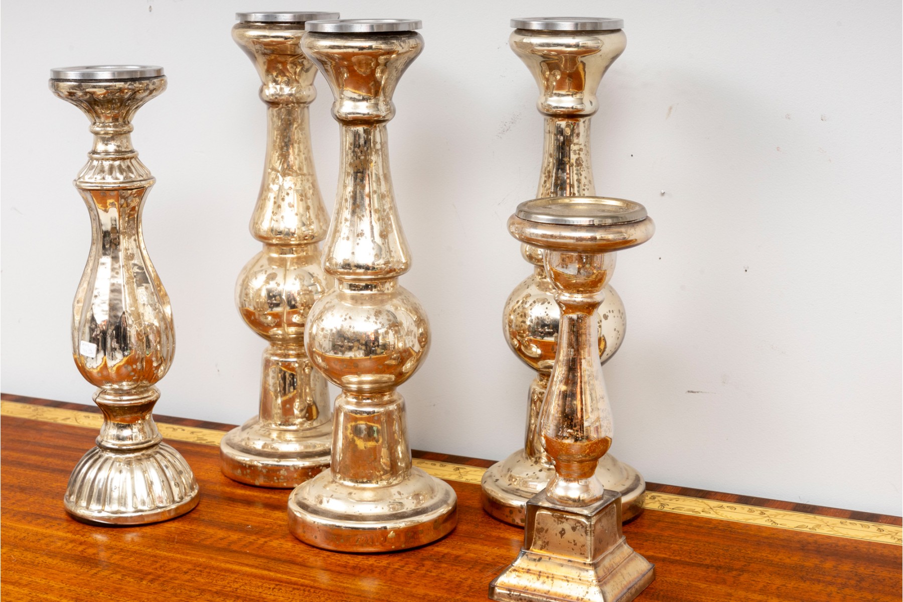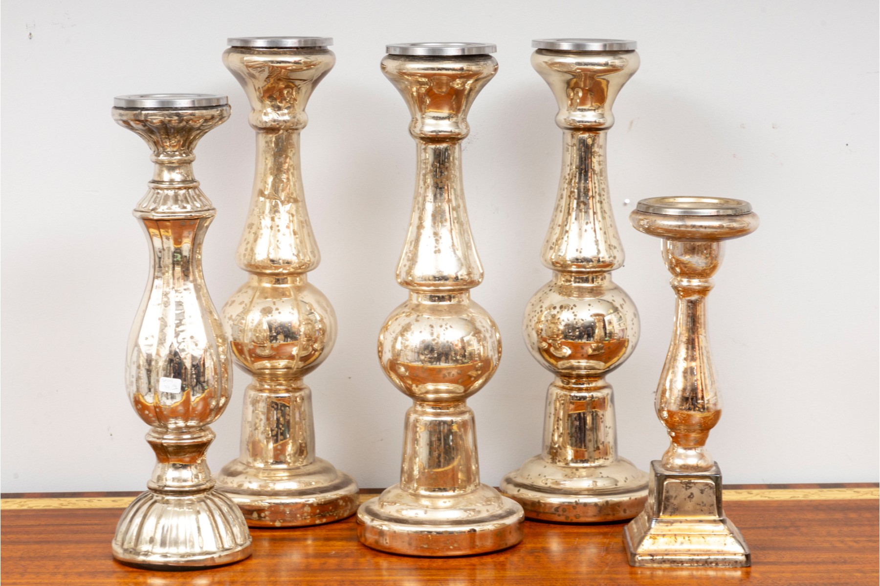 A set of large, mercury glass baluster style candlestick holders for decorative use. Five in total.