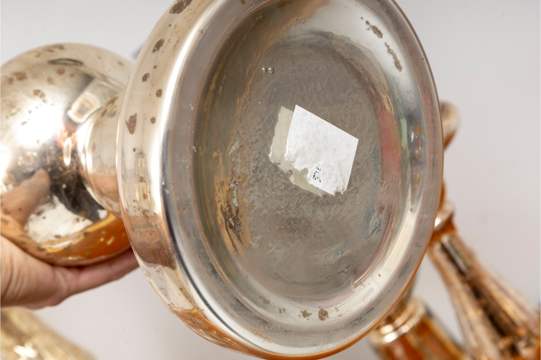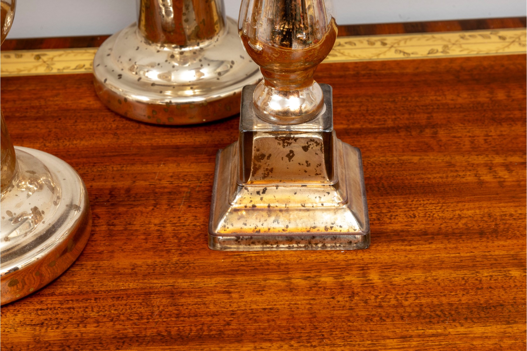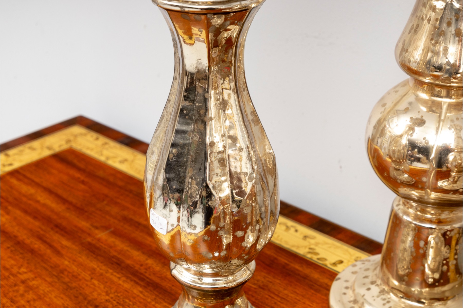 A set of large, mercury glass baluster style candlestick holders for decorative use. Five in total.