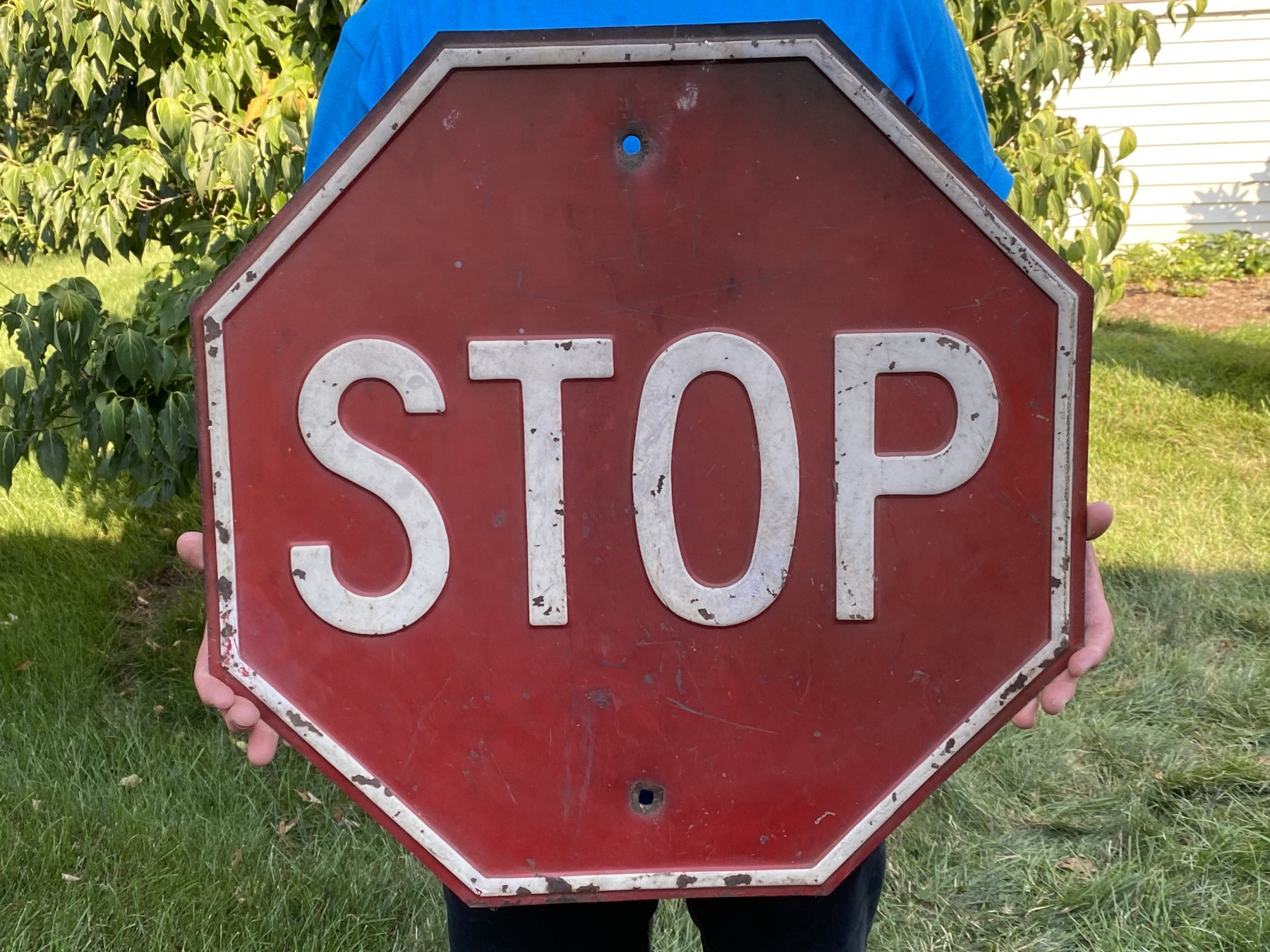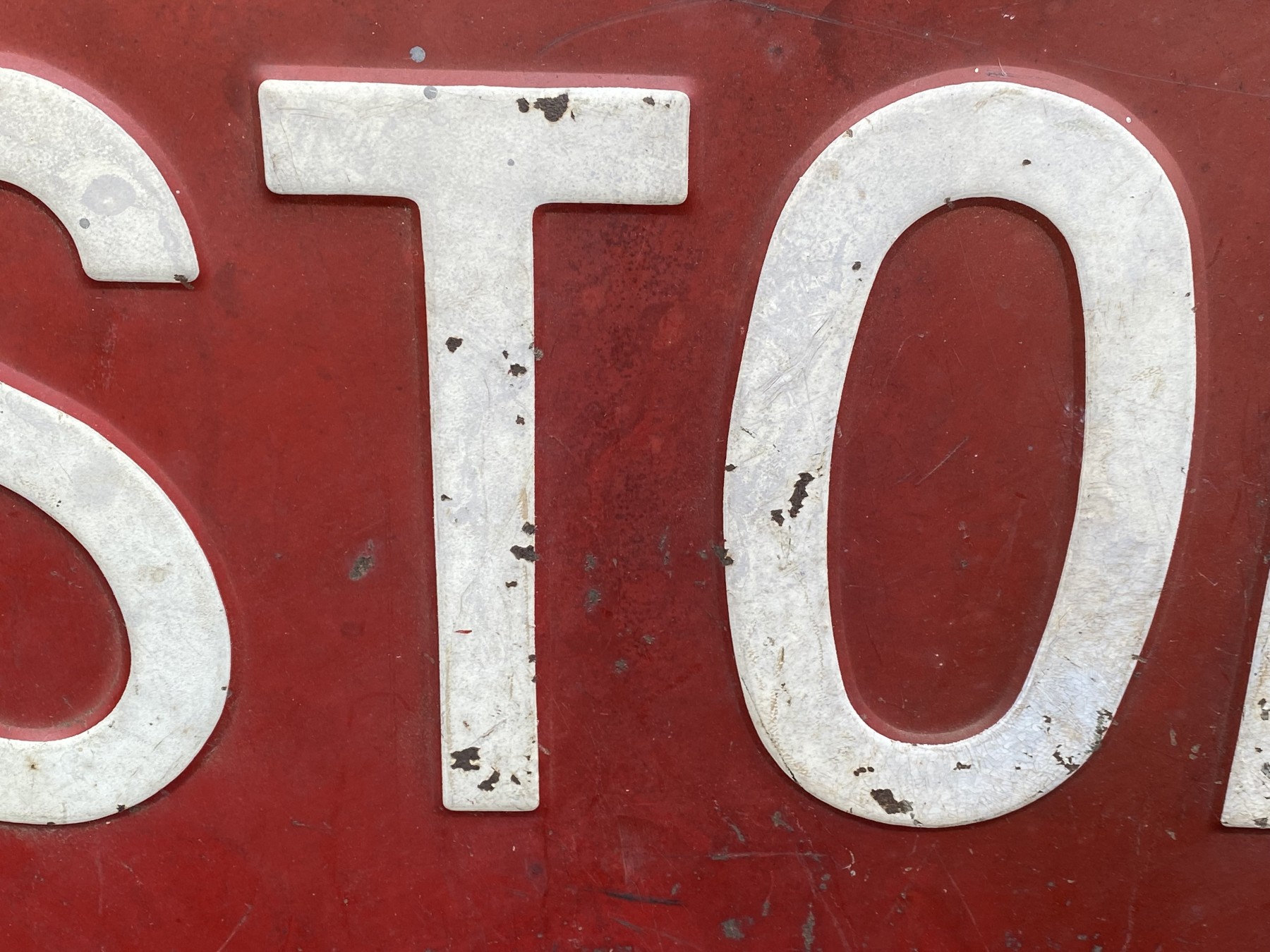 A highly decorative classic red and white metal stop sign with two holes for mounting and a lovely rustic appearance.