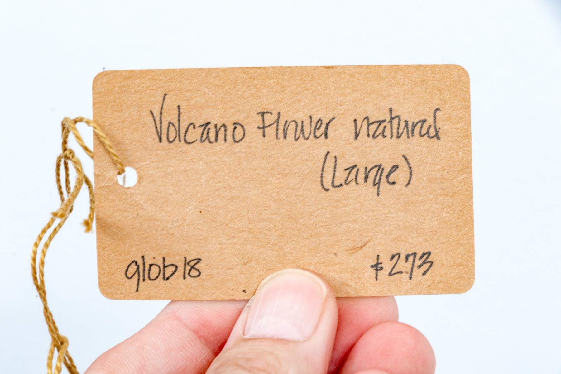 With a label from Cocobolo Interior Inc. describing the item as a "Volcano Flower Natural (Large)" with an original purchase price of $273.