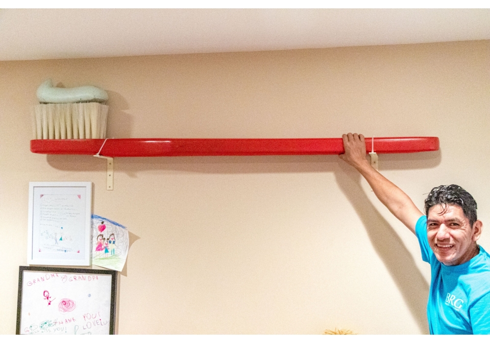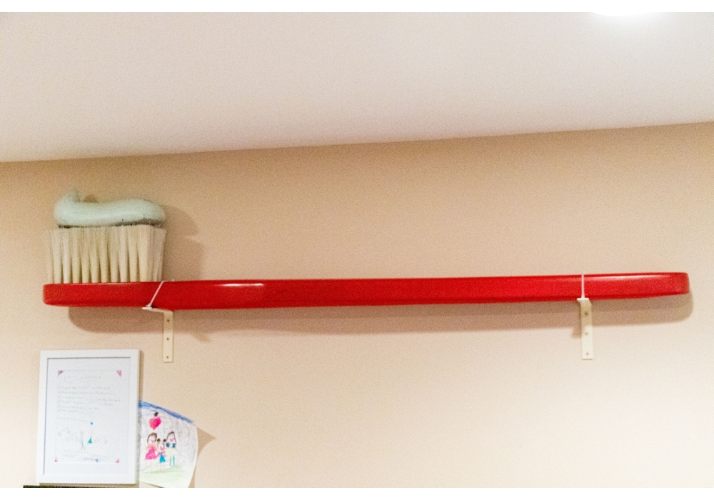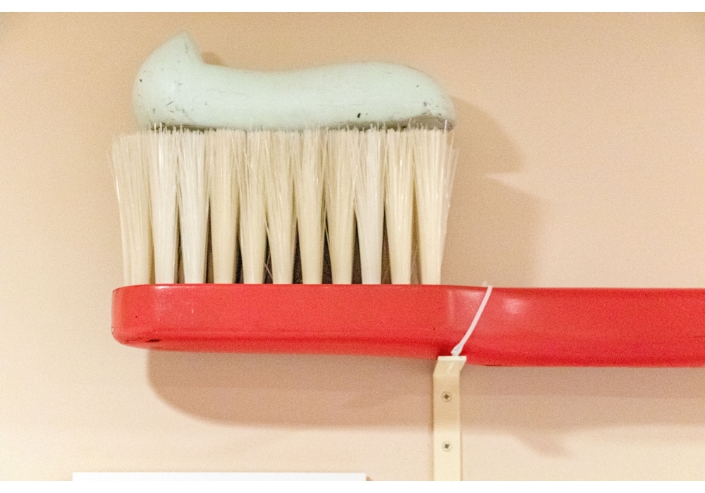An oversized decorative model of a toothbrush with toothpaste perfect for adding a fun statement piece of wall decor.
