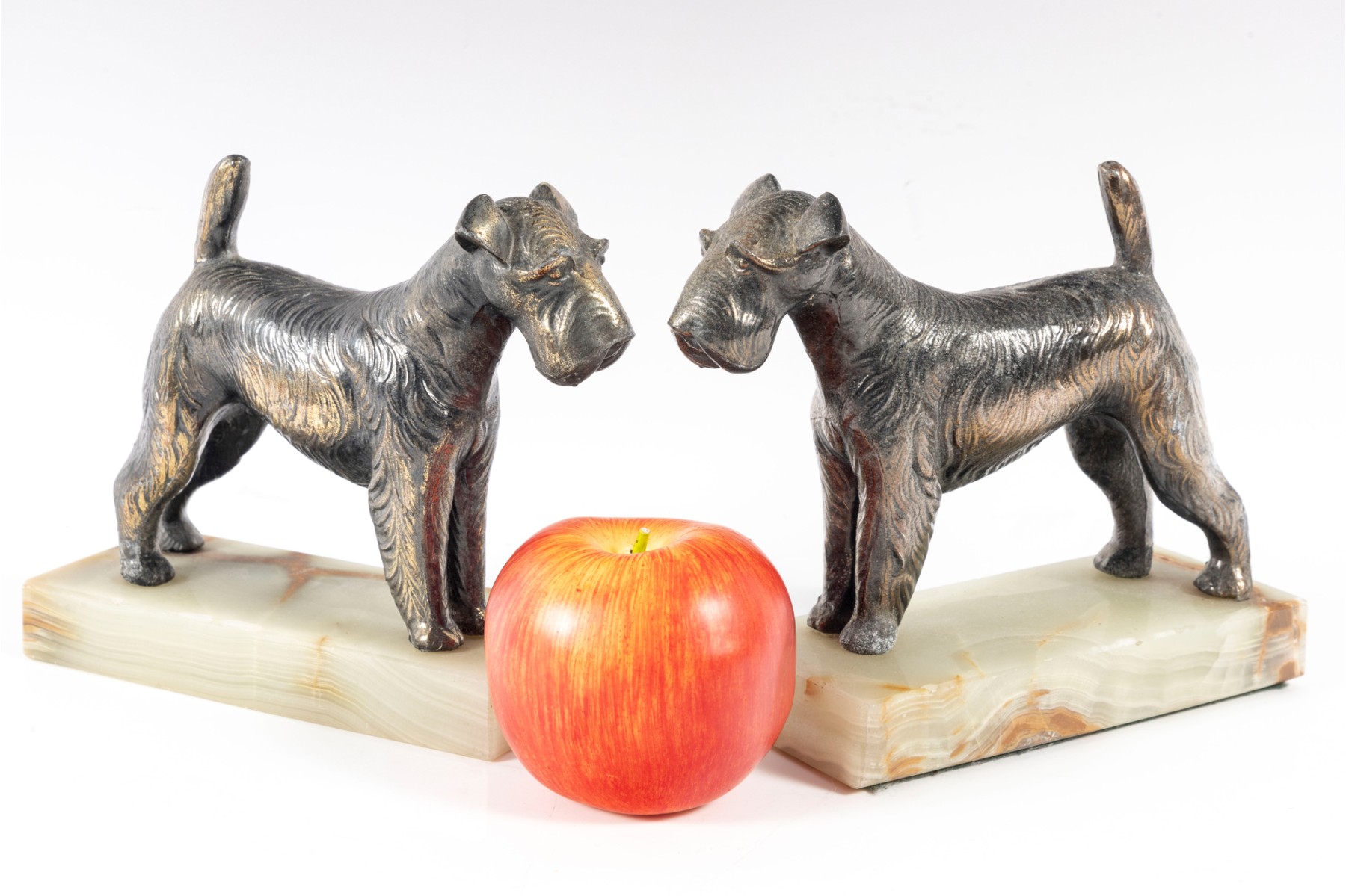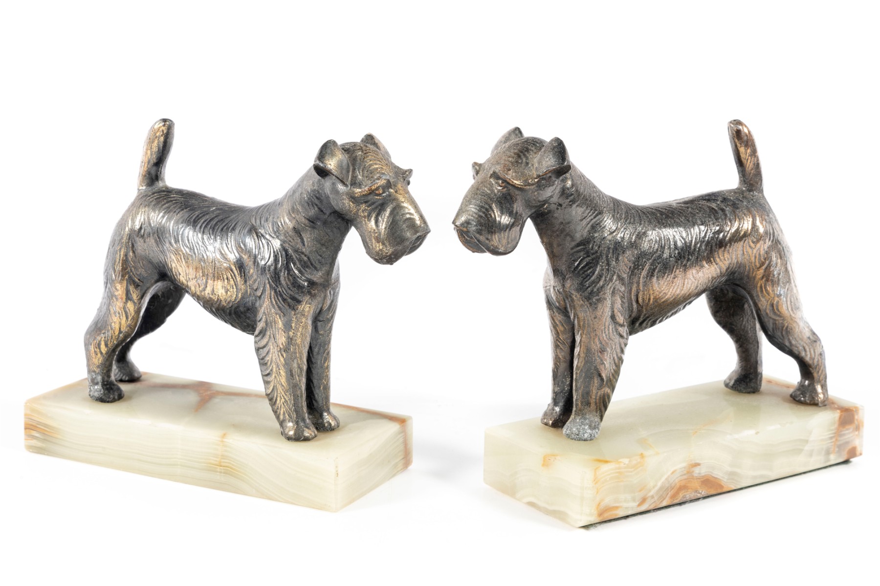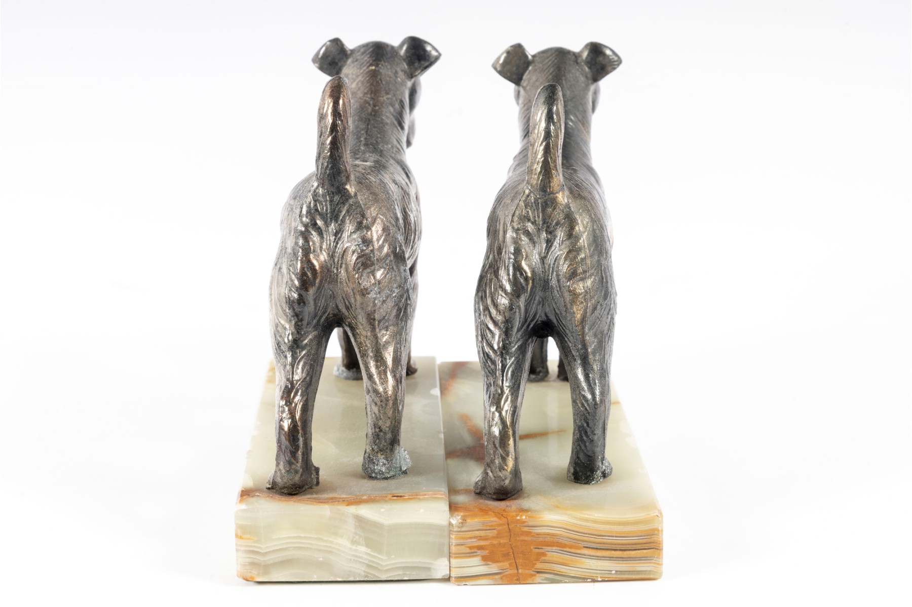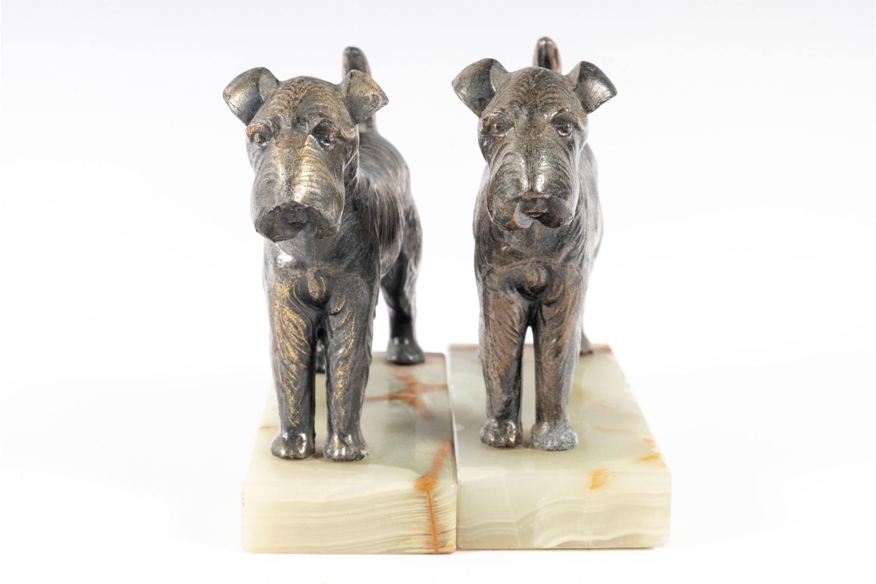 A pair of decorative brass Scottish Terrier dog sculptures mounted onto green onyx stone slabs.