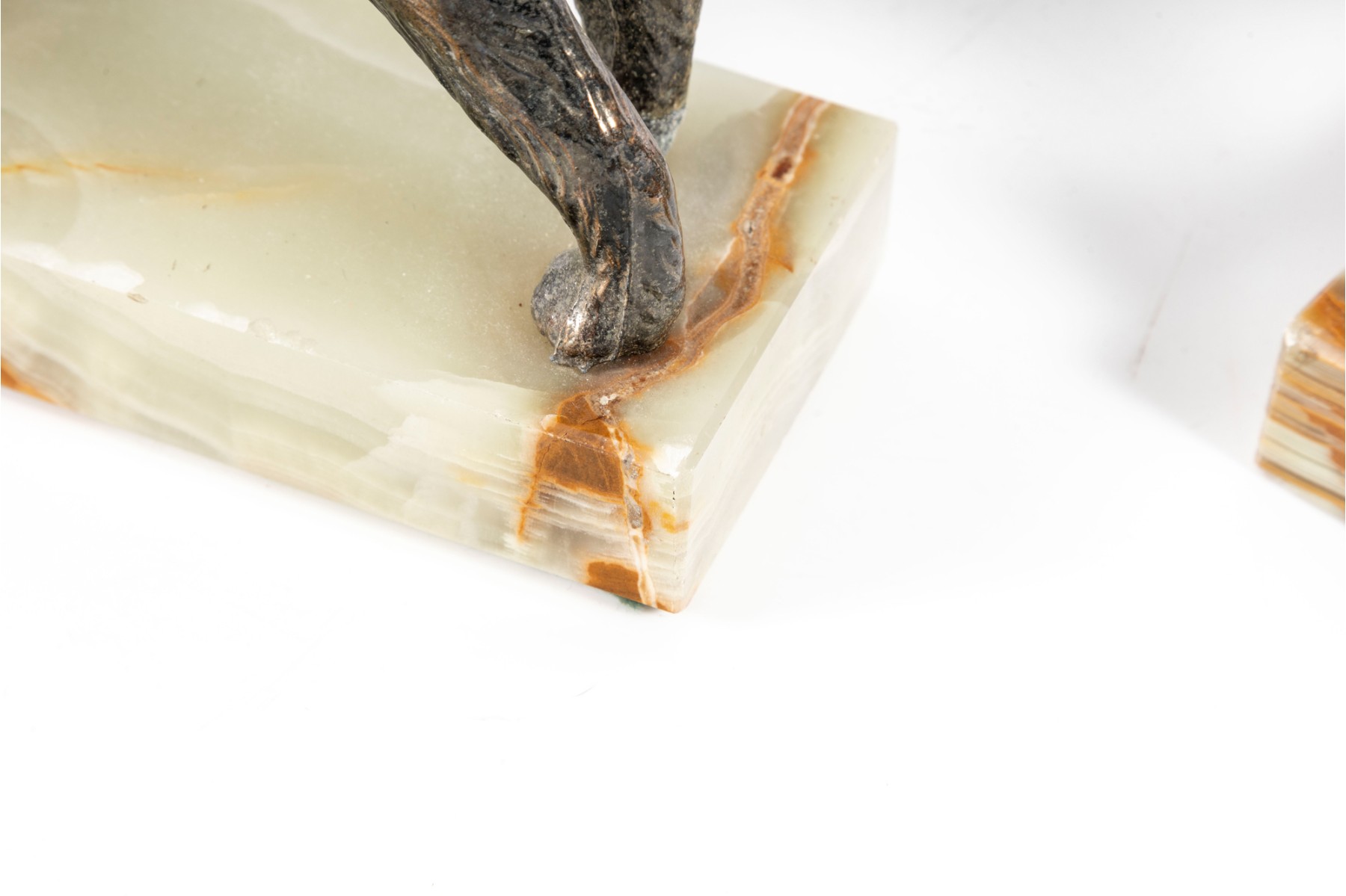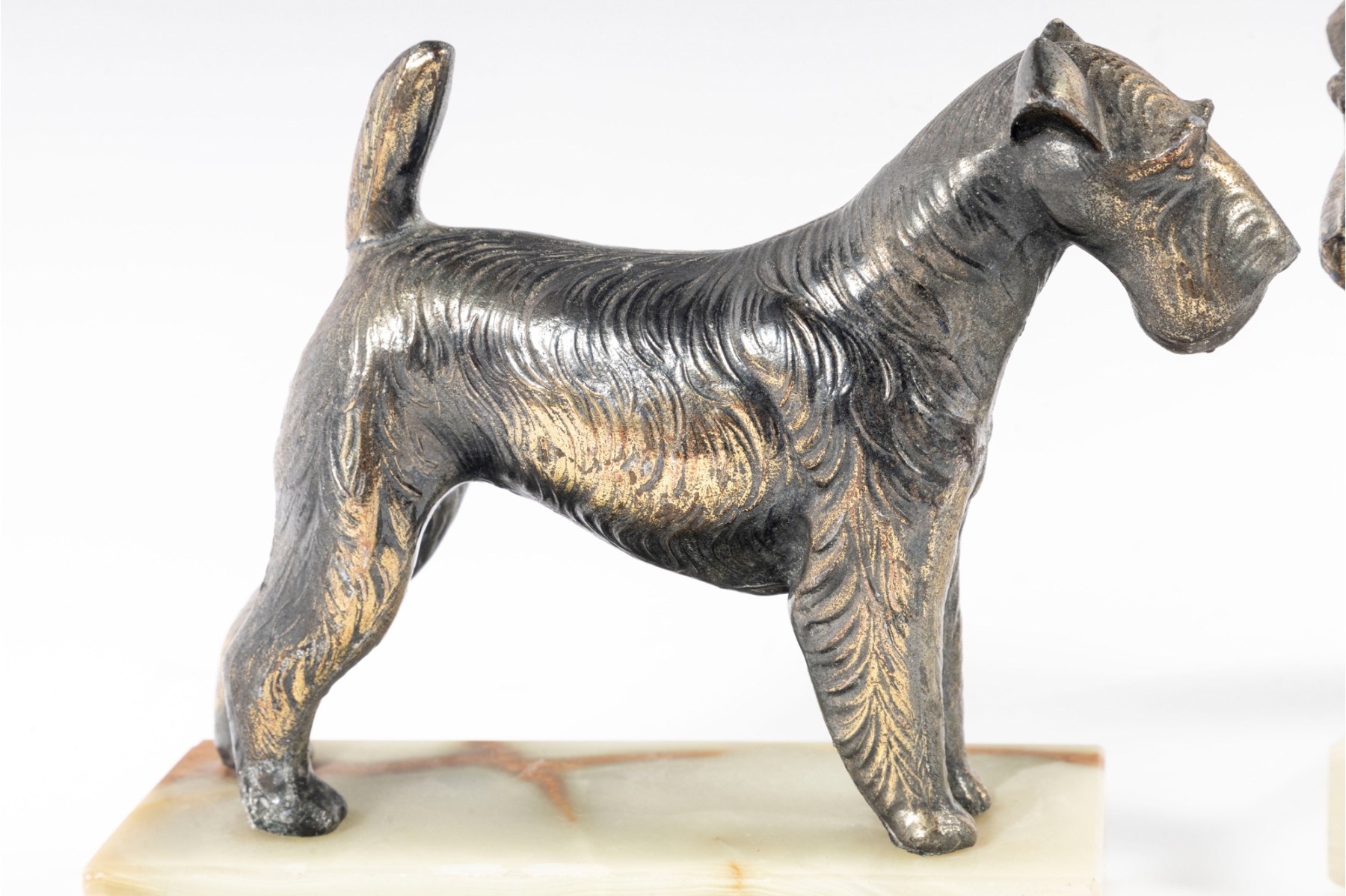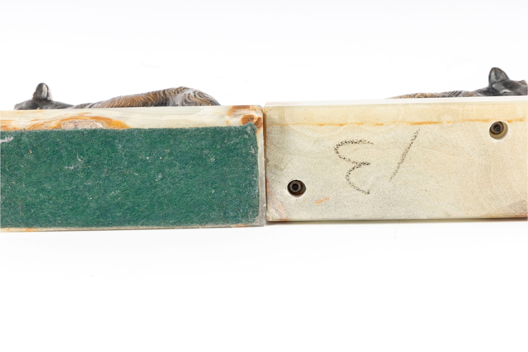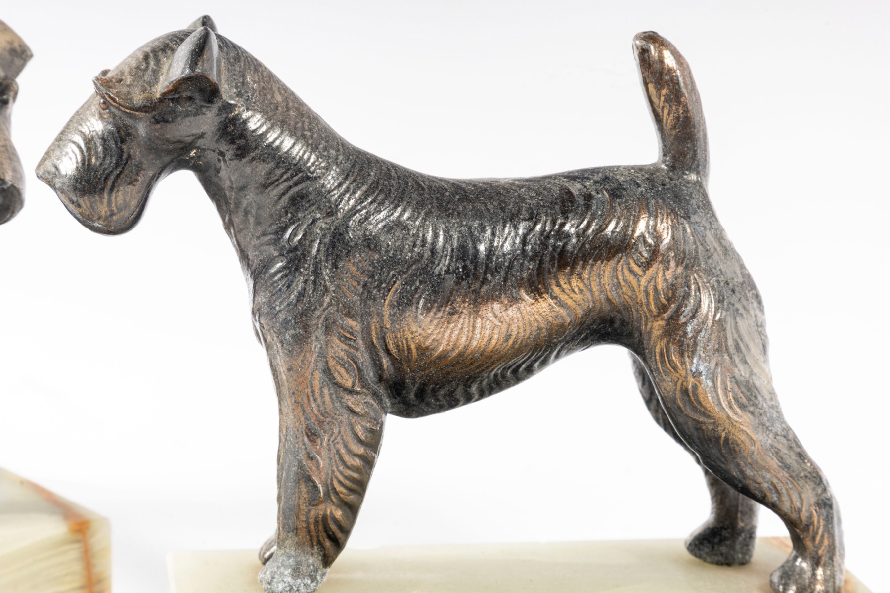 A pair of decorative brass Scottish Terrier dog sculptures mounted onto green onyx stone slabs.