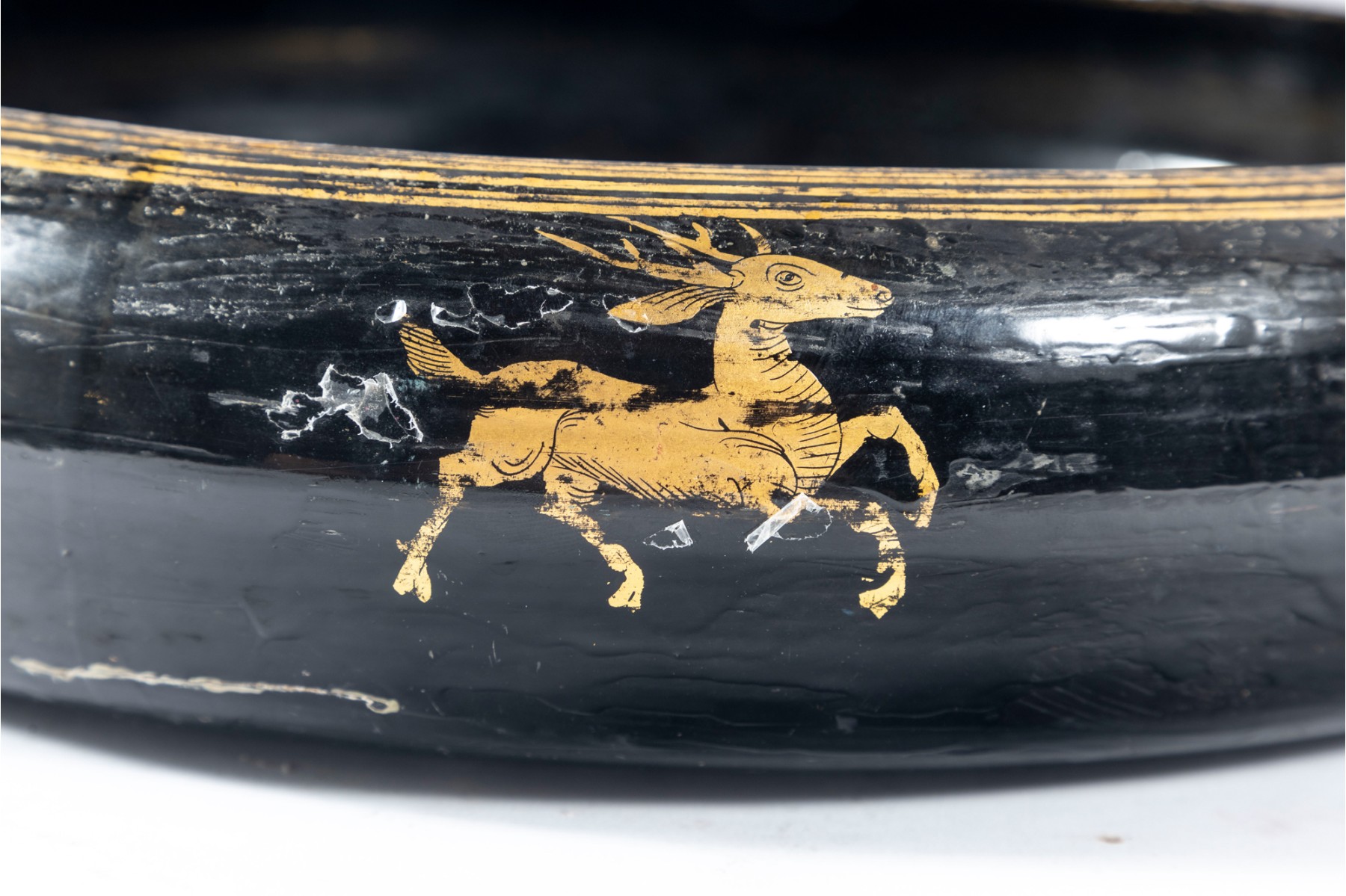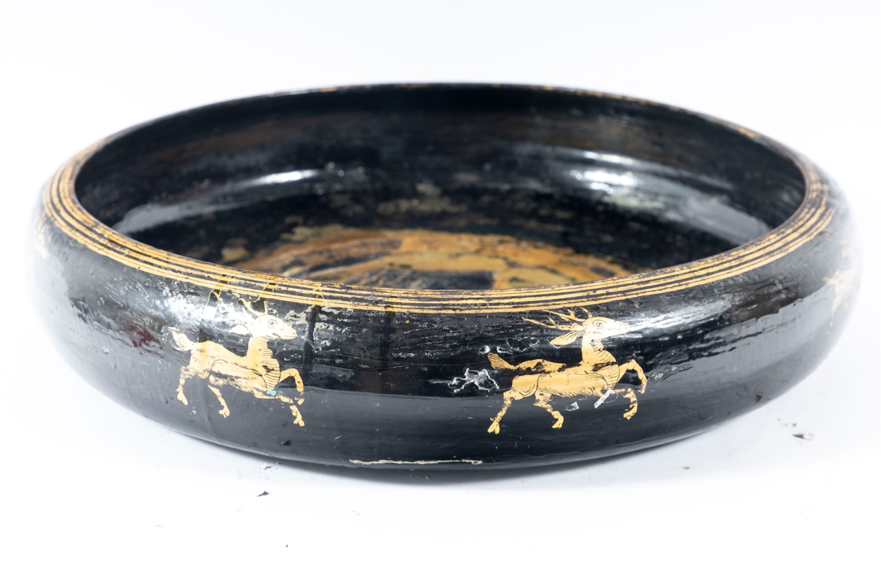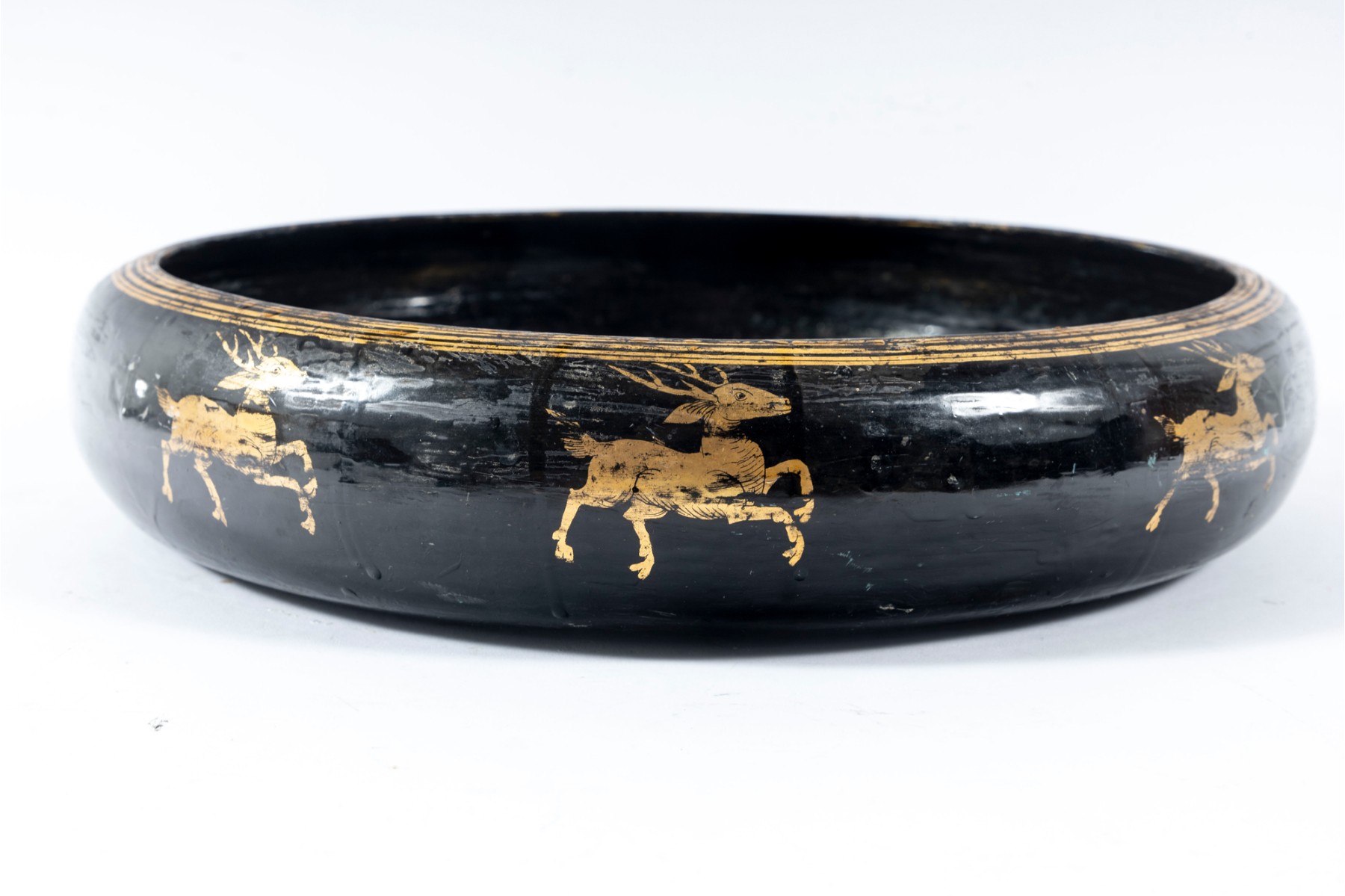 A black lacquered 14" wood bowl emblazoned with gilt details and deer motifs throughout.