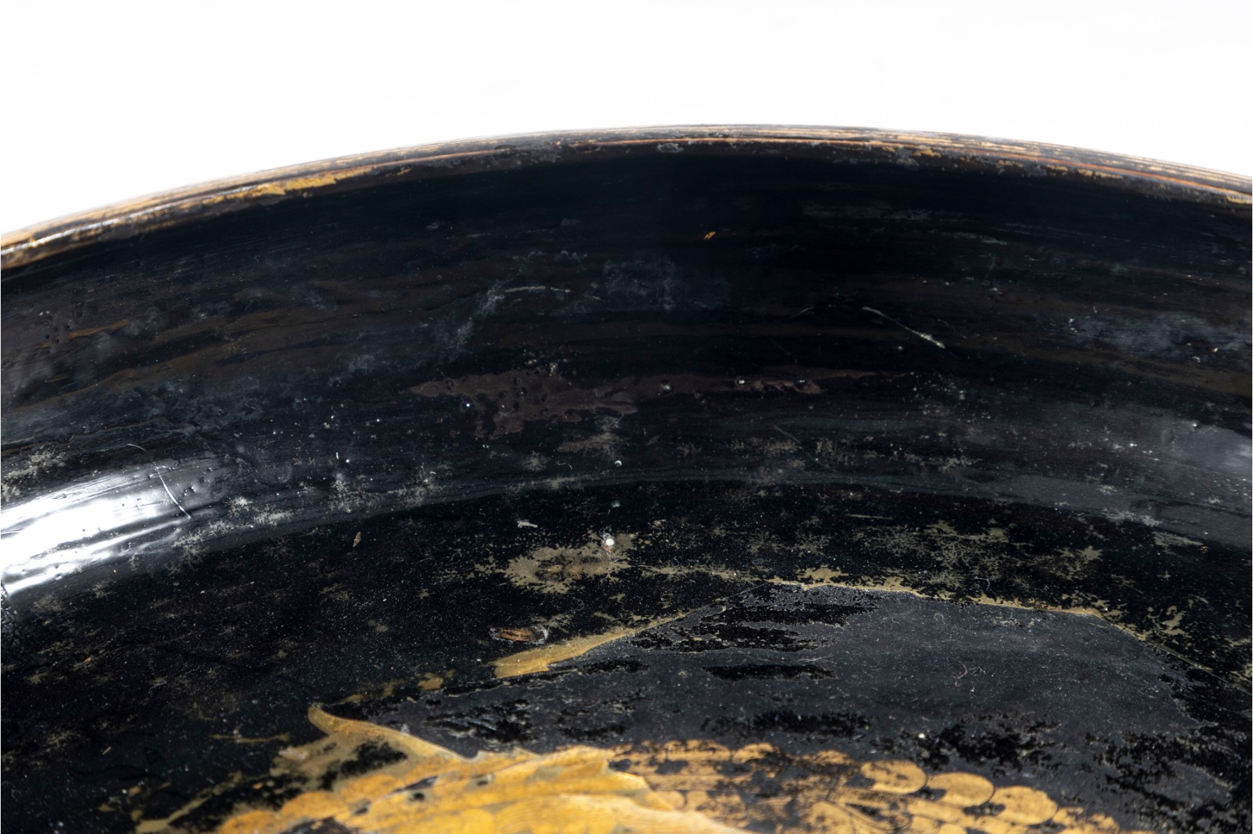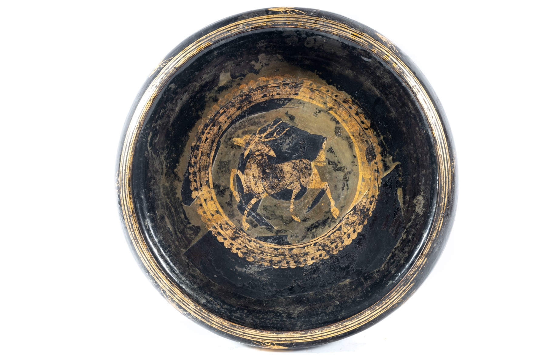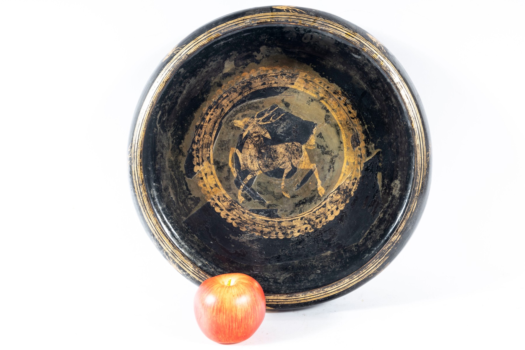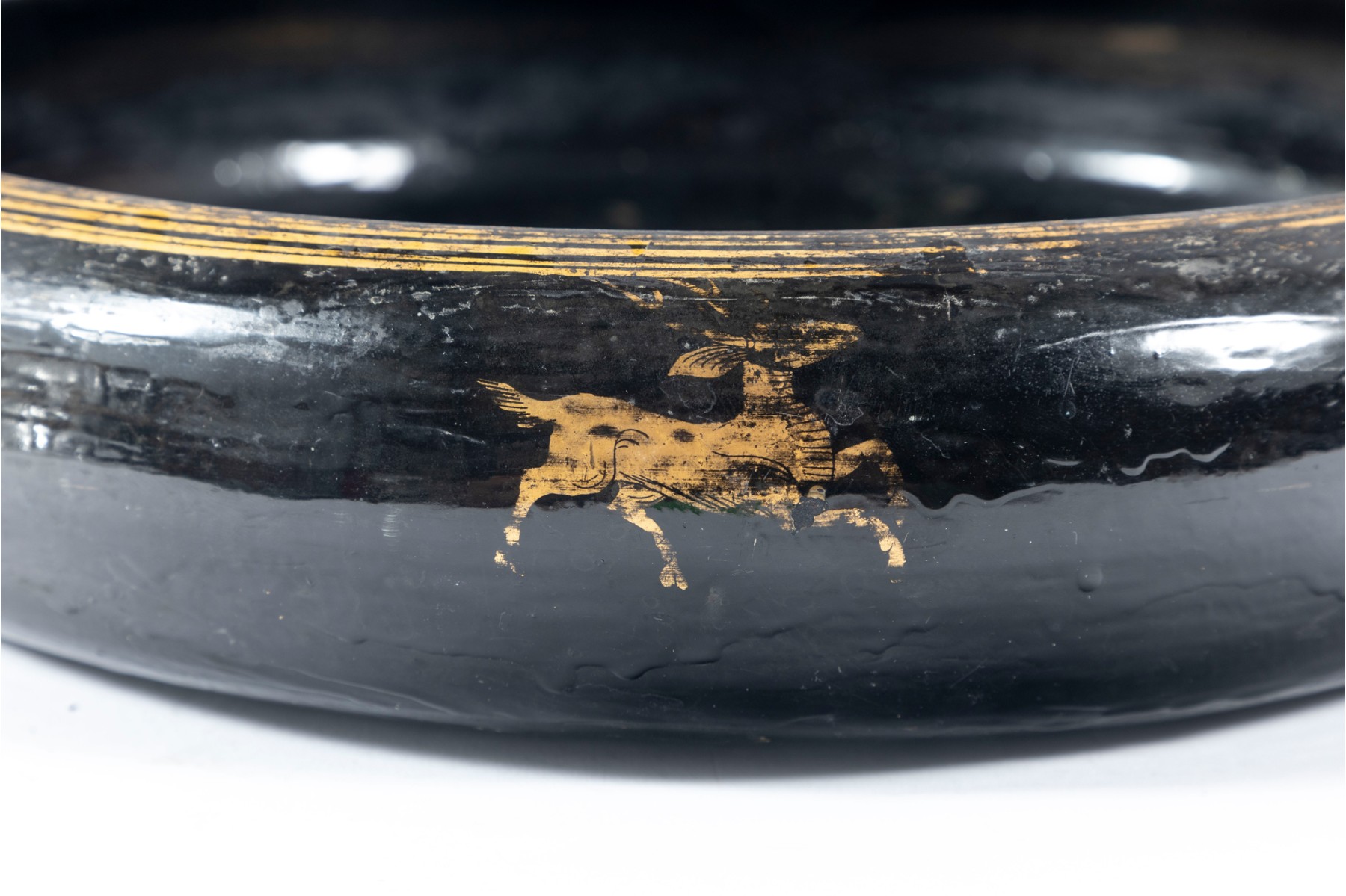A black lacquered 14" wood bowl emblazoned with gilt details and deer motifs throughout.