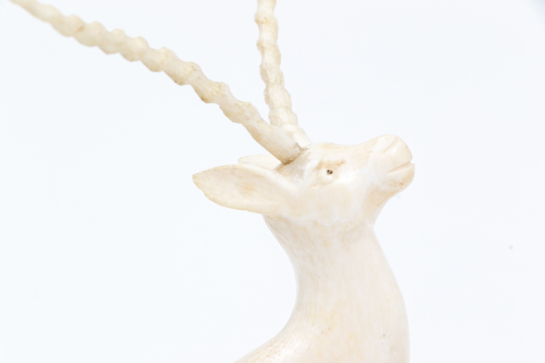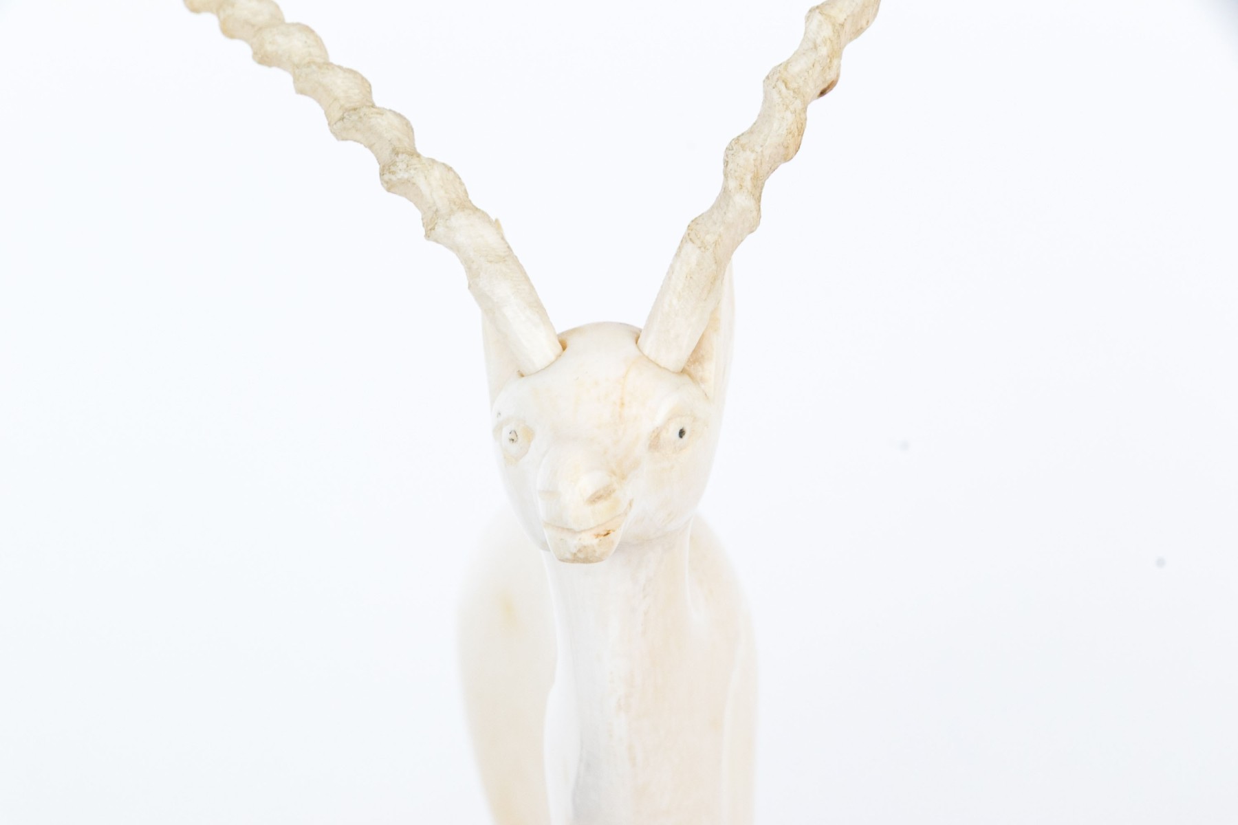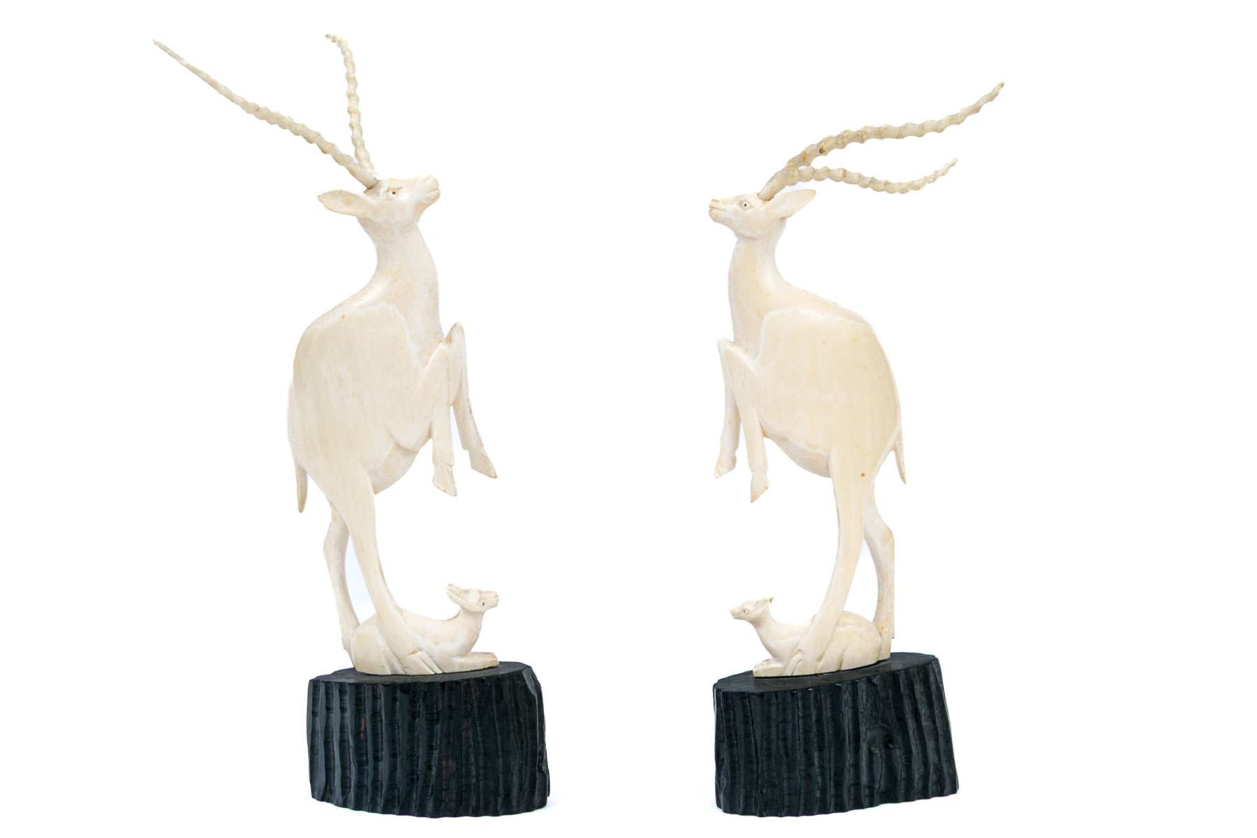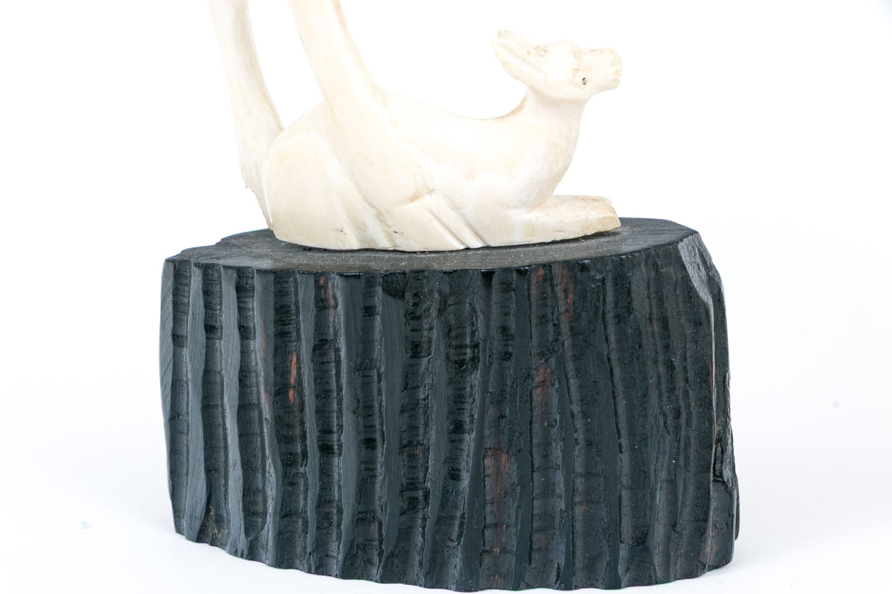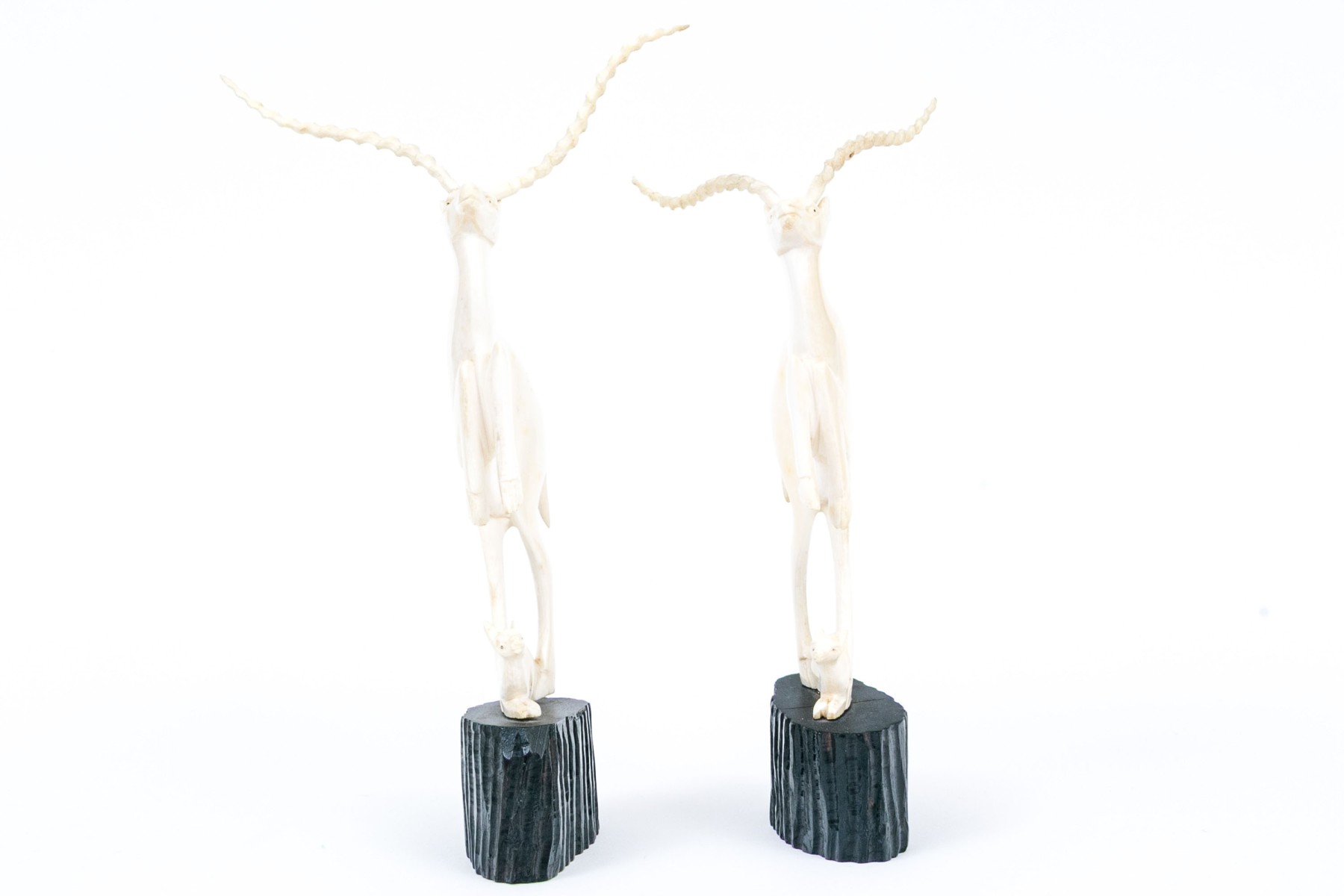 An eye-catching pair of carved bone figures depicting antelopes with fawns over ebonized bases. Both with antlers that can be removed.