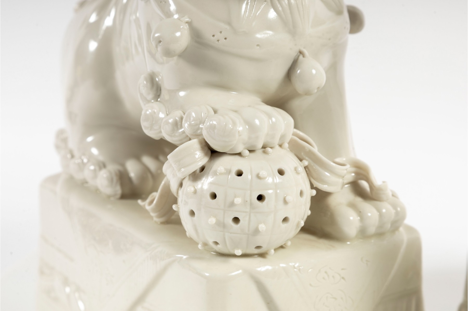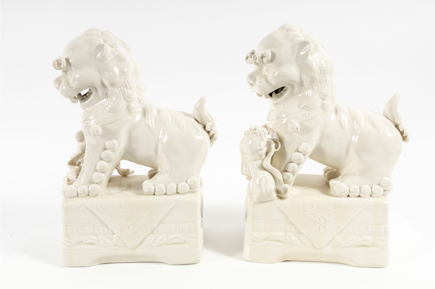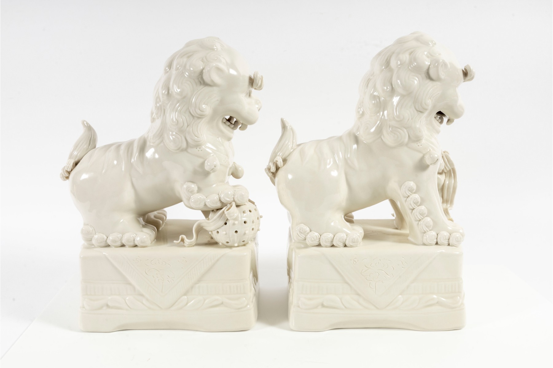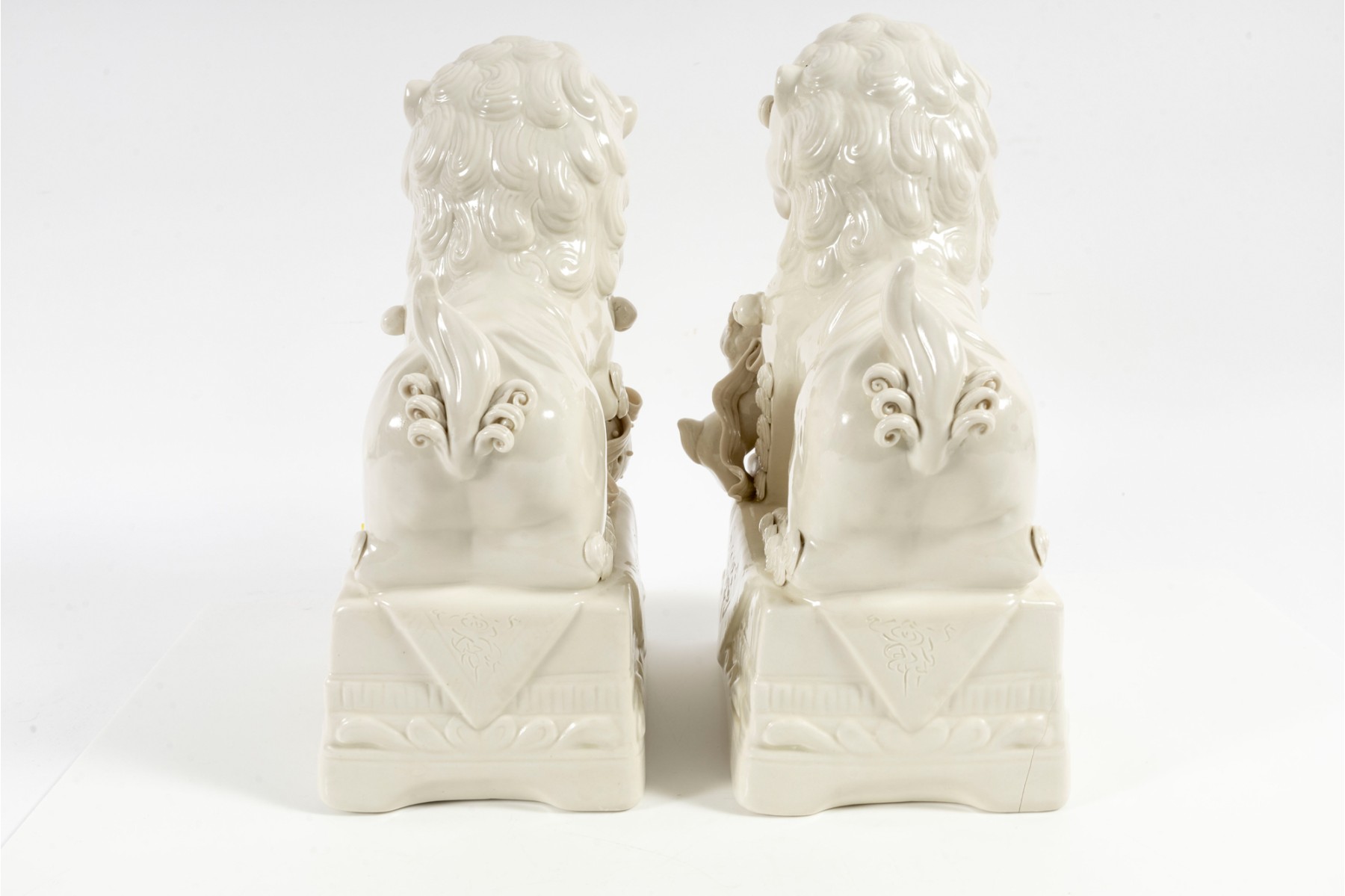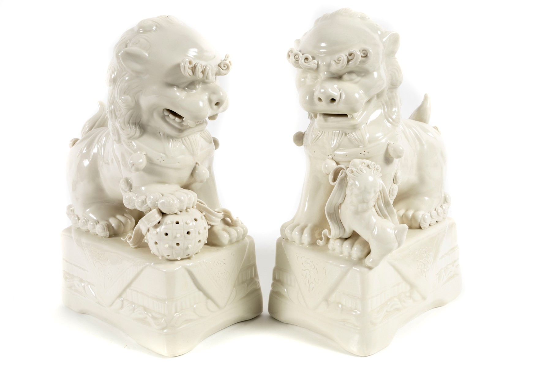 A pair of decorative, full white porcelain Foo Dog sculptures depicting two traditional Chinese guardian lions perched and sat on large pedestals. Both examples feature different scenes/poses.