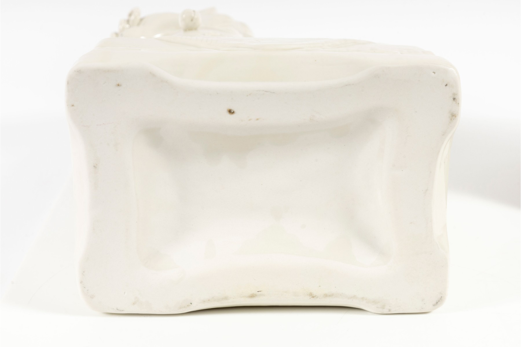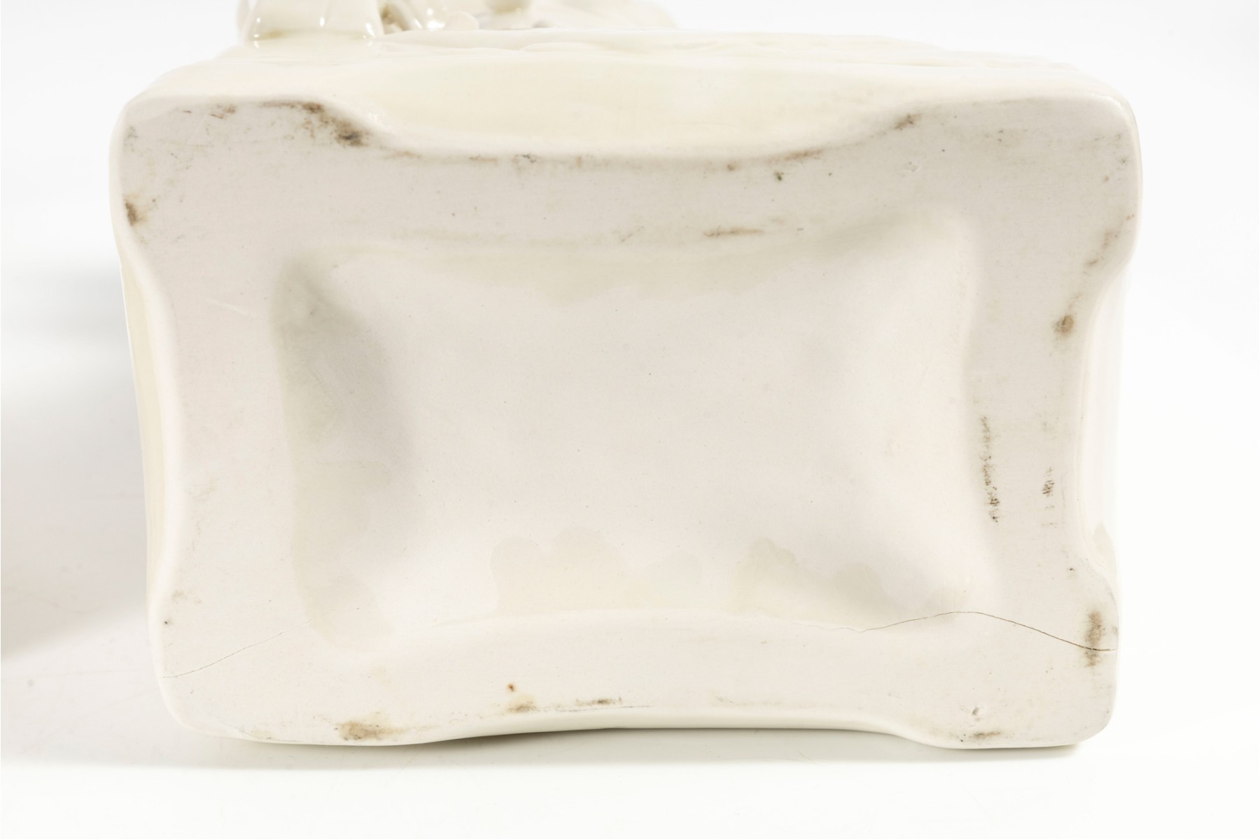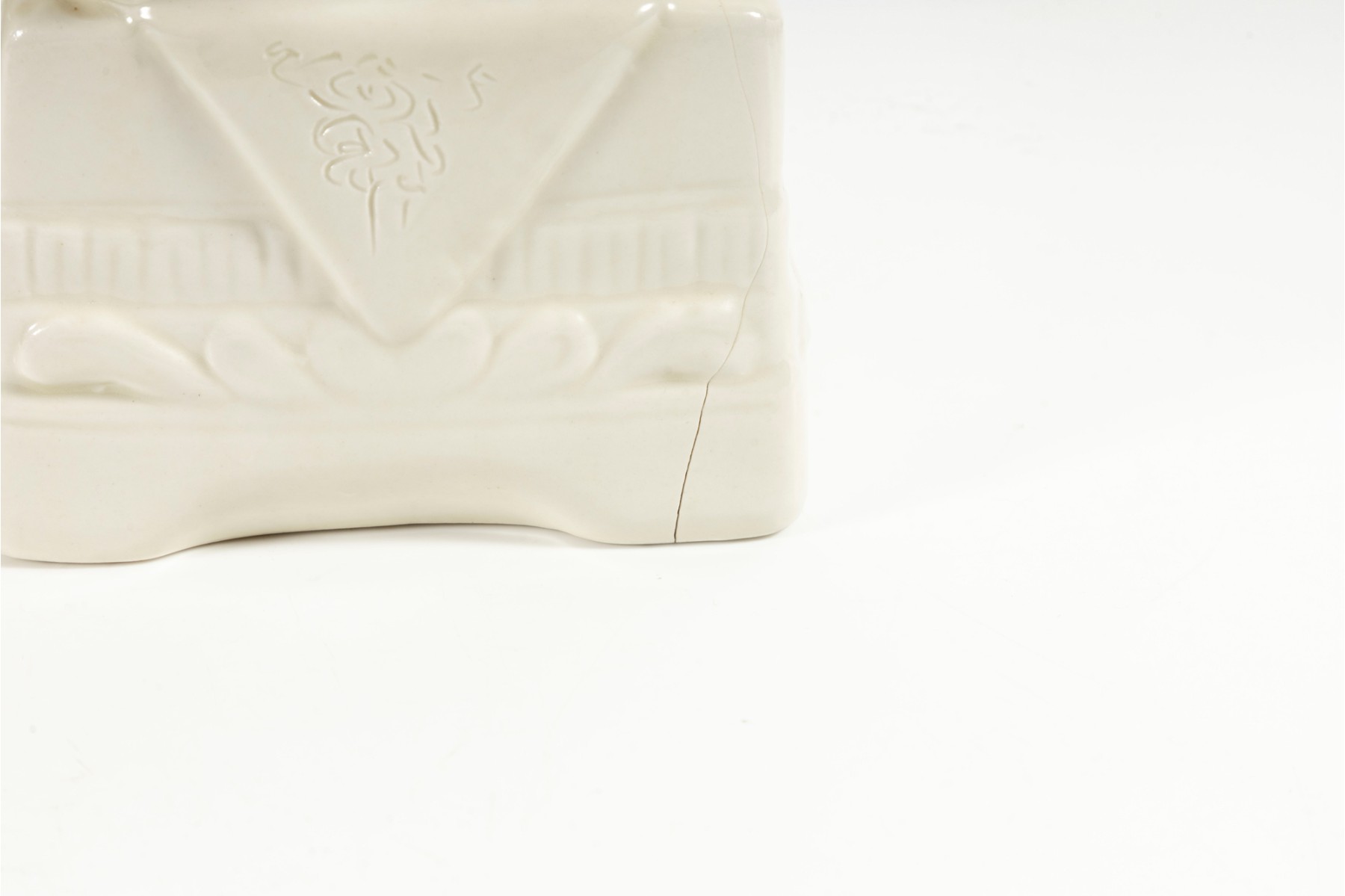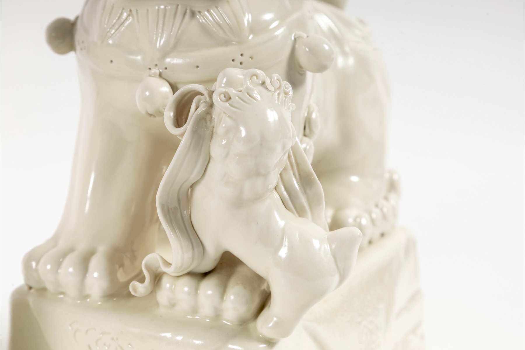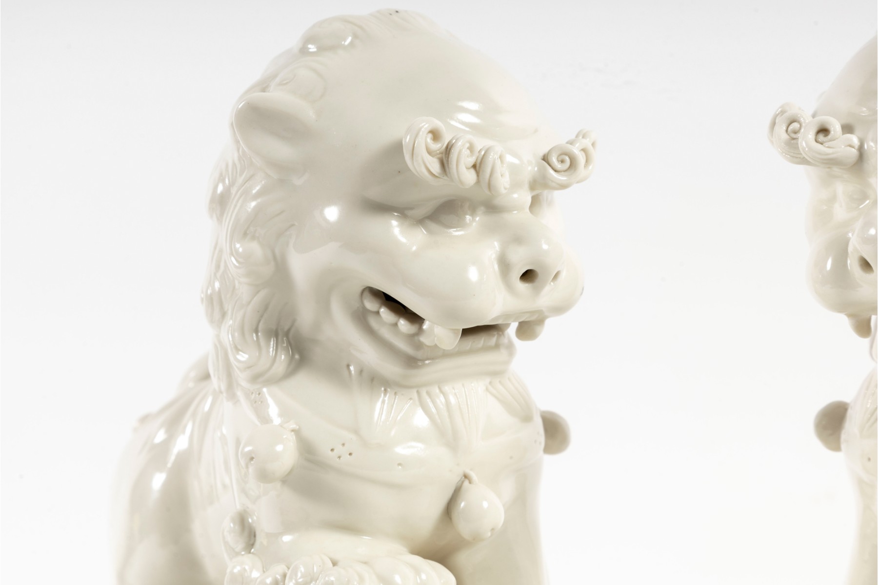 A pair of decorative, full white porcelain Foo Dog sculptures depicting two traditional Chinese guardian lions perched and sat on large pedestals. Both examples feature different scenes/poses.
