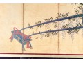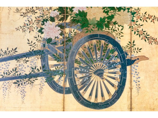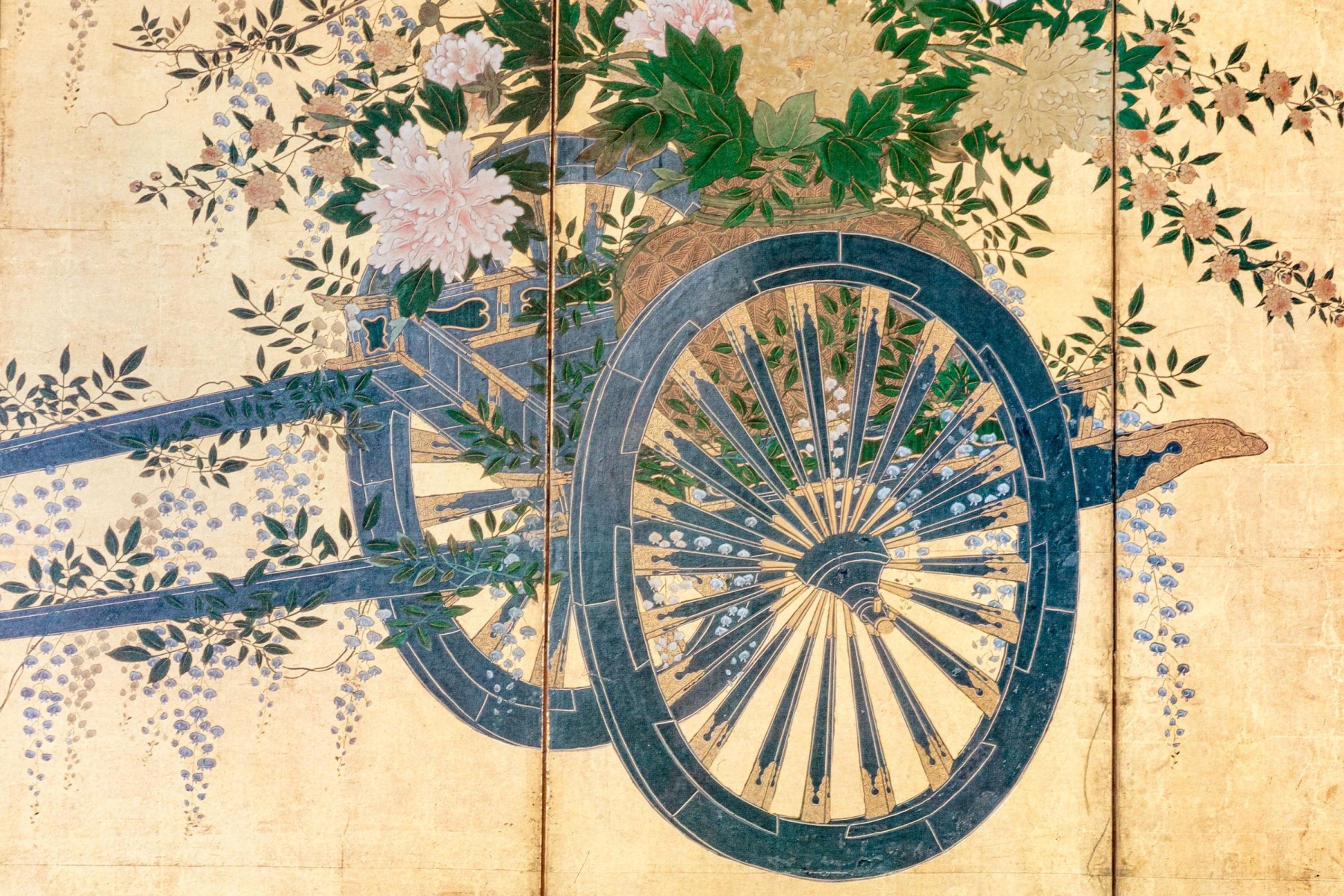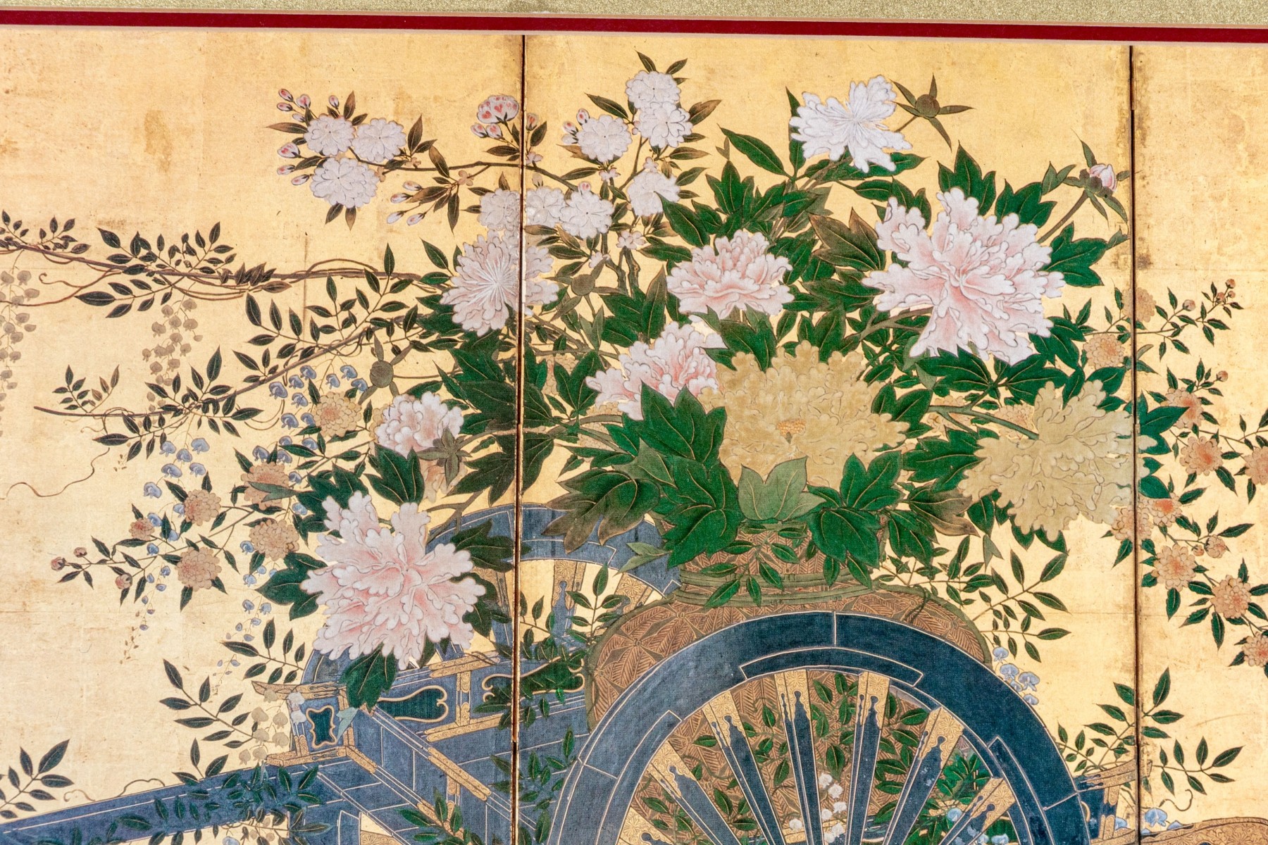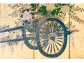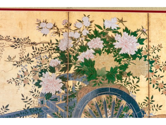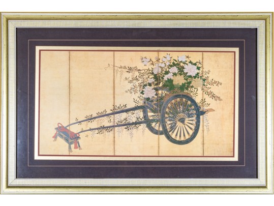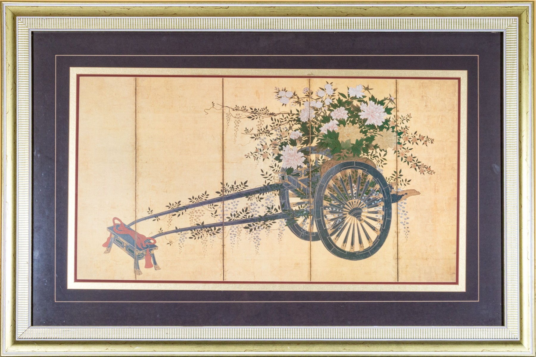 The decorative print depicts a image of a five panel table screen with a horse drawn cart brimming with flowers against a gilt background.