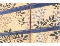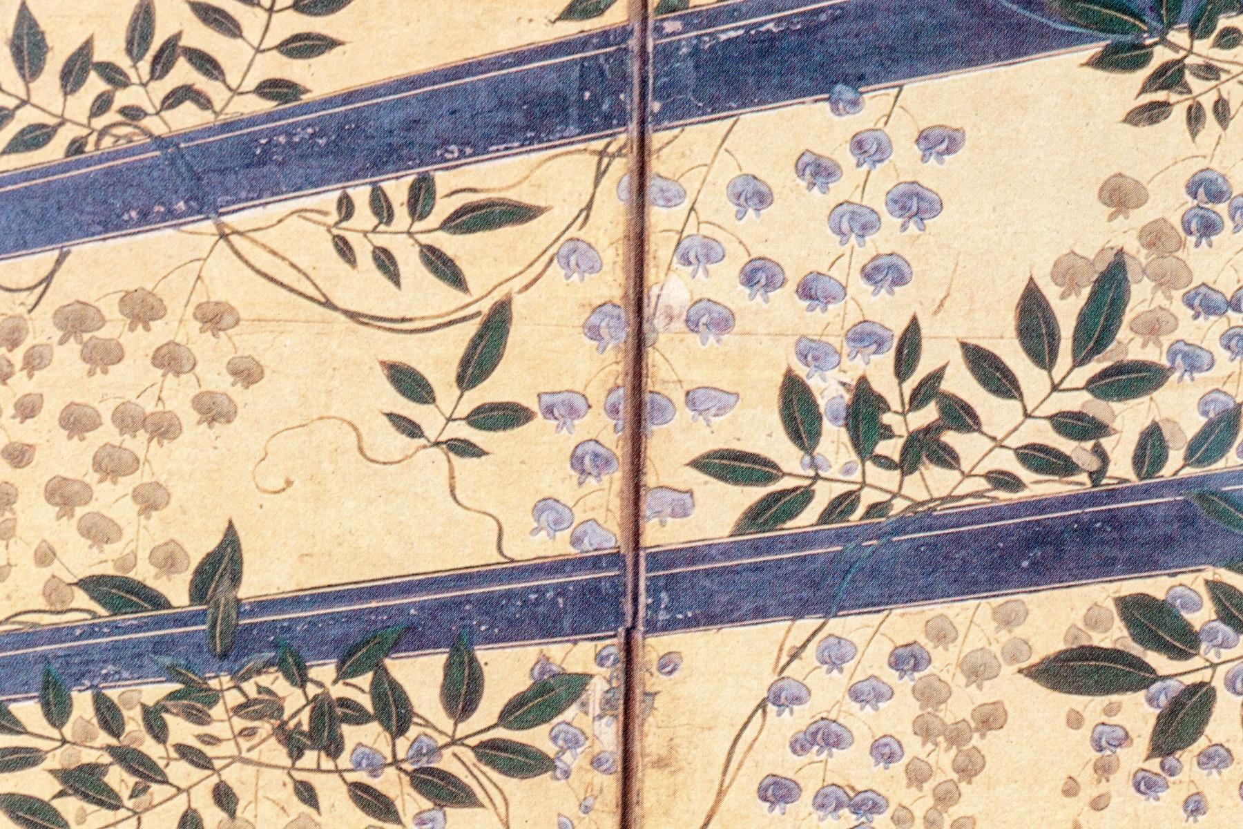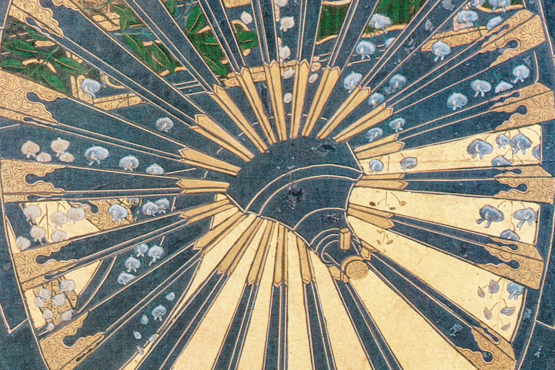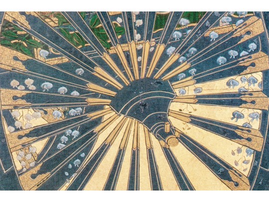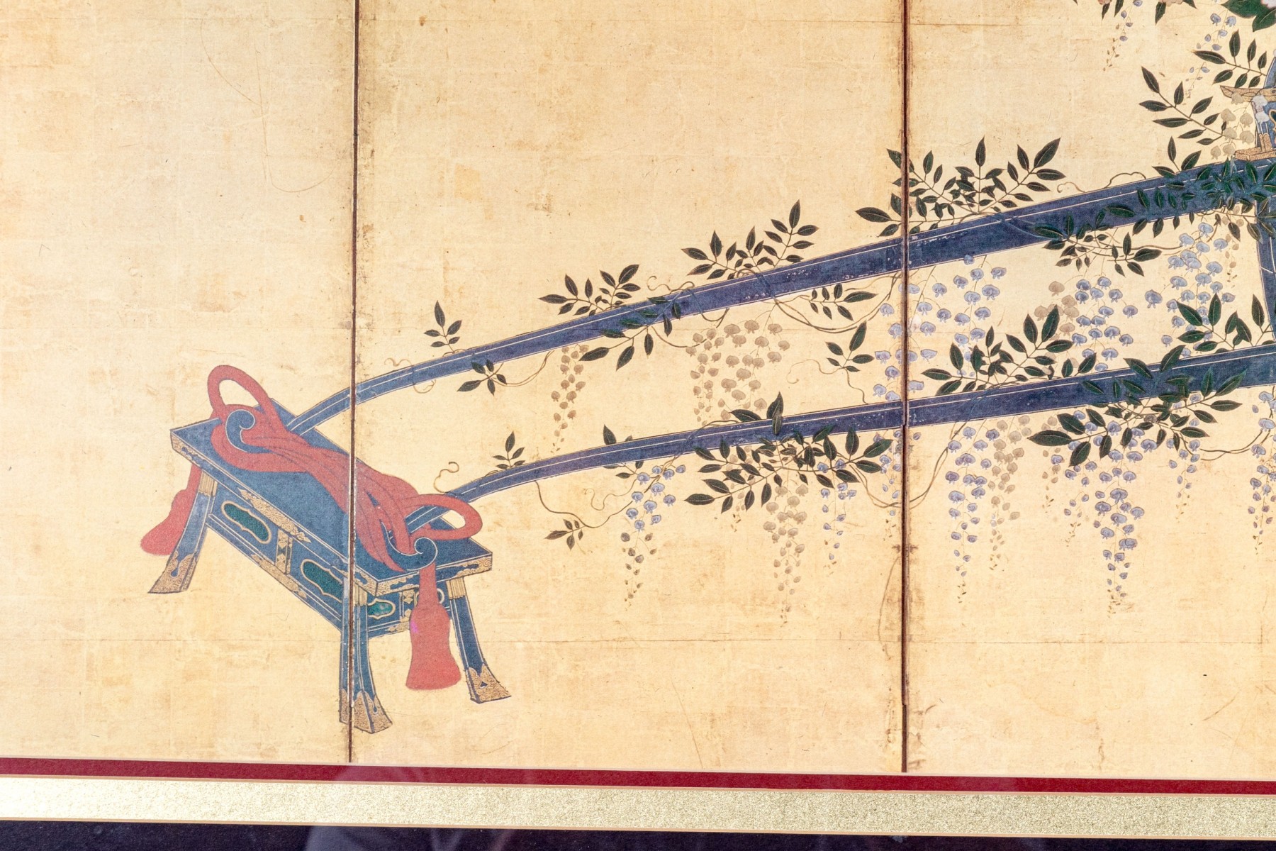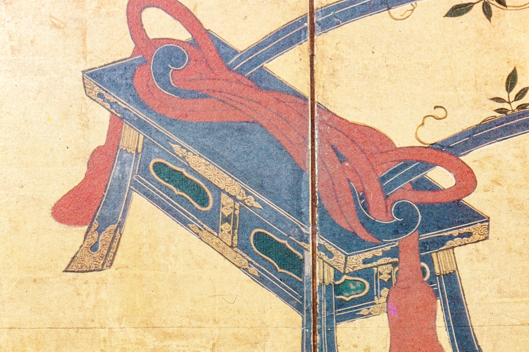 The decorative print depicts a image of a five panel table screen with a horse drawn cart brimming with flowers against a gilt background.
