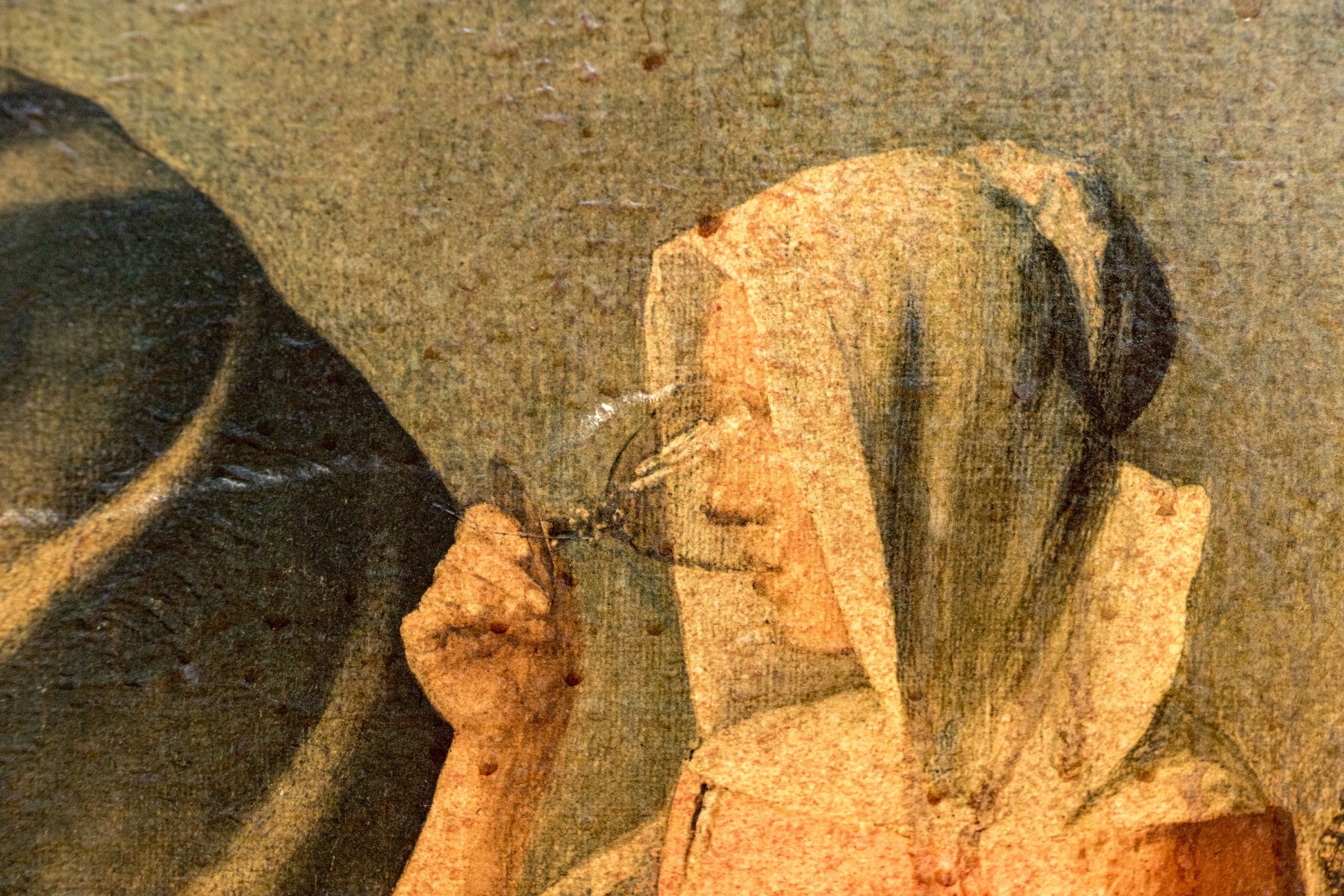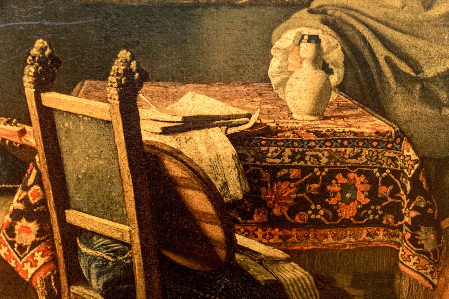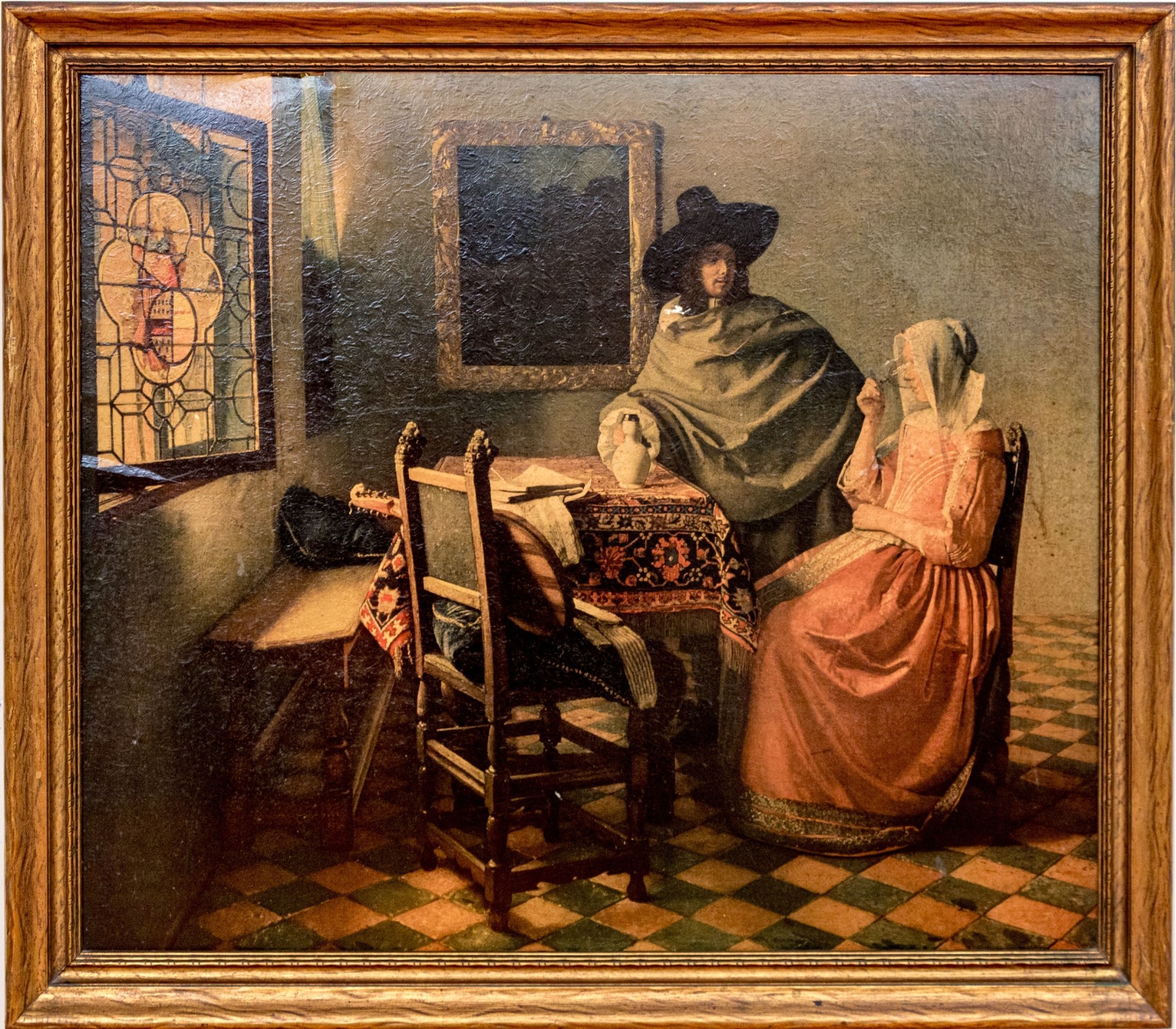 After Johannes Vermeer (Dutch, 1632-1675) "The Glass of Wine" high quality embellished print depicting a man in a black wide brimmed hat holding a white jug over a table with a lavish woven tablecloth beide a seated woman in pink drinking a glass of wine. The figures are seen in an interior with chairs and a bench over a green and yellow checkered tile floor near a window open ajar.