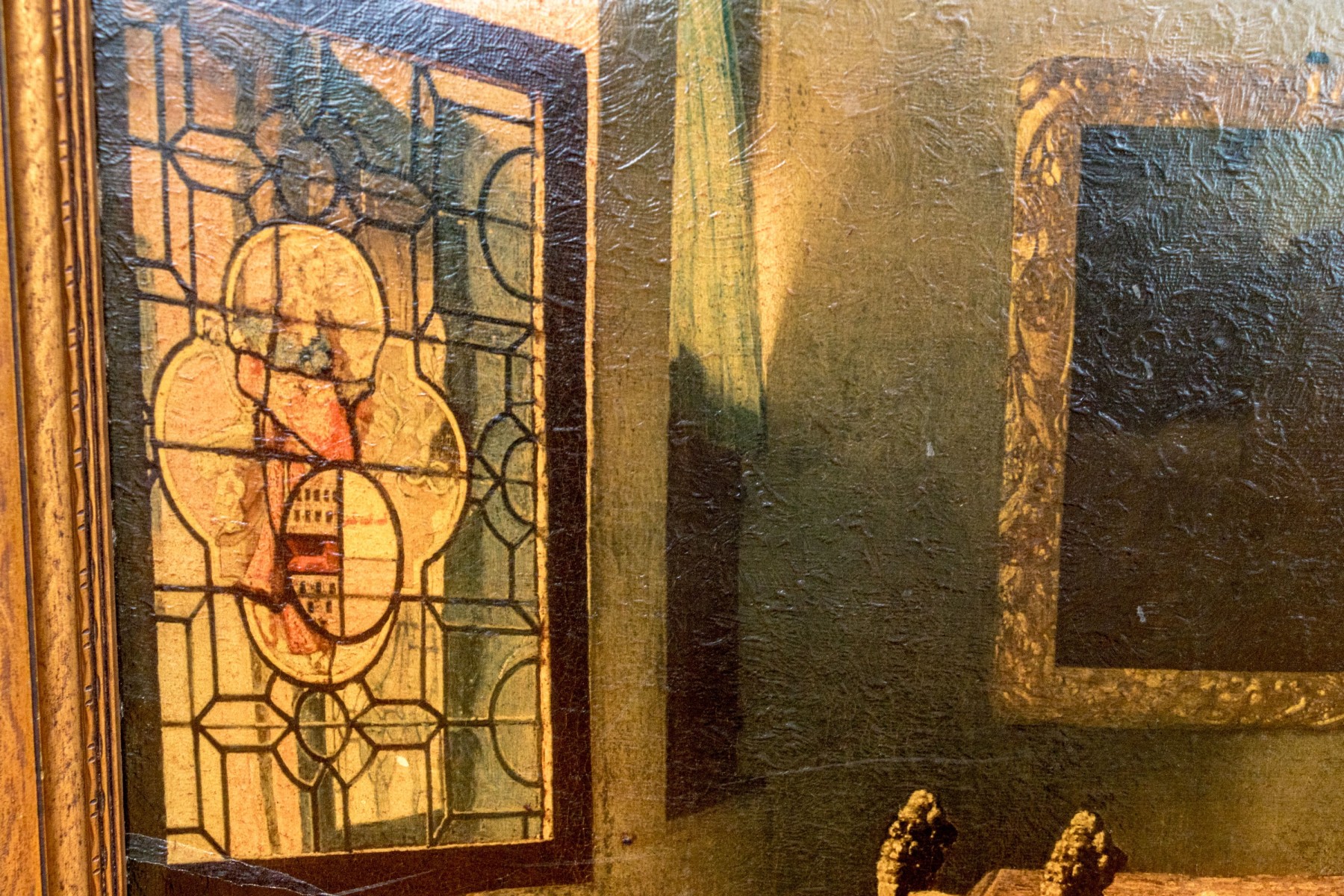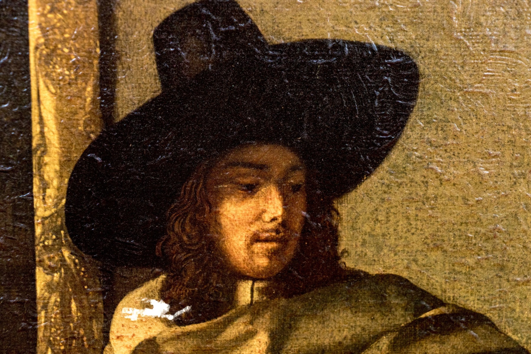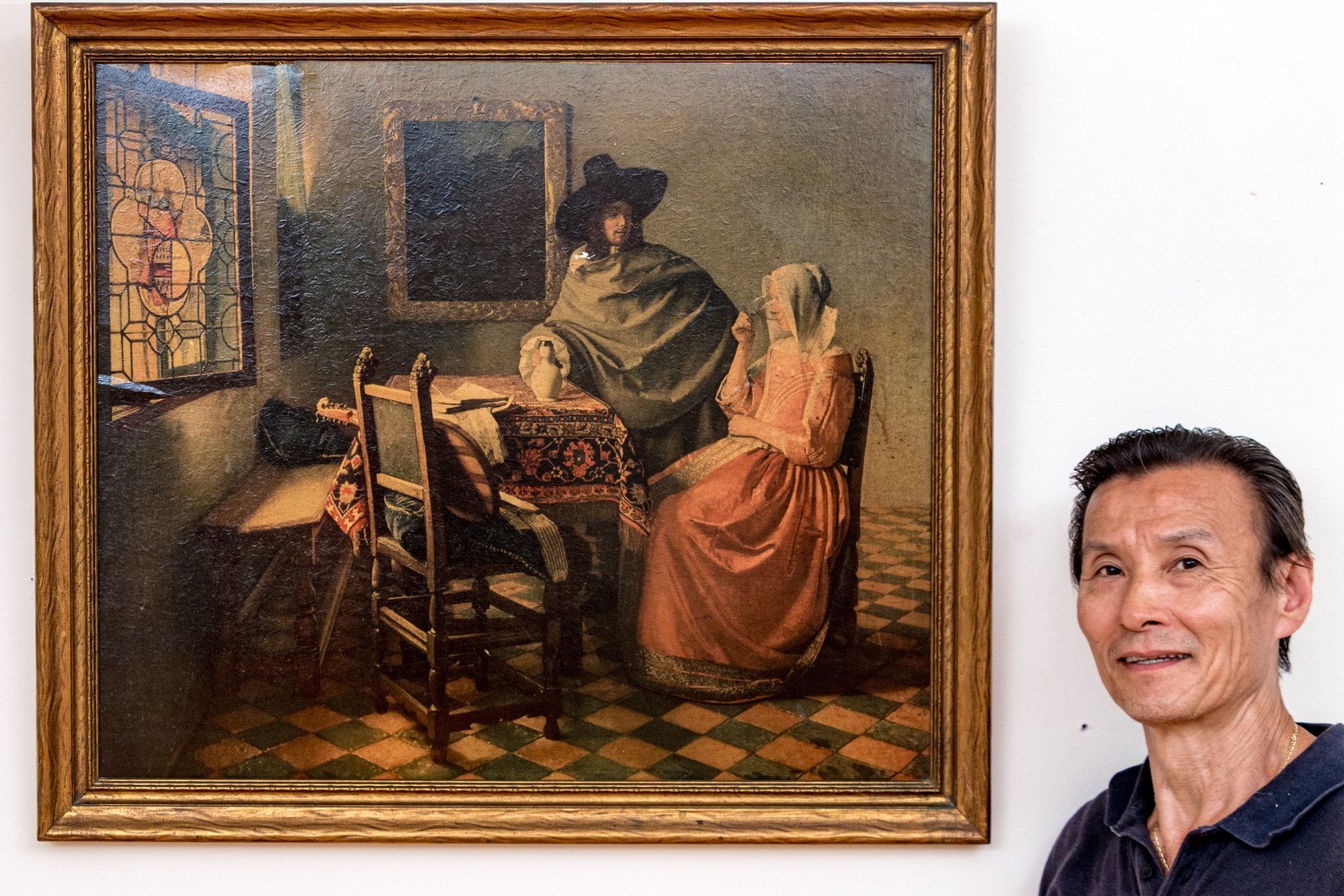 After Johannes Vermeer (Dutch, 1632-1675) "The Glass of Wine" high quality embellished print depicting a man in a black wide brimmed hat holding a white jug over a table with a lavish woven tablecloth beide a seated woman in pink drinking a glass of wine. The figures are seen in an interior with chairs and a bench over a green and yellow checkered tile floor near a window open ajar.