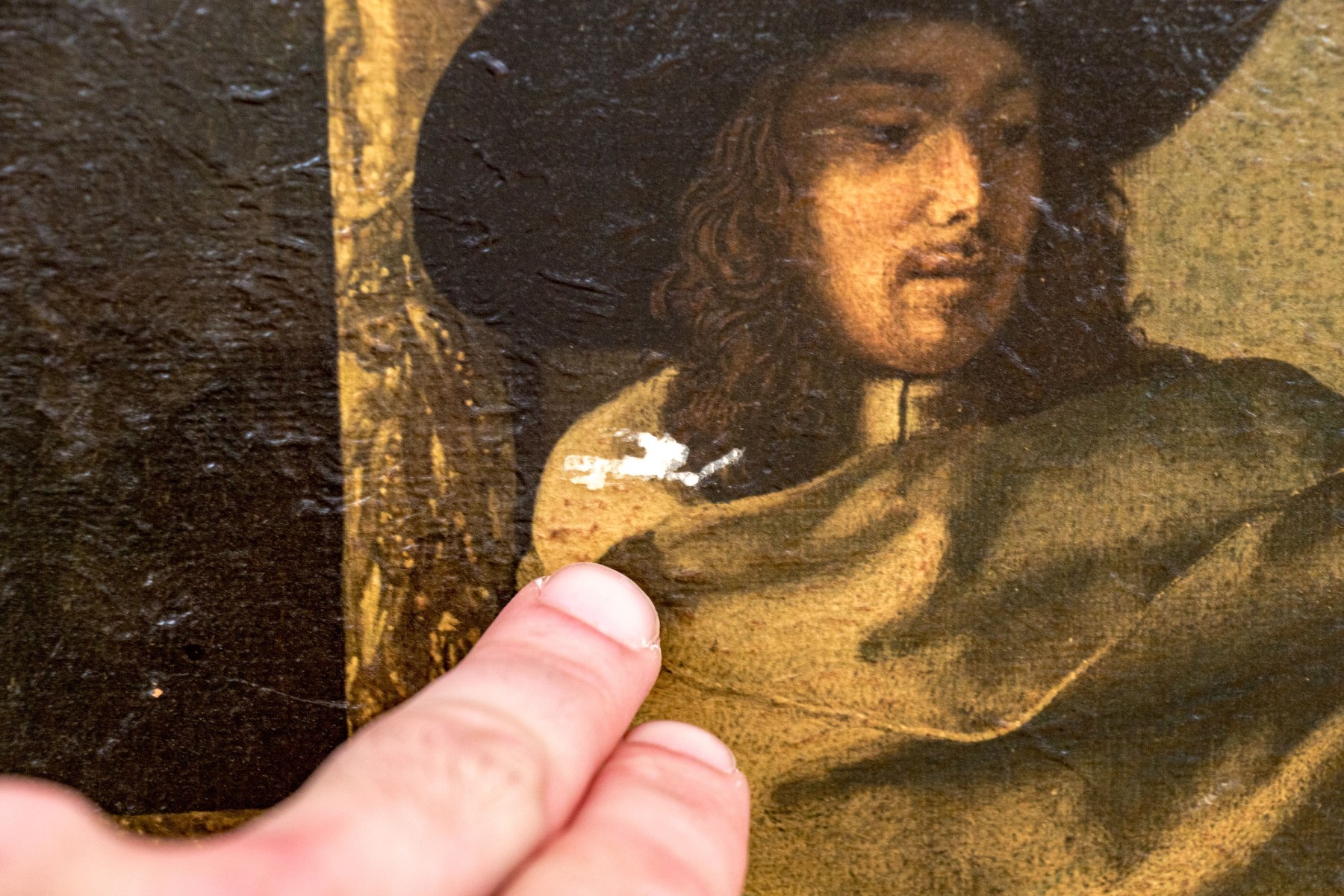 Punctures to the top, bowed with nics and a tear to the right shoulder of cavalier. Despite wear still presents well.