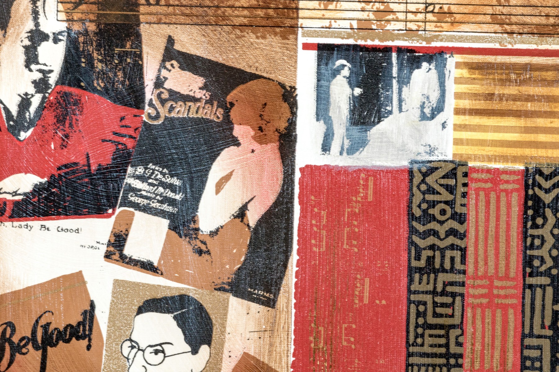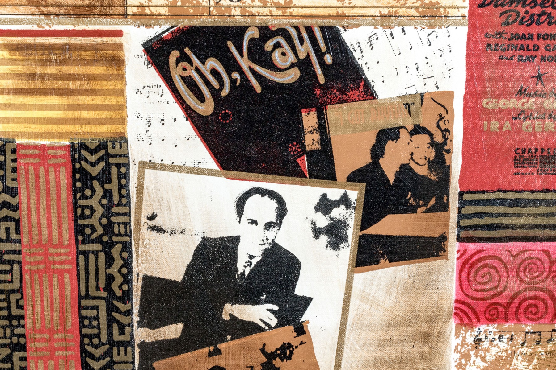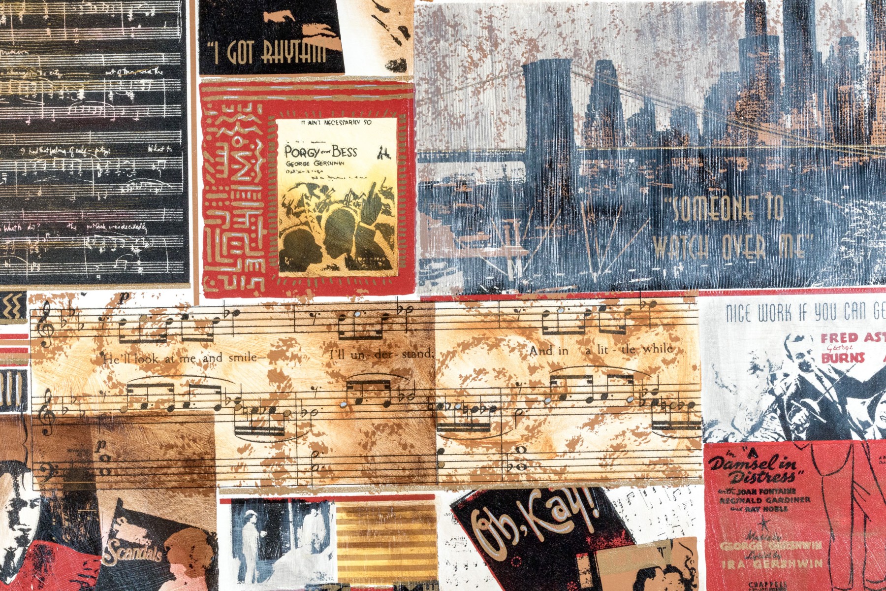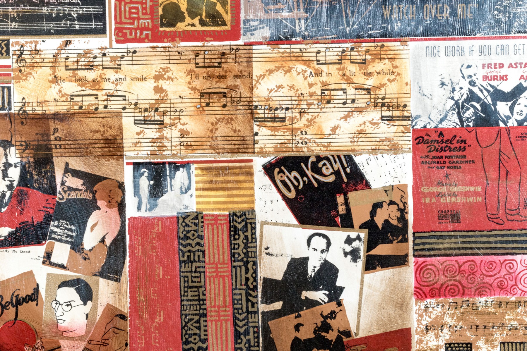A fantastic and decorative print on canvas collage with imagery related to Gershwin and music.
