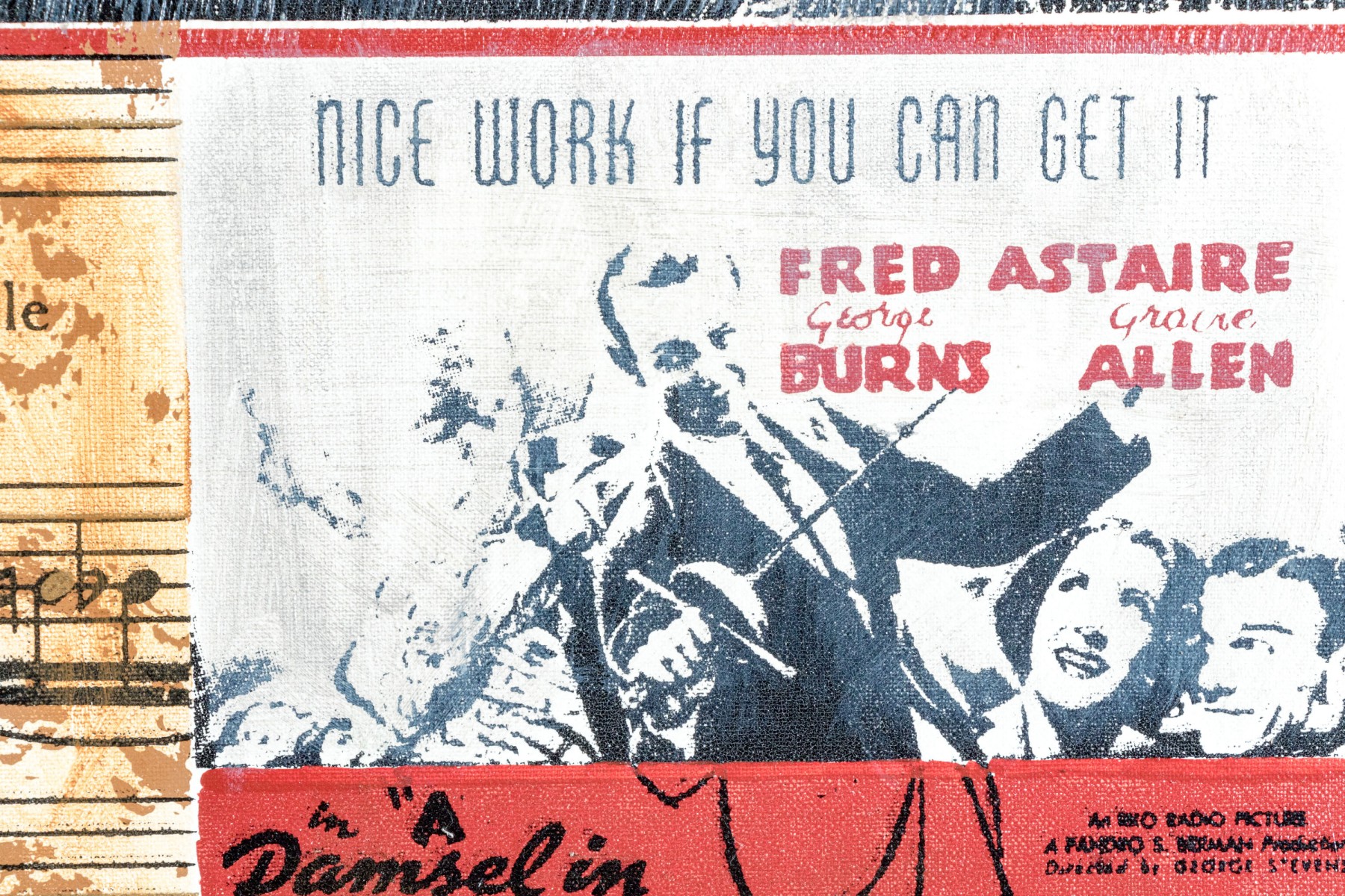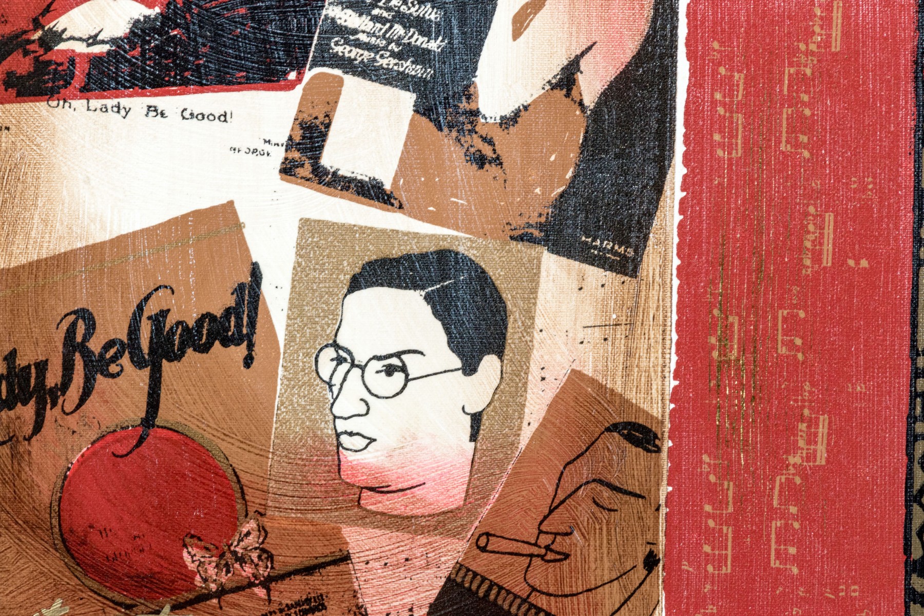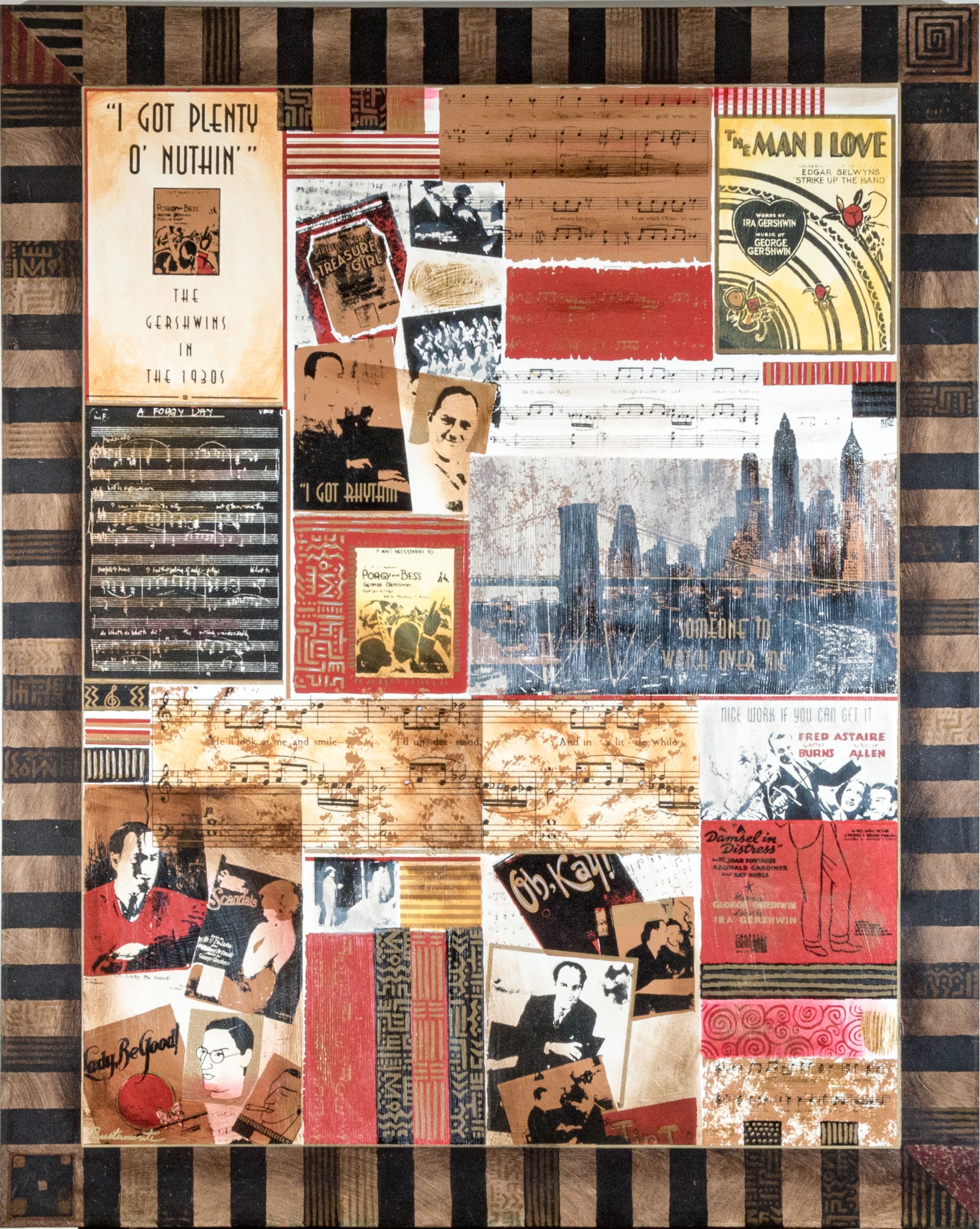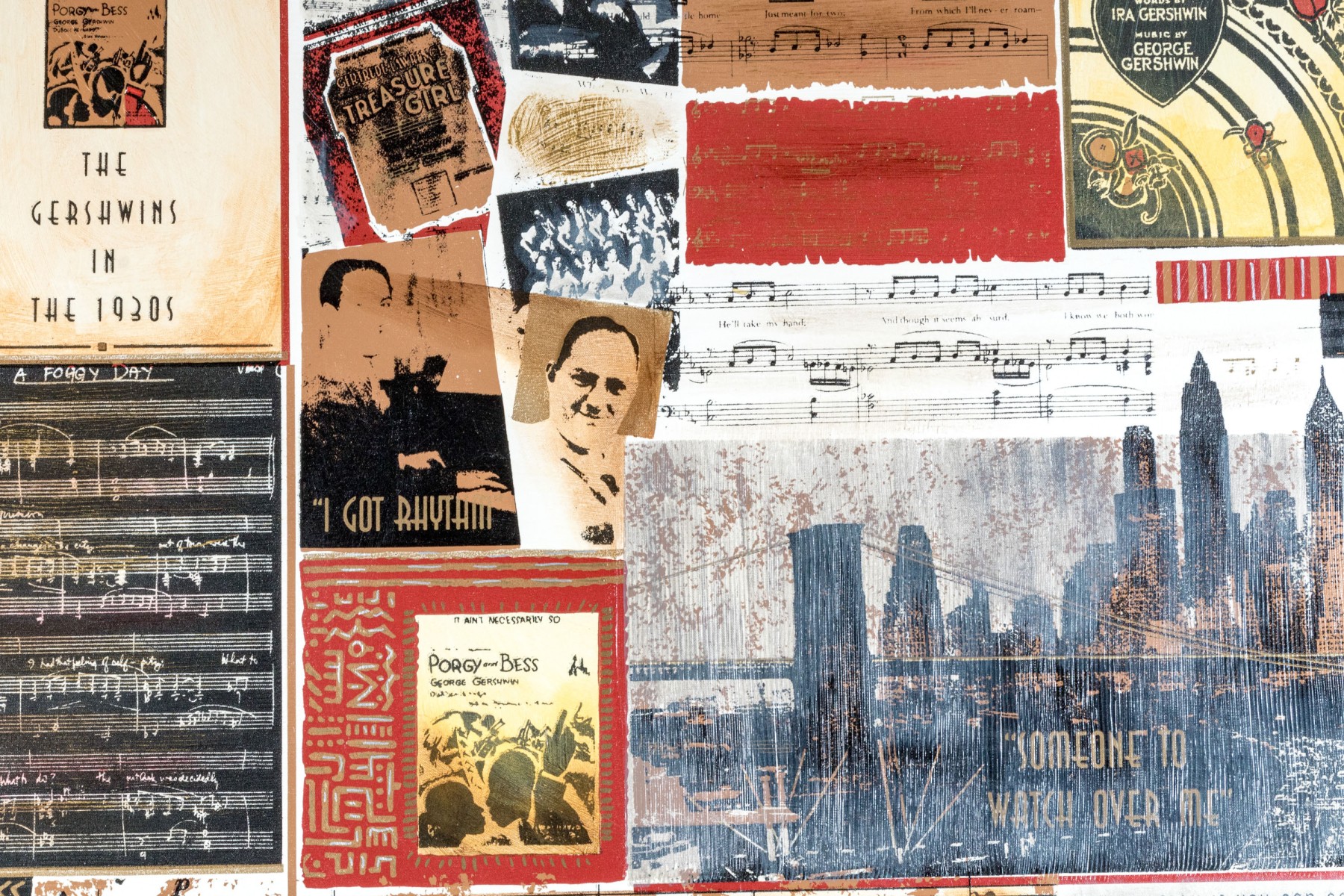 A fantastic and decorative print on canvas collage with imagery related to Gershwin and music.