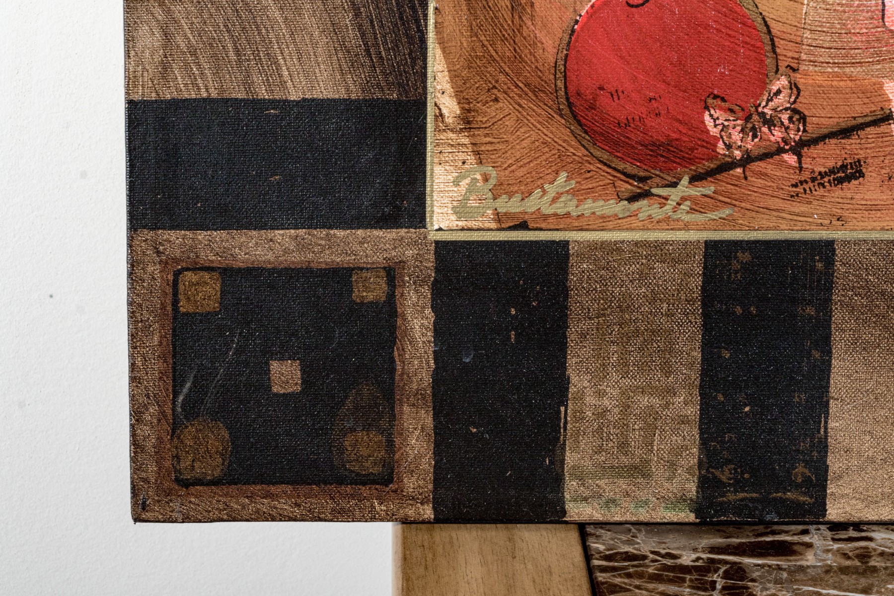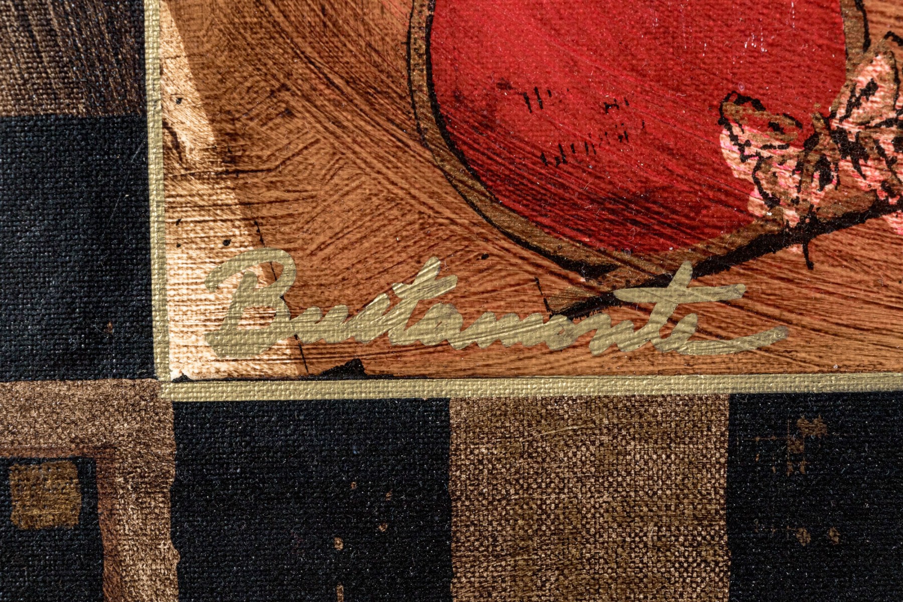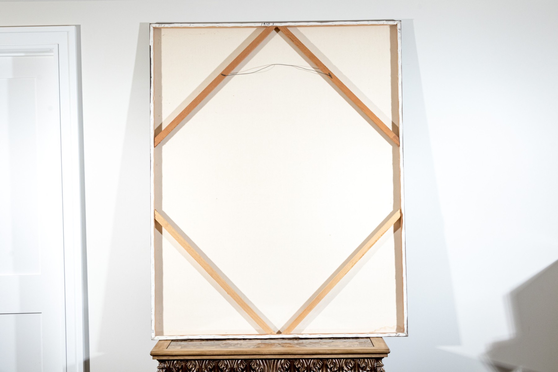 The unframed work, is mounted on its stretcher support with a printed border depicting alternating black and gilt finish.