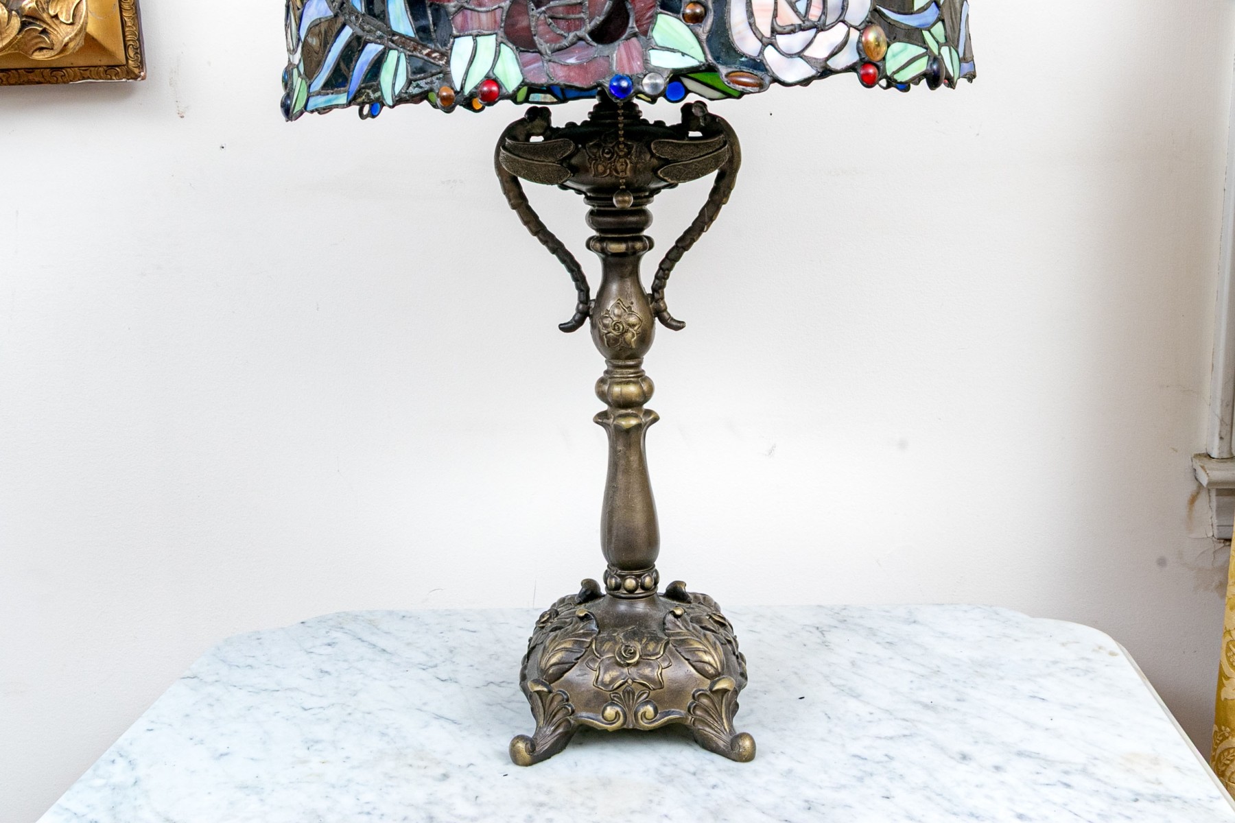 Decorative resin Tiffany style table lamp with opposing figural dragonflies. The footed base with foliate motifs and flowers. The shade with slag, smooth and textured glass and accentuated with "jewels". The lamp with two sockets, pull chain operation and a rose form finial.