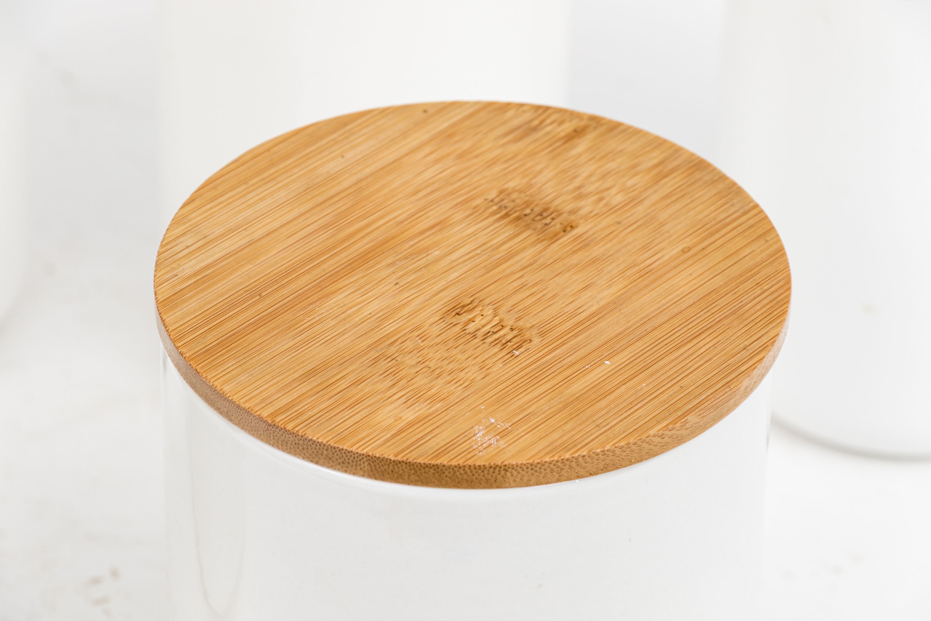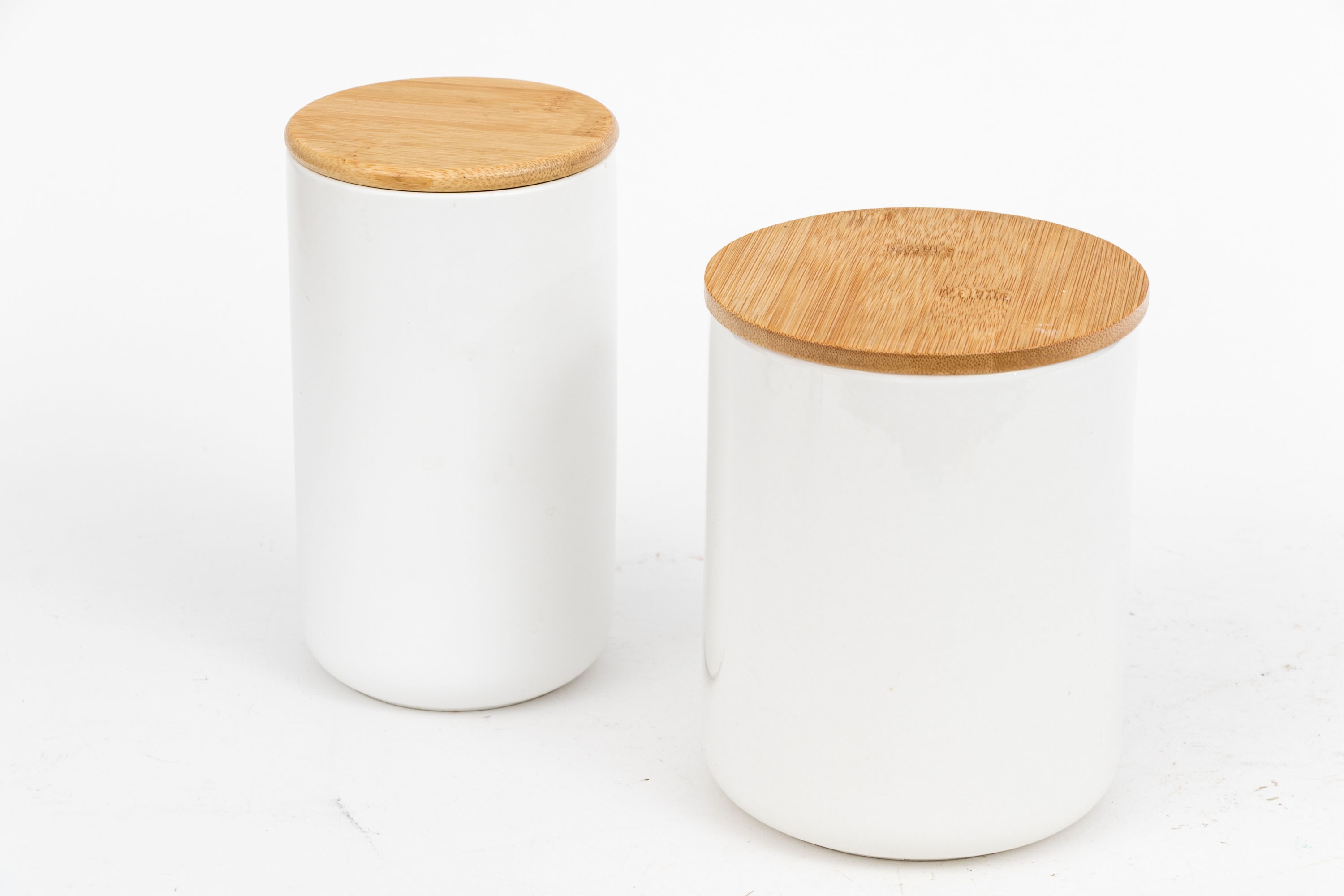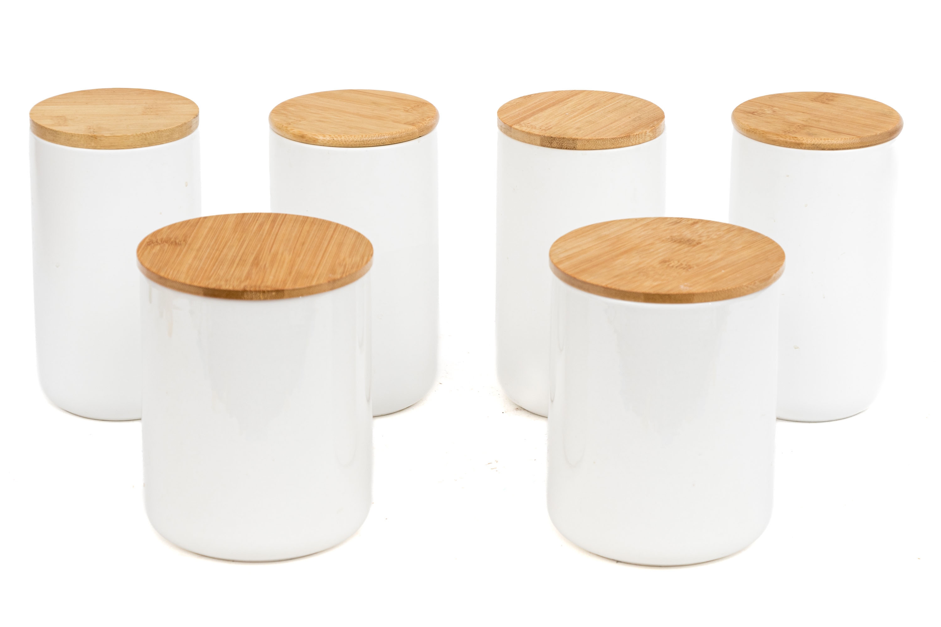A delightful set of white ceramic canisters with bamboo lids fitted with rubber gaskets for a secure close. Includes four tall and thin canisters along with two wide and short canisters.
