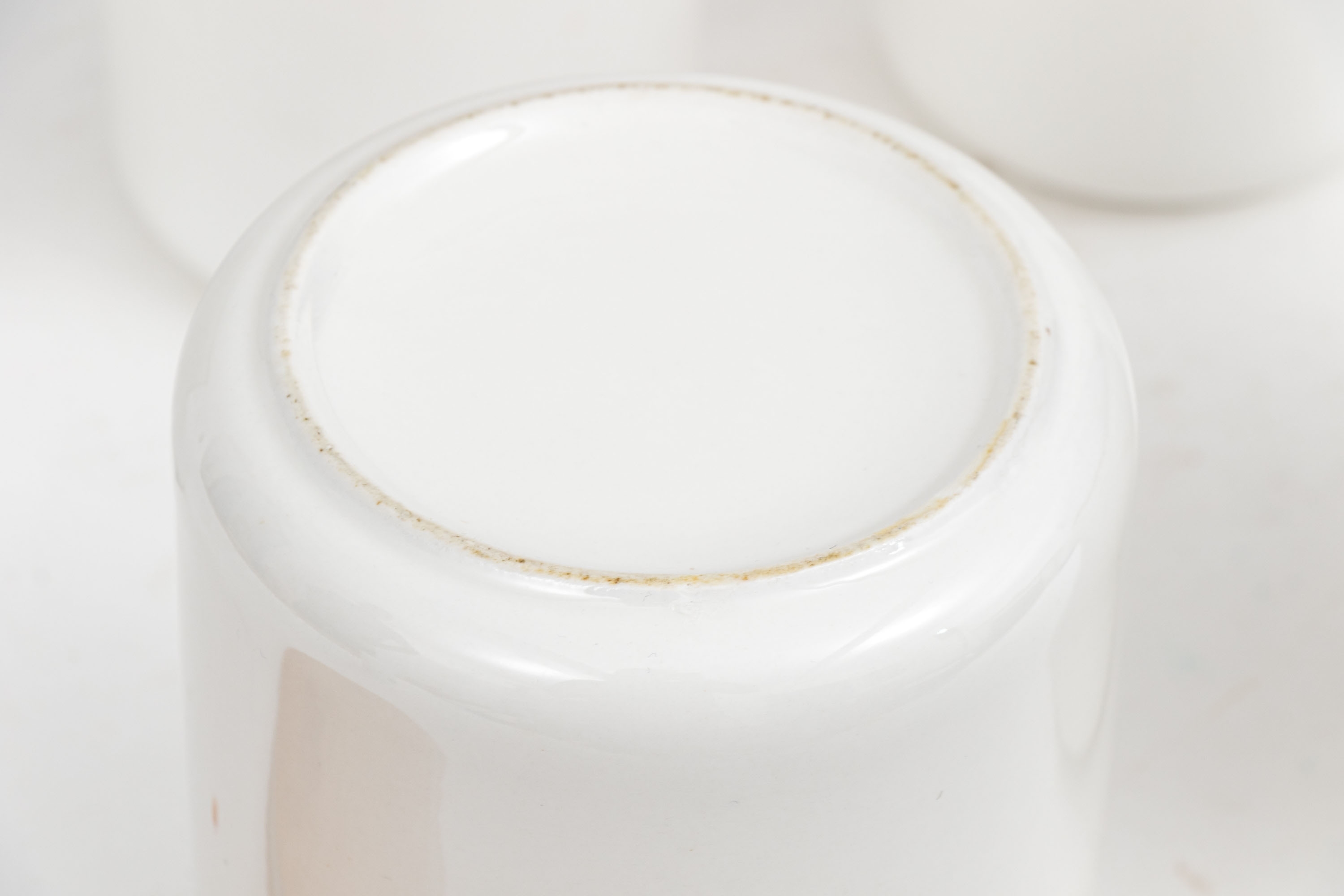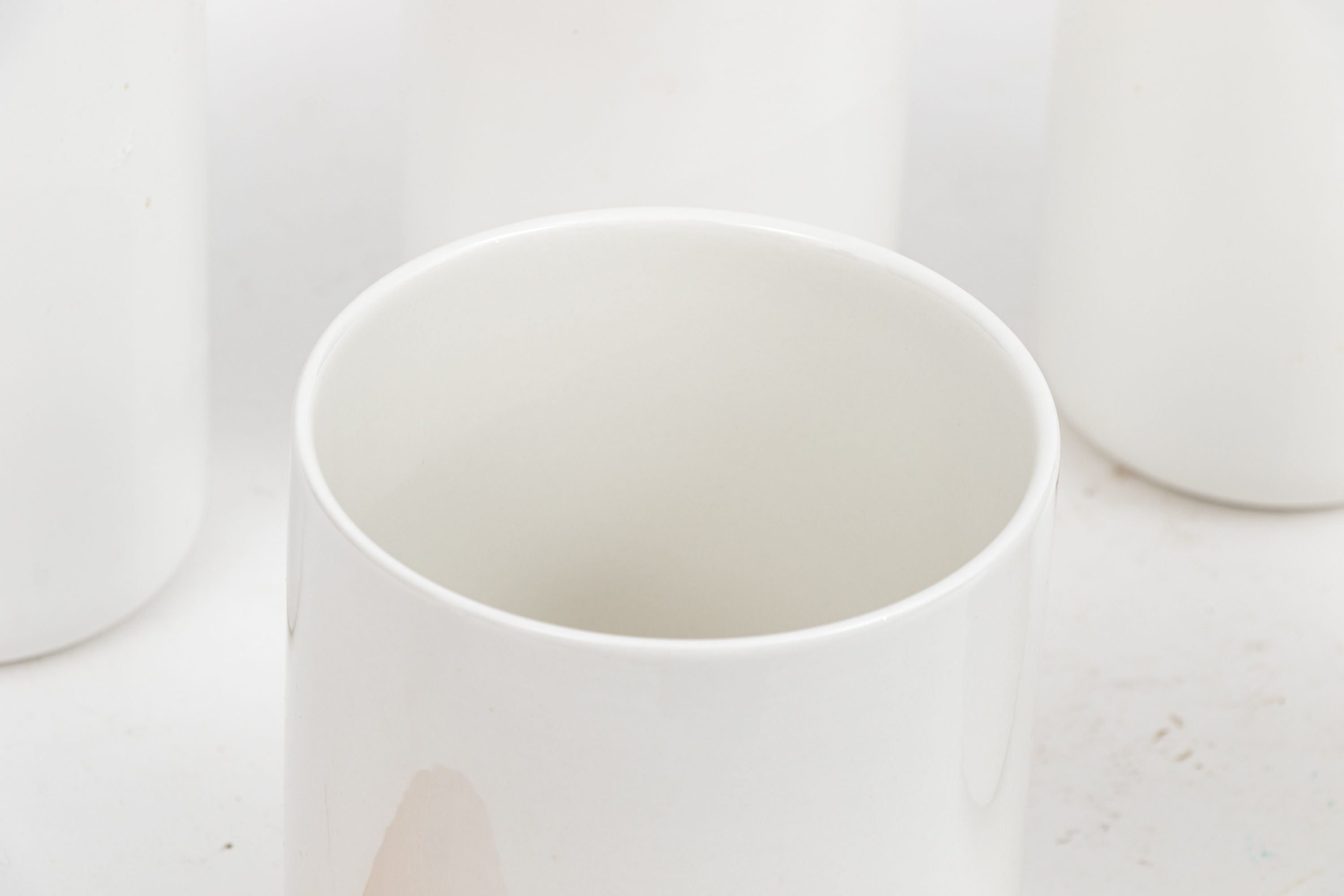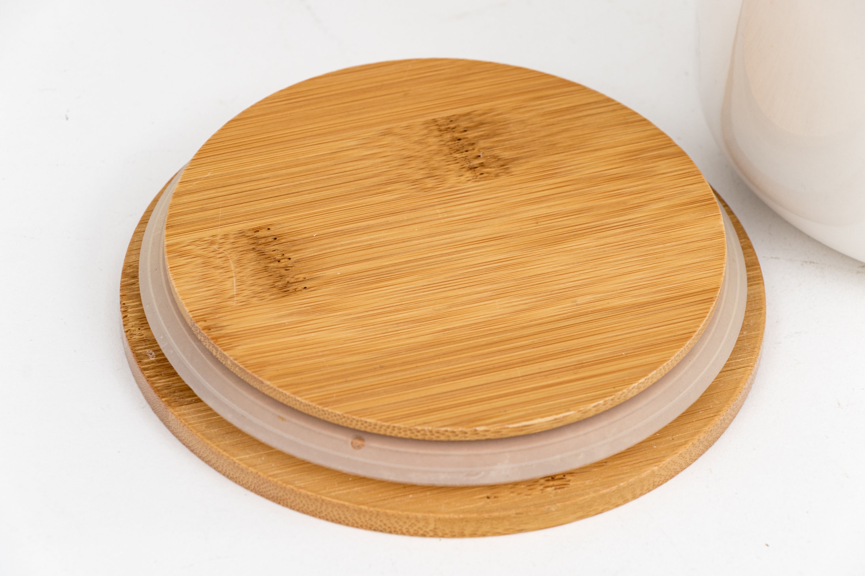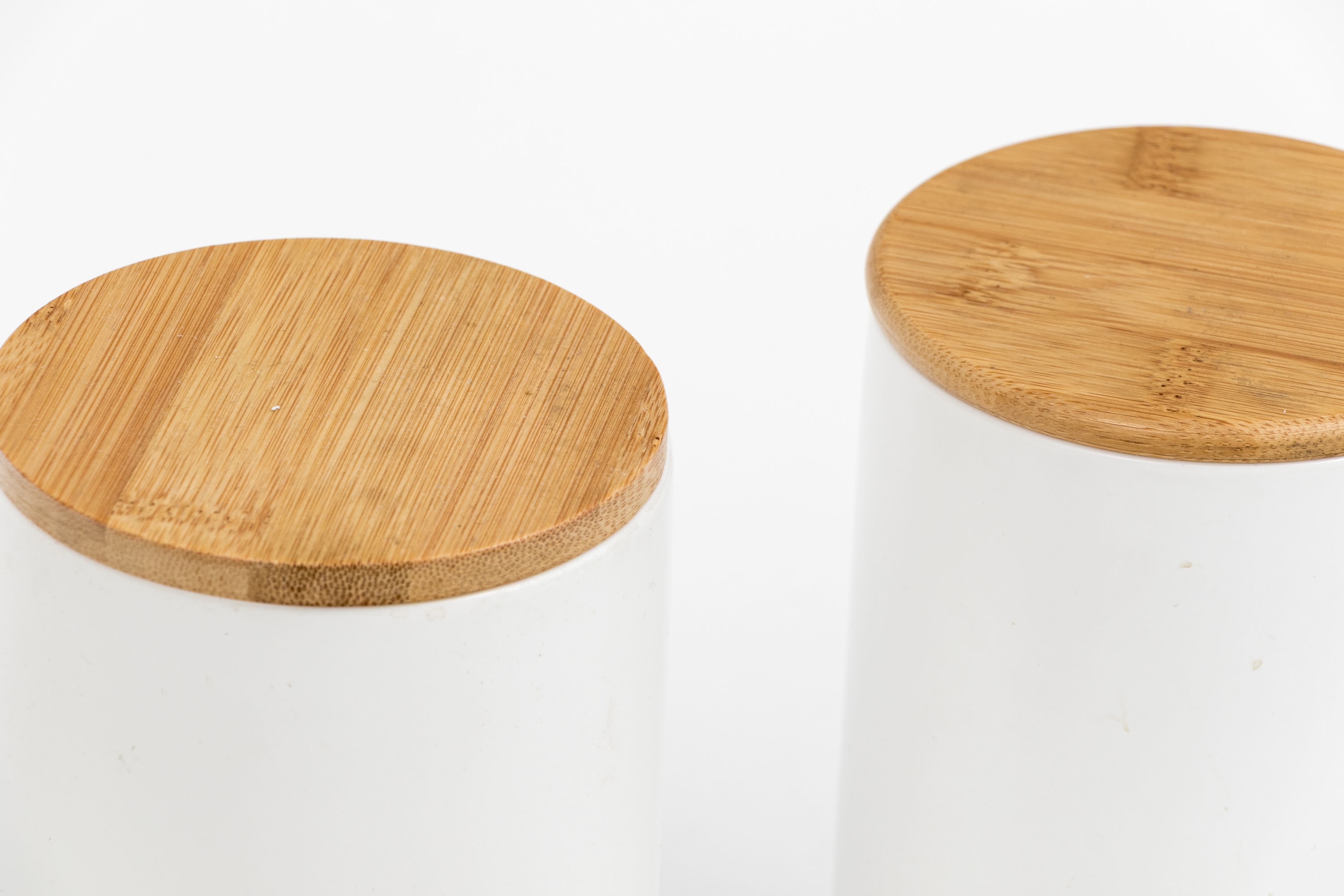 A delightful set of white ceramic canisters with bamboo lids fitted with rubber gaskets for a secure close. Includes four tall and thin canisters along with two wide and short canisters.