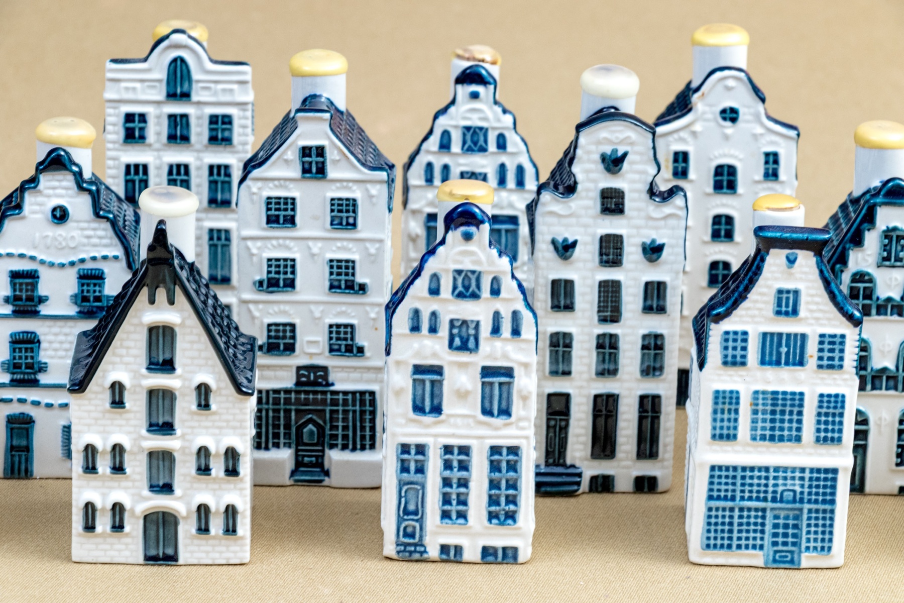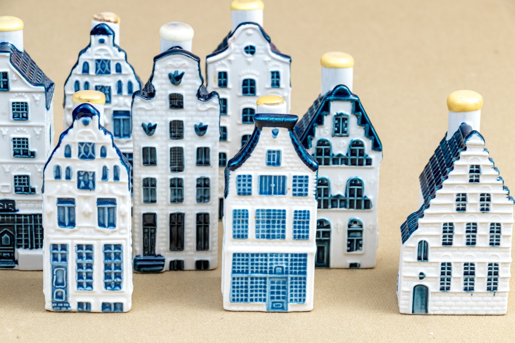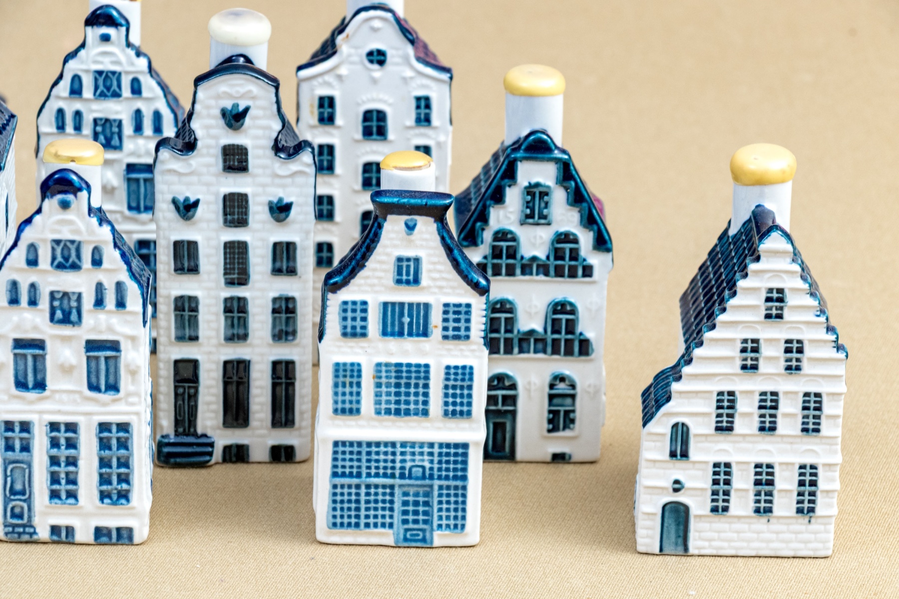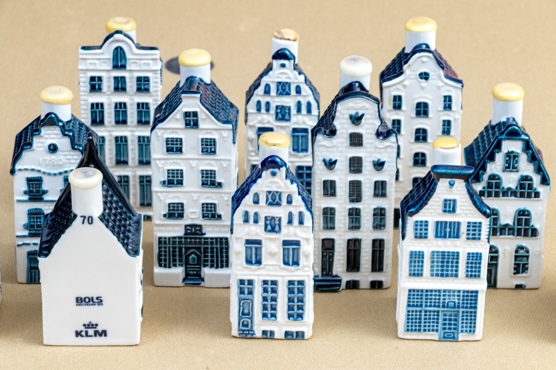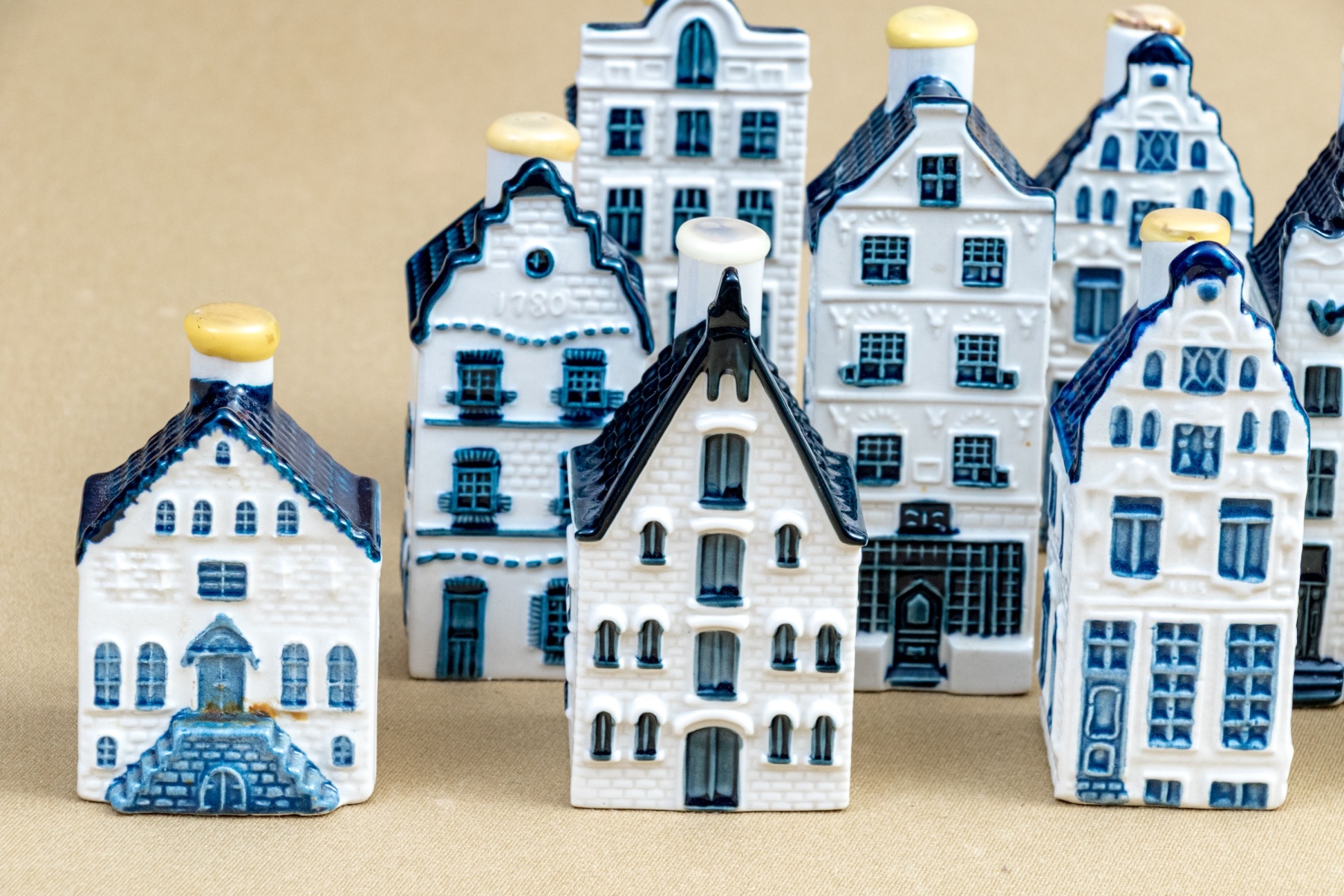 A fabulous decorative set of ten Dutch KLM Bols ceramic house form bottles, some taller and others shorter. All marked underfoot.