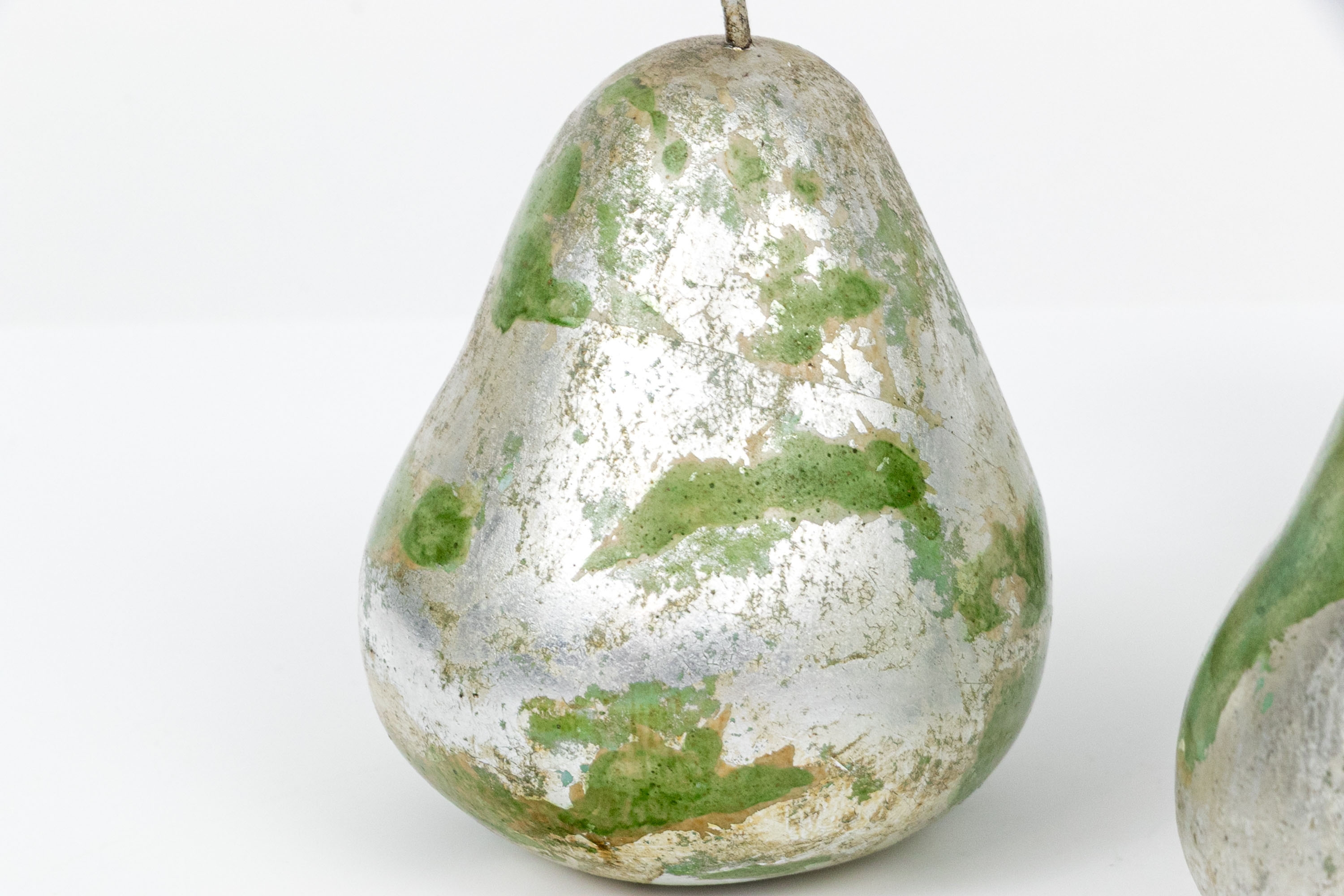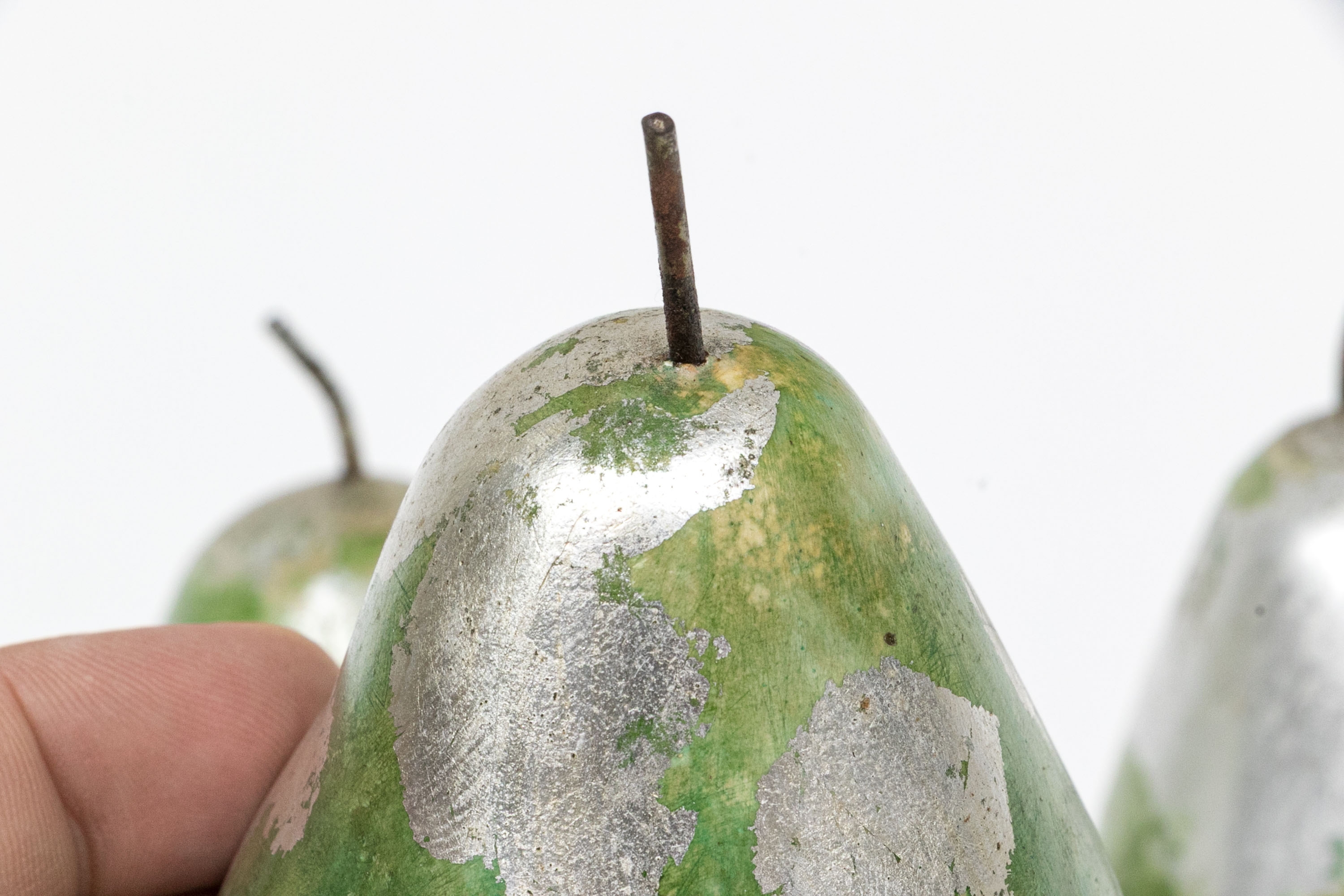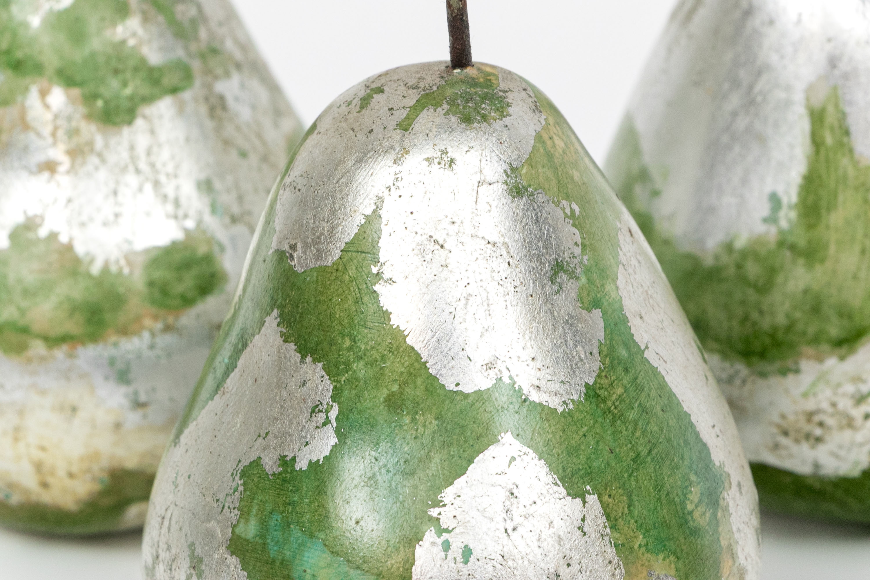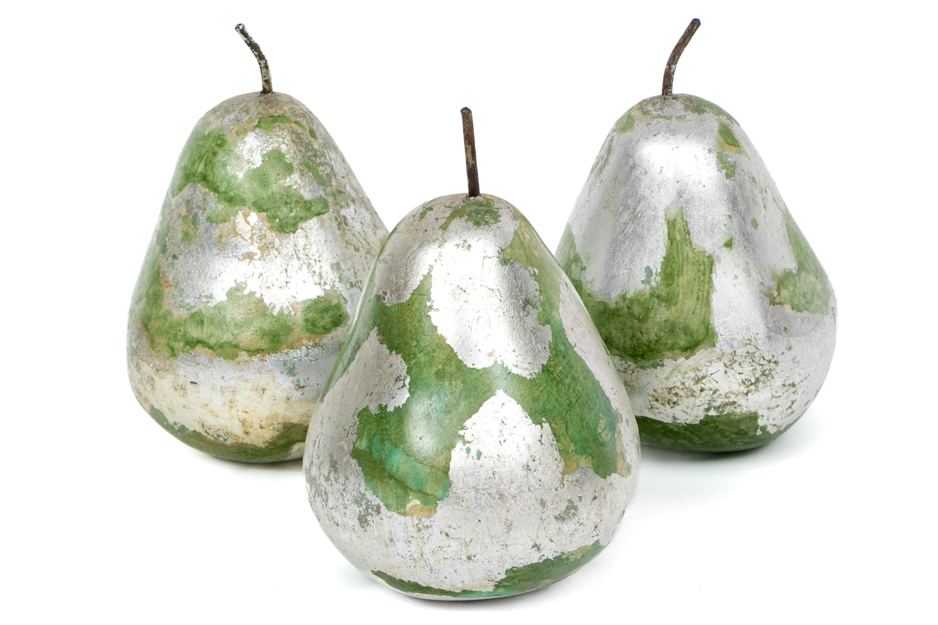 Each is a solid substrate with silver finish and green in abstract patterns. The pears are naturalistic in appearance.