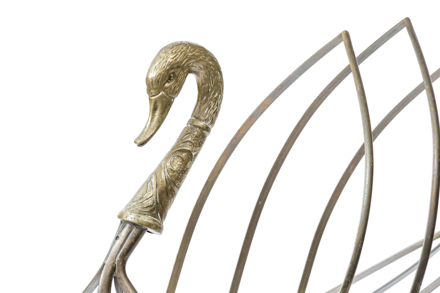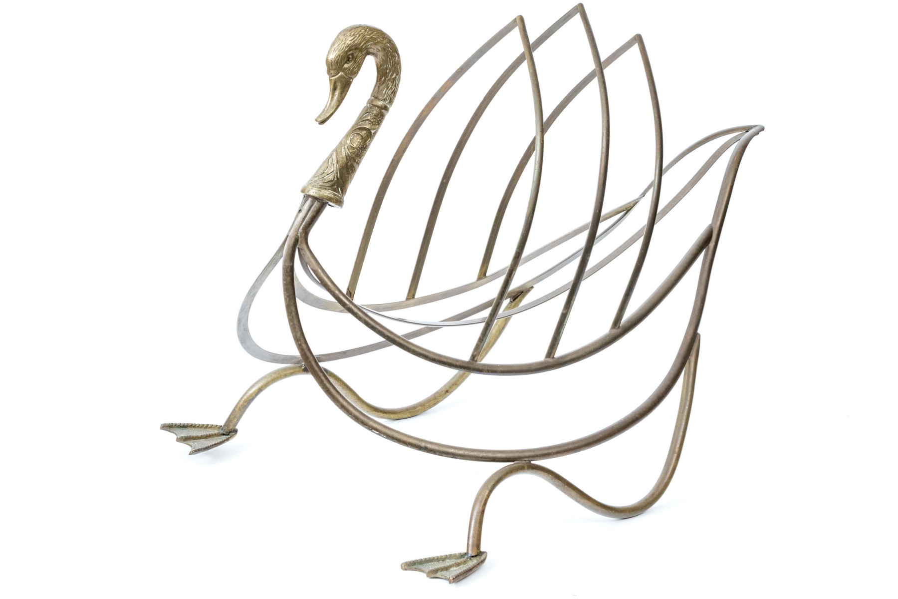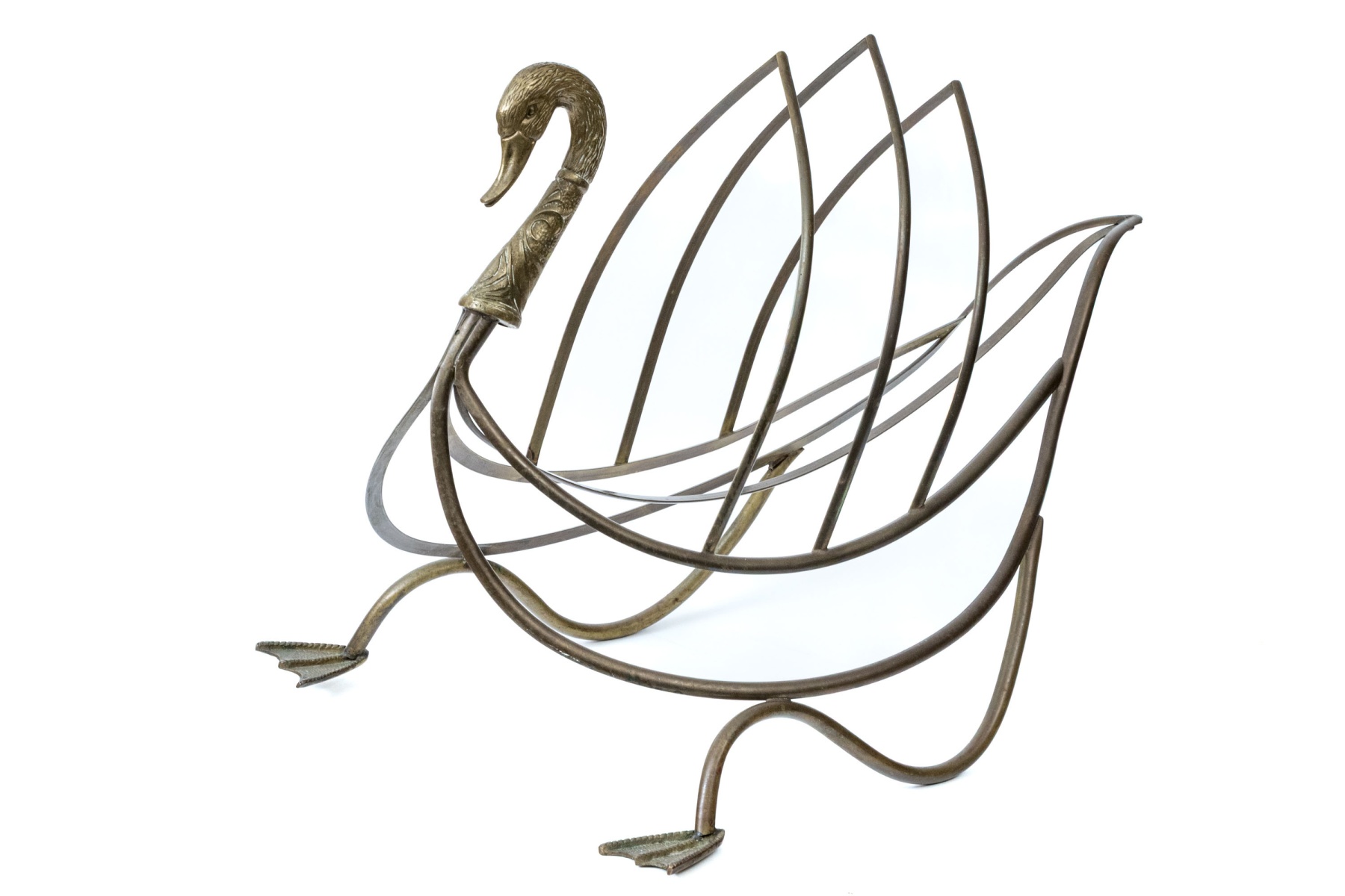 A charming vintage magazine rack in the form of a swan with a brass clad head and two pad feet supporting slats for newspaper or magazines.