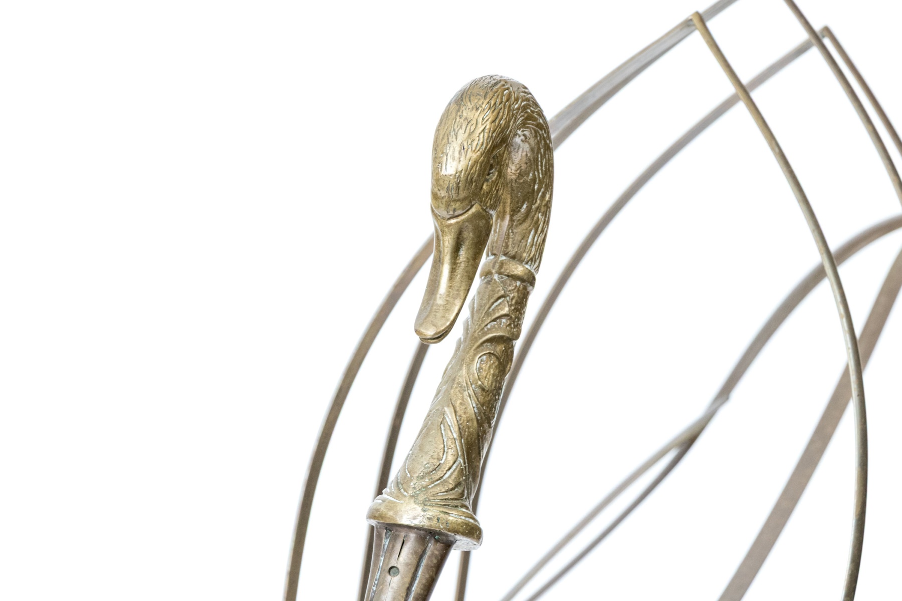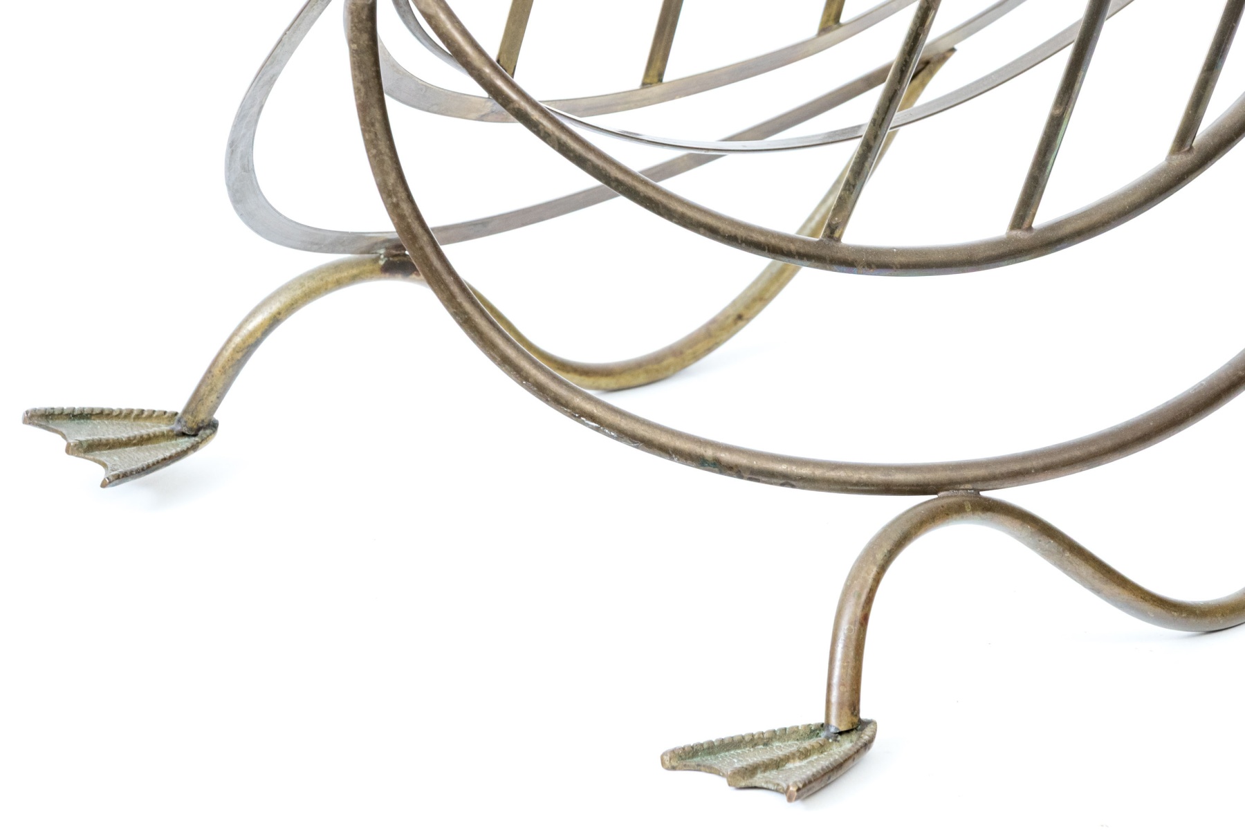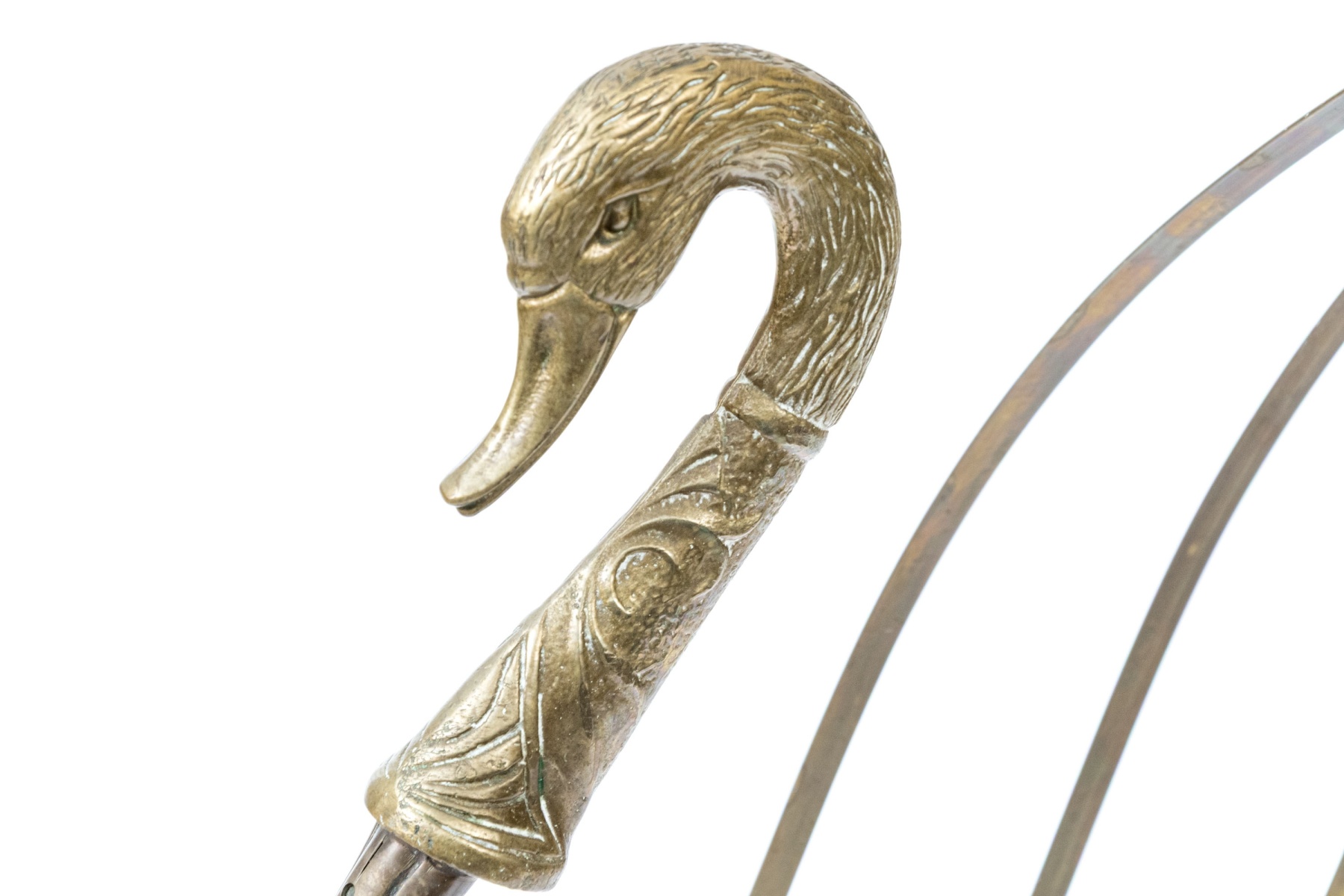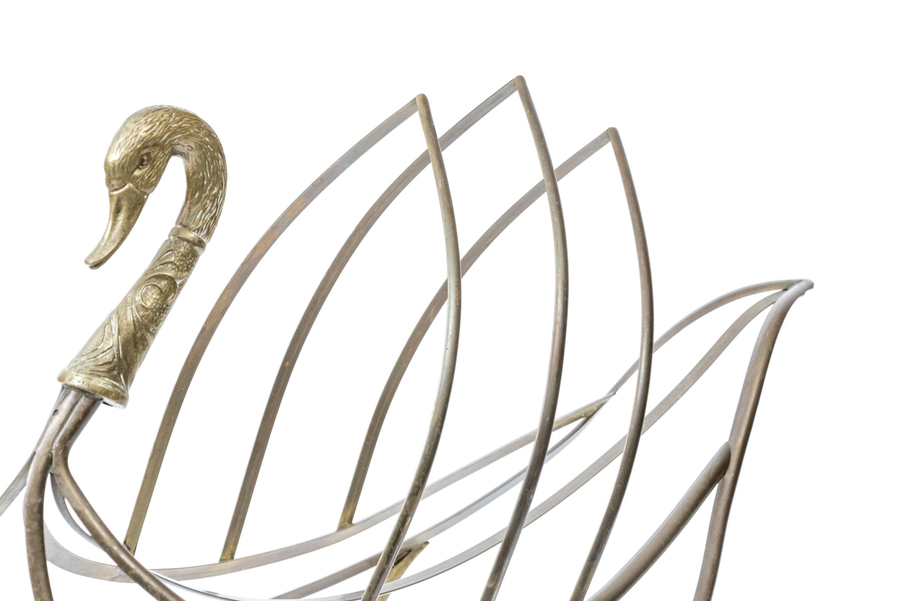 A charming vintage magazine rack in the form of a swan with a brass clad head and two pad feet supporting slats for newspaper or magazines.