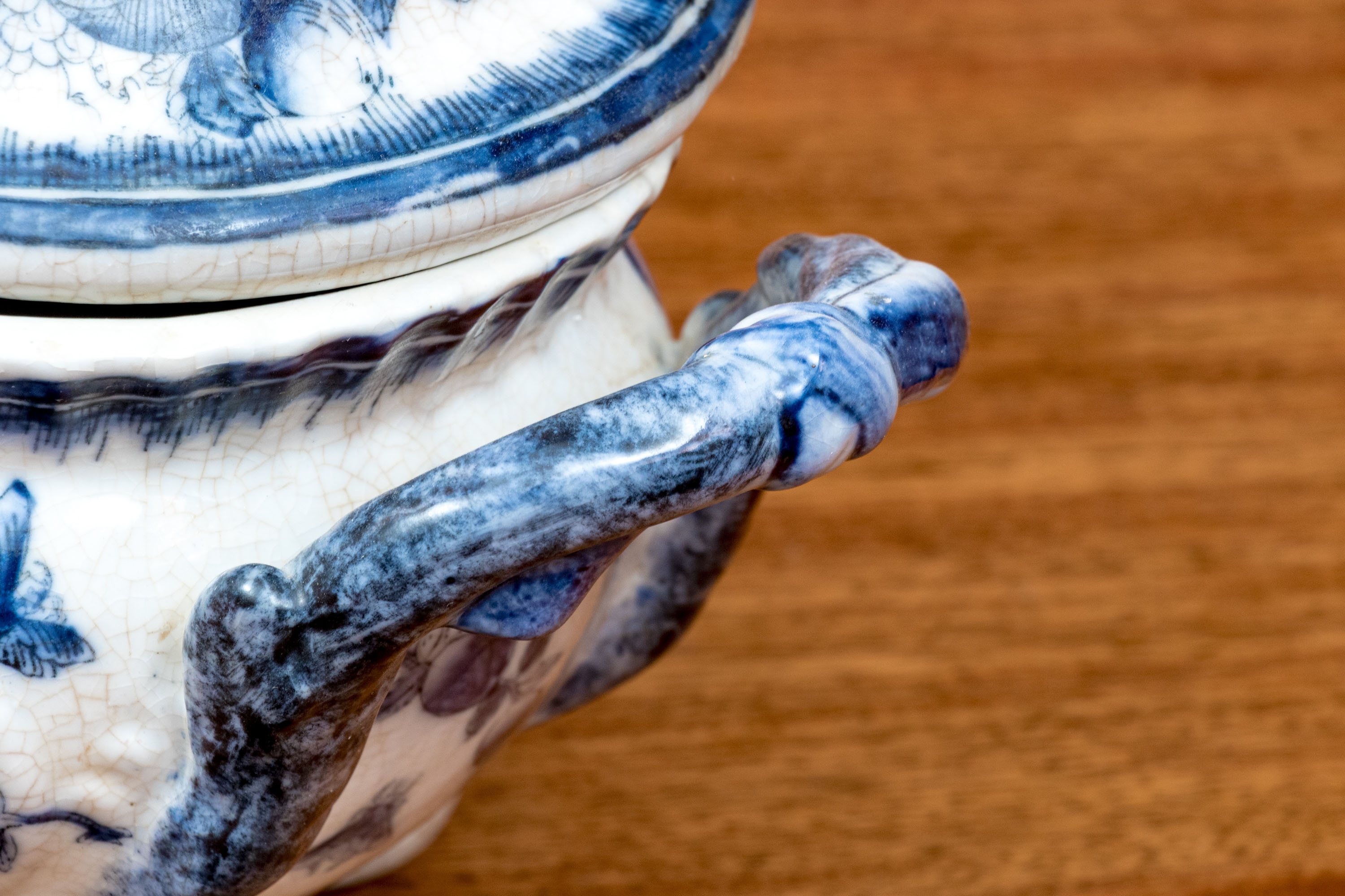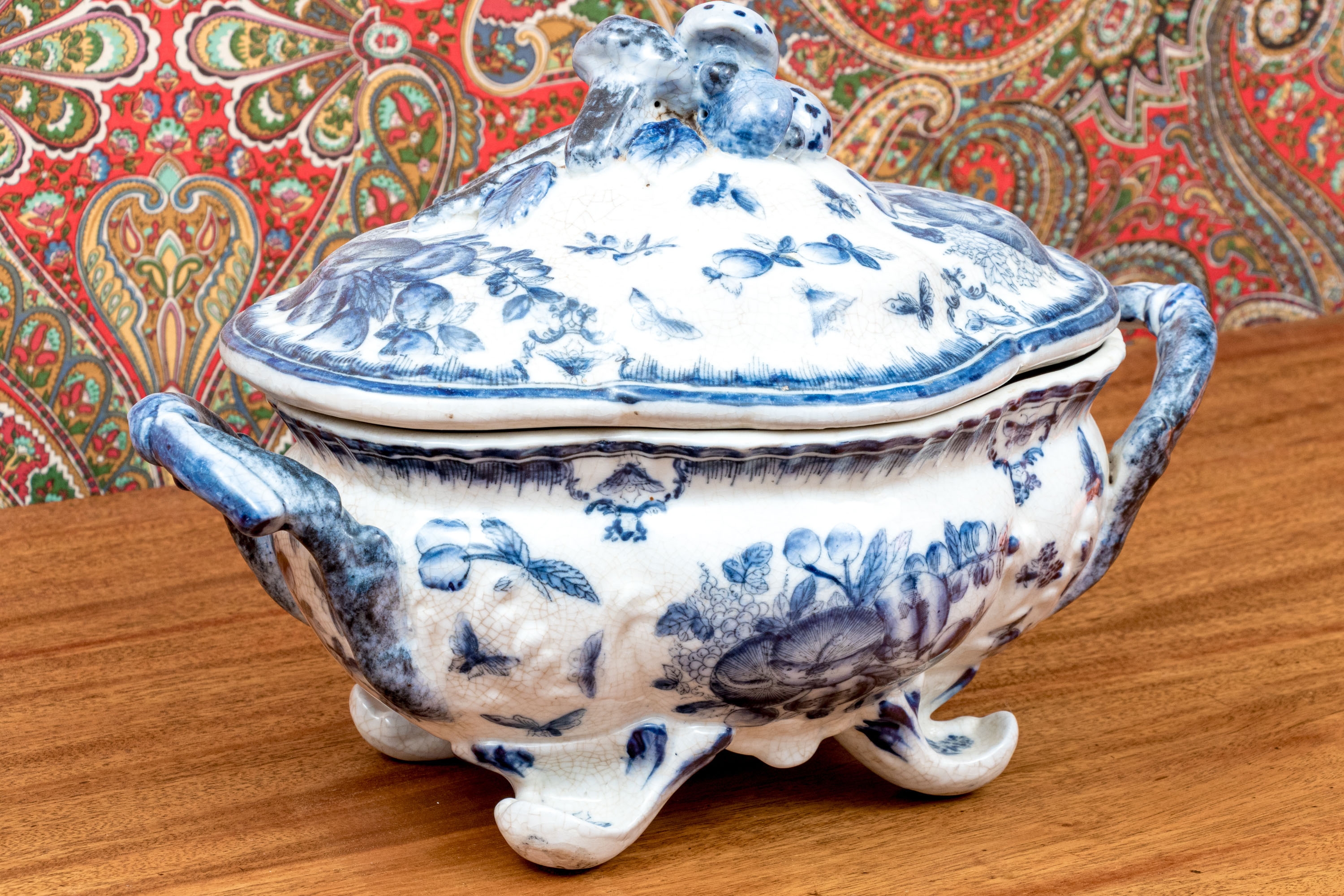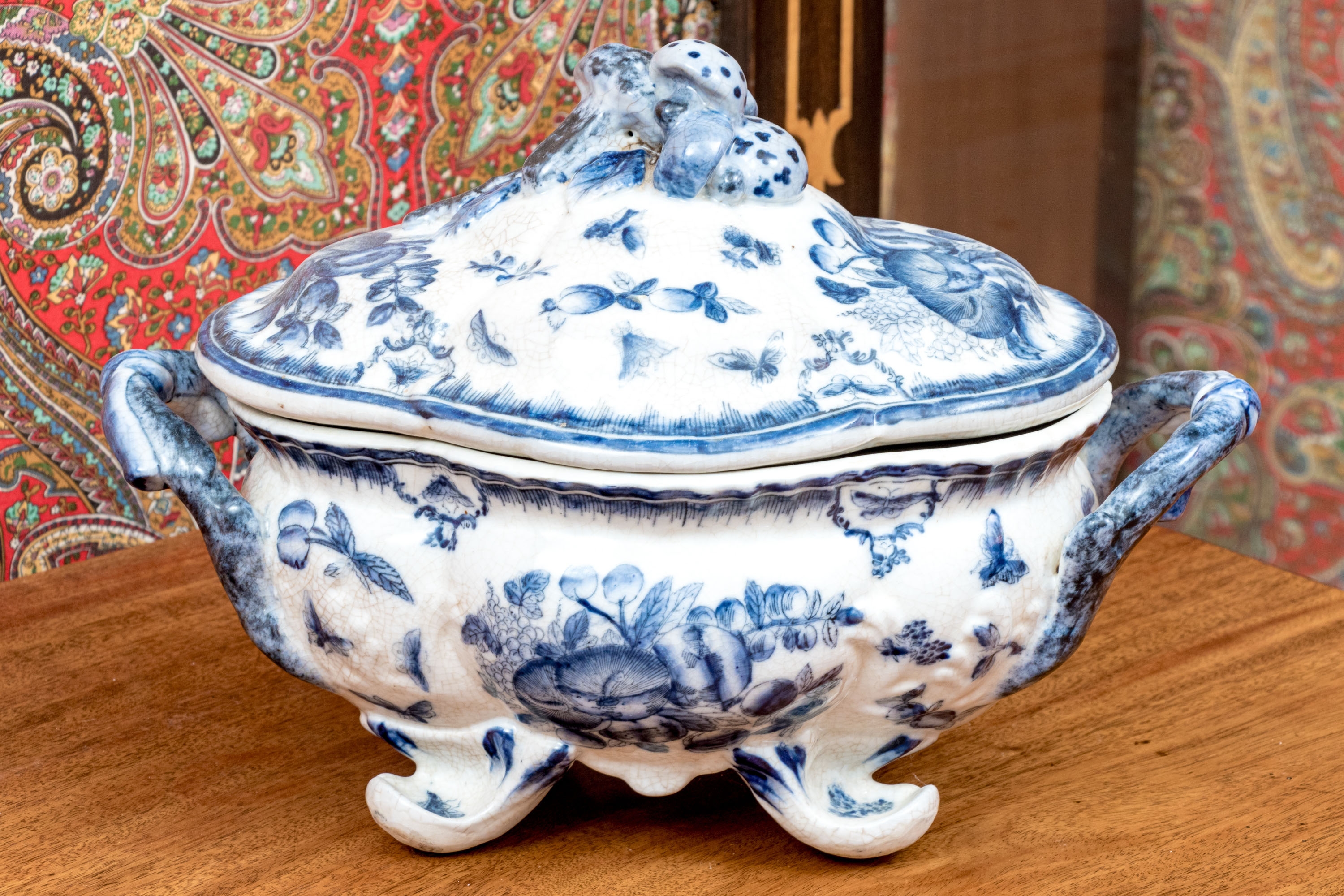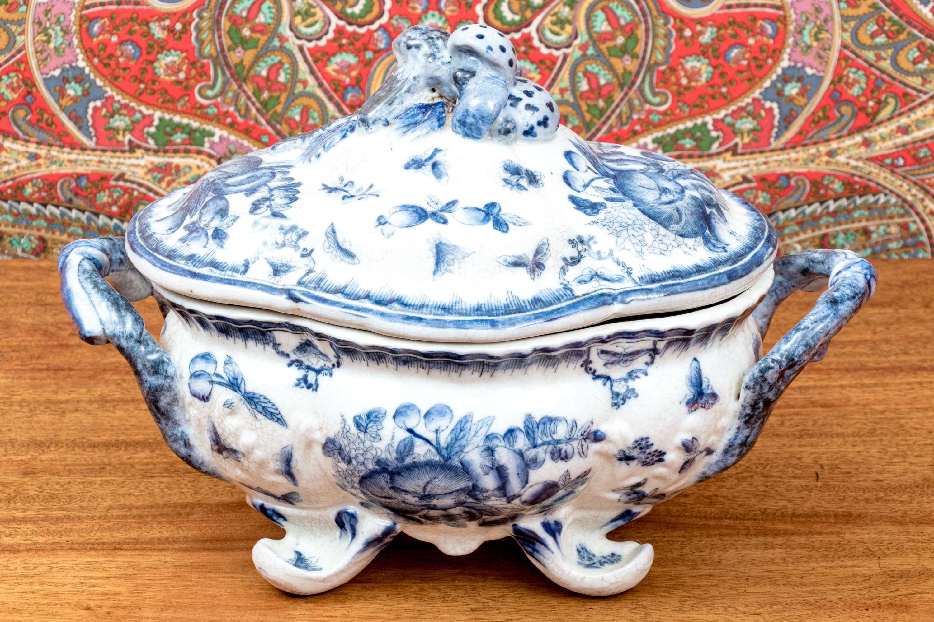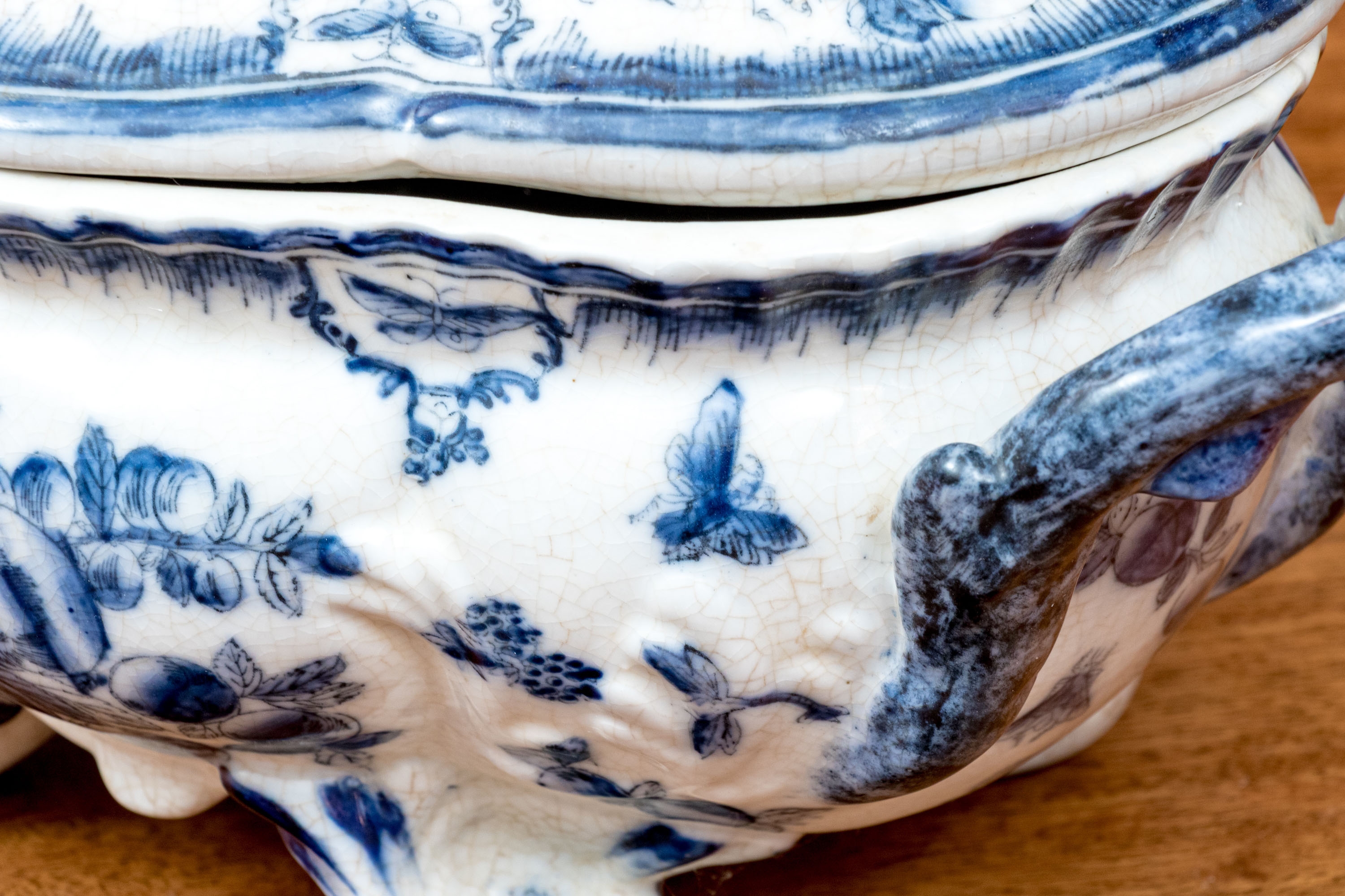 A handsome porcelain tureen with an oval quatrefoil form, showcasing a nicely domed lid with a mushroom finial complimenting scenes of foliage and moths. The body is detailed with a large center motif, flanked by dramatic branch-like handles, and raised over four swooping feet.