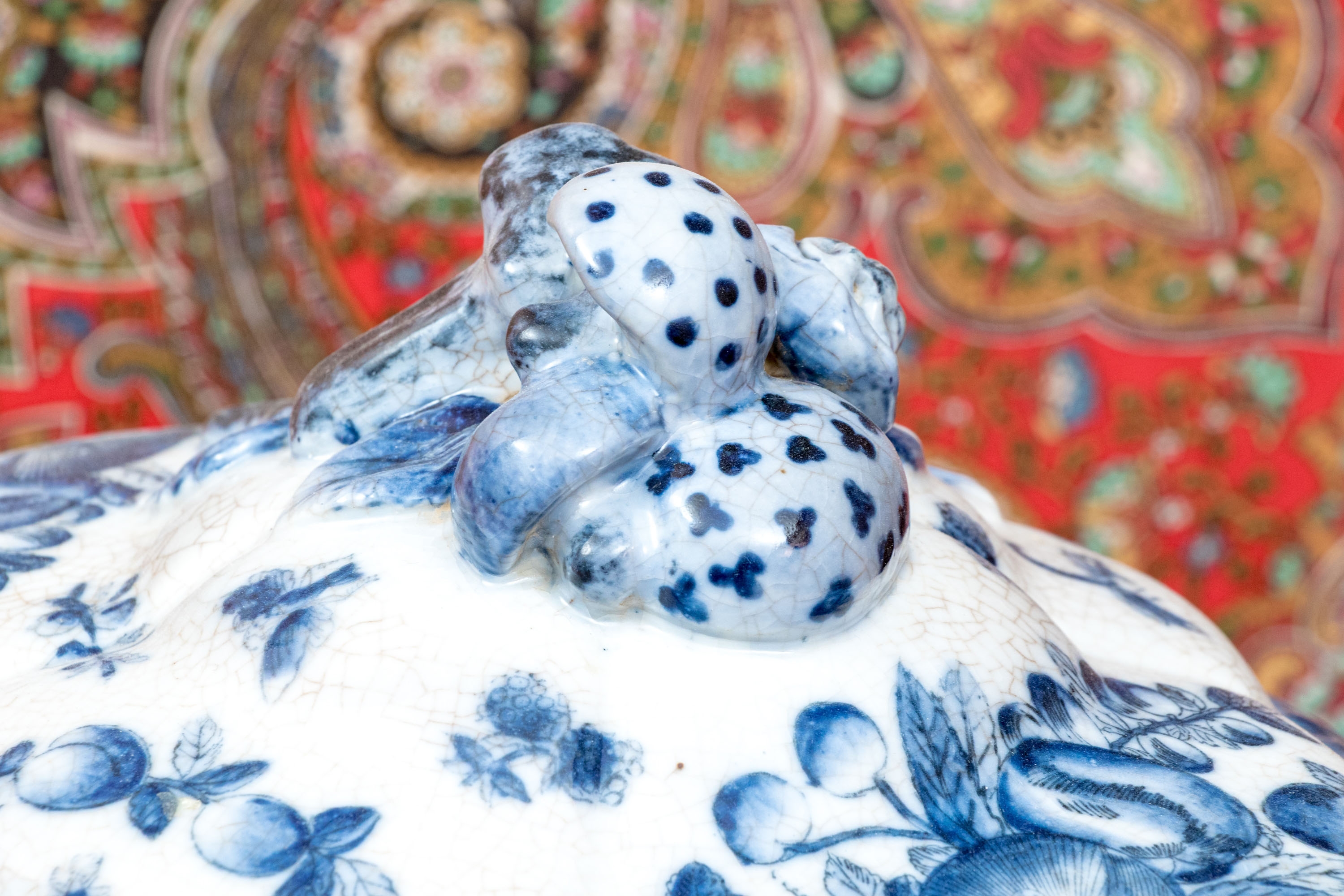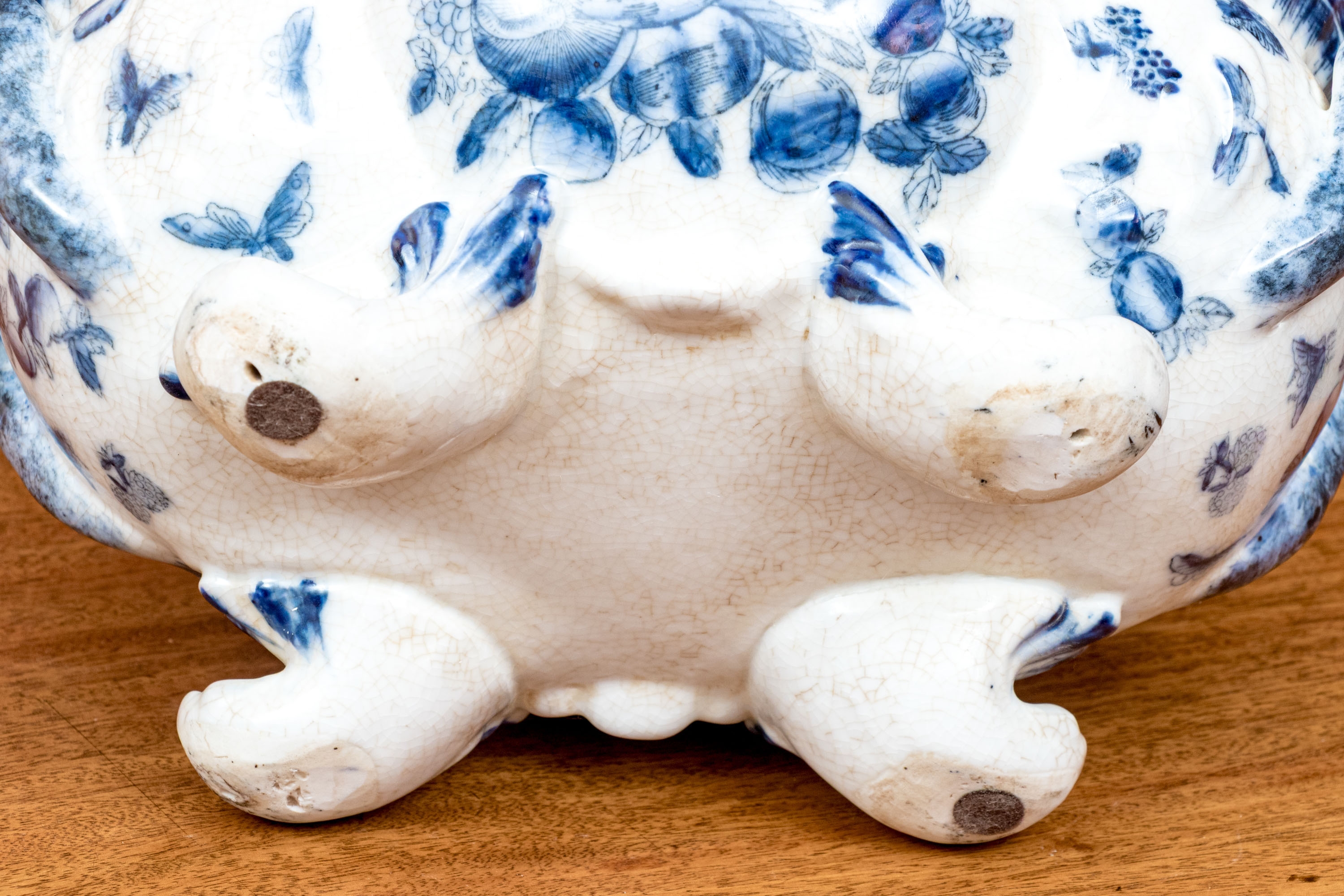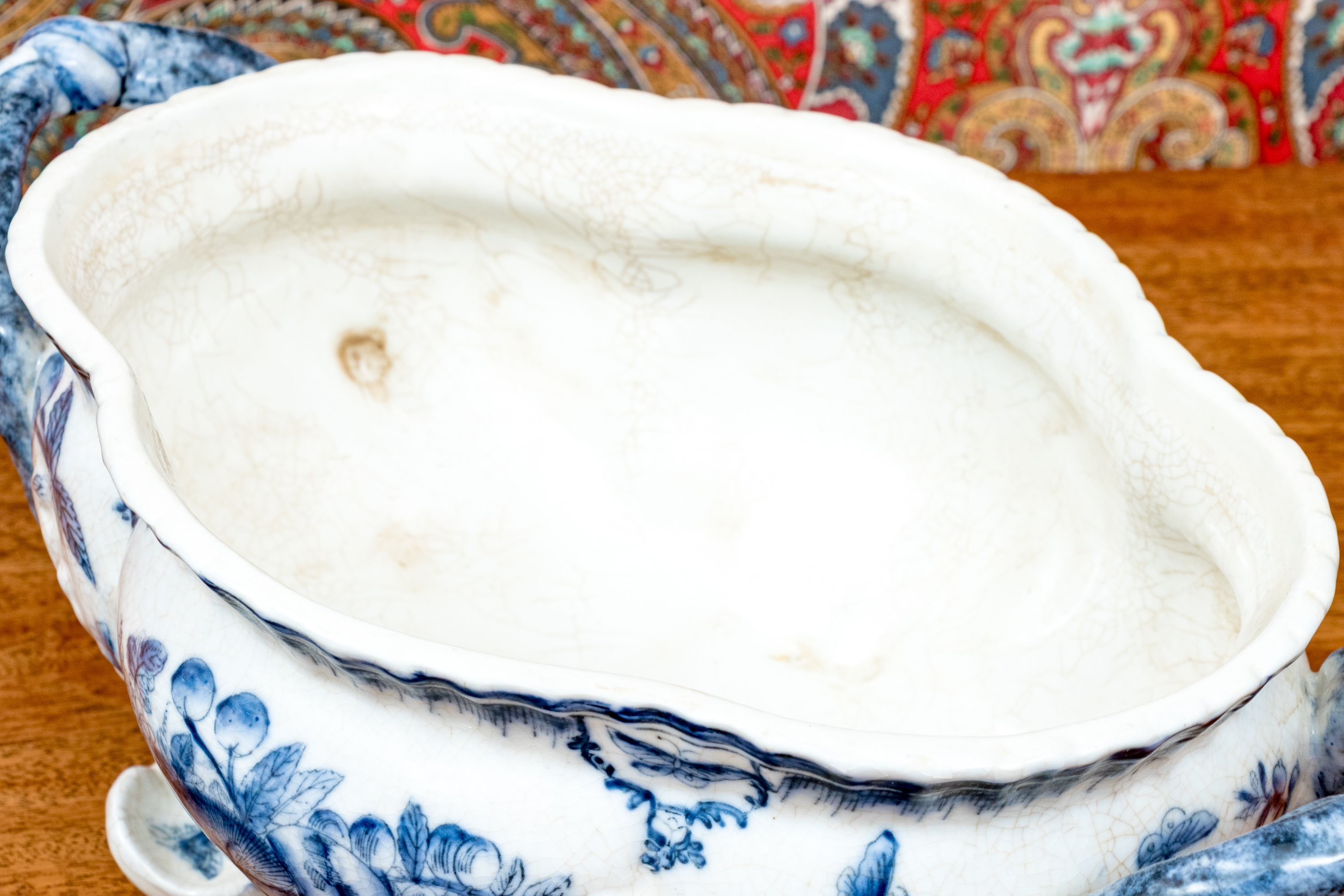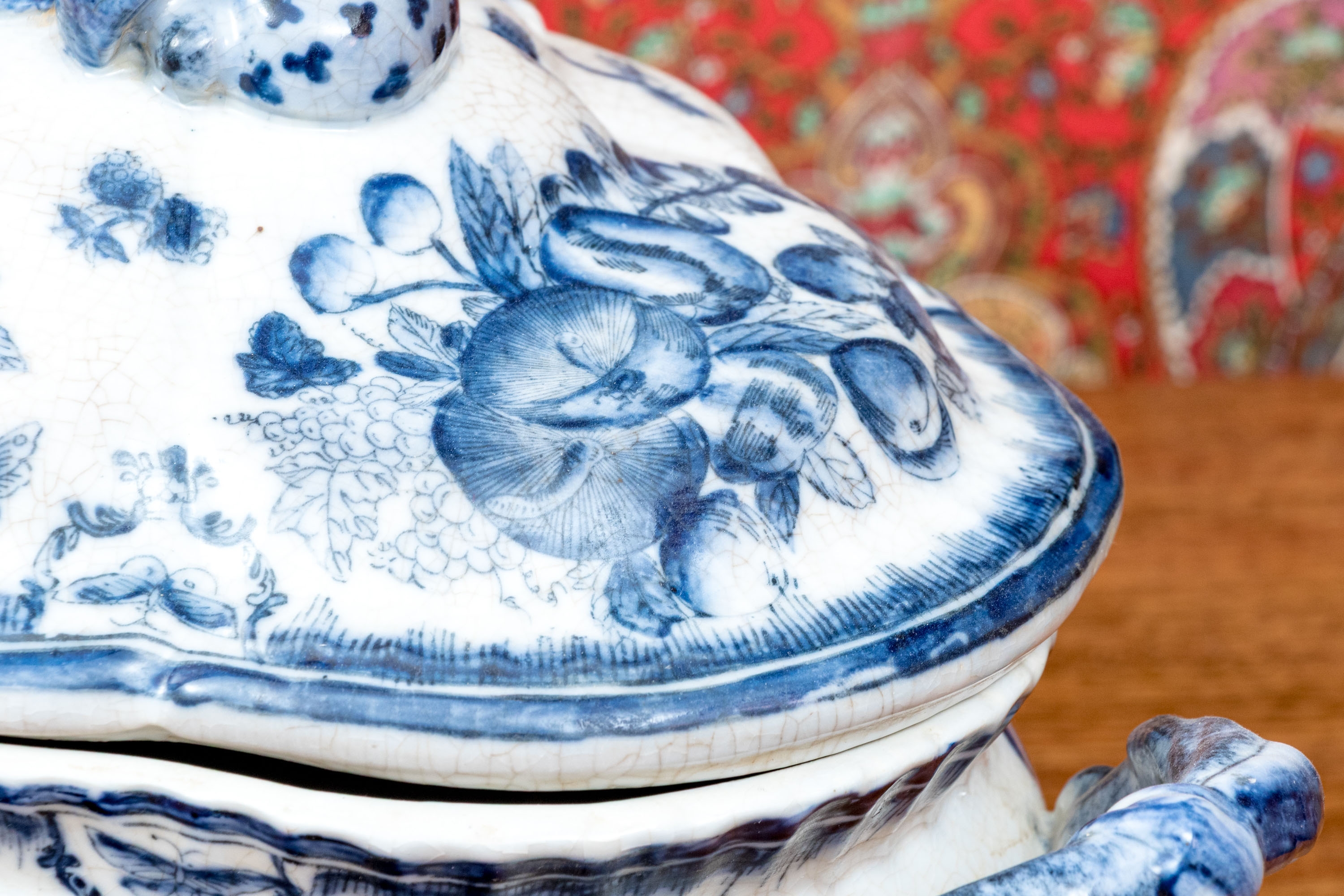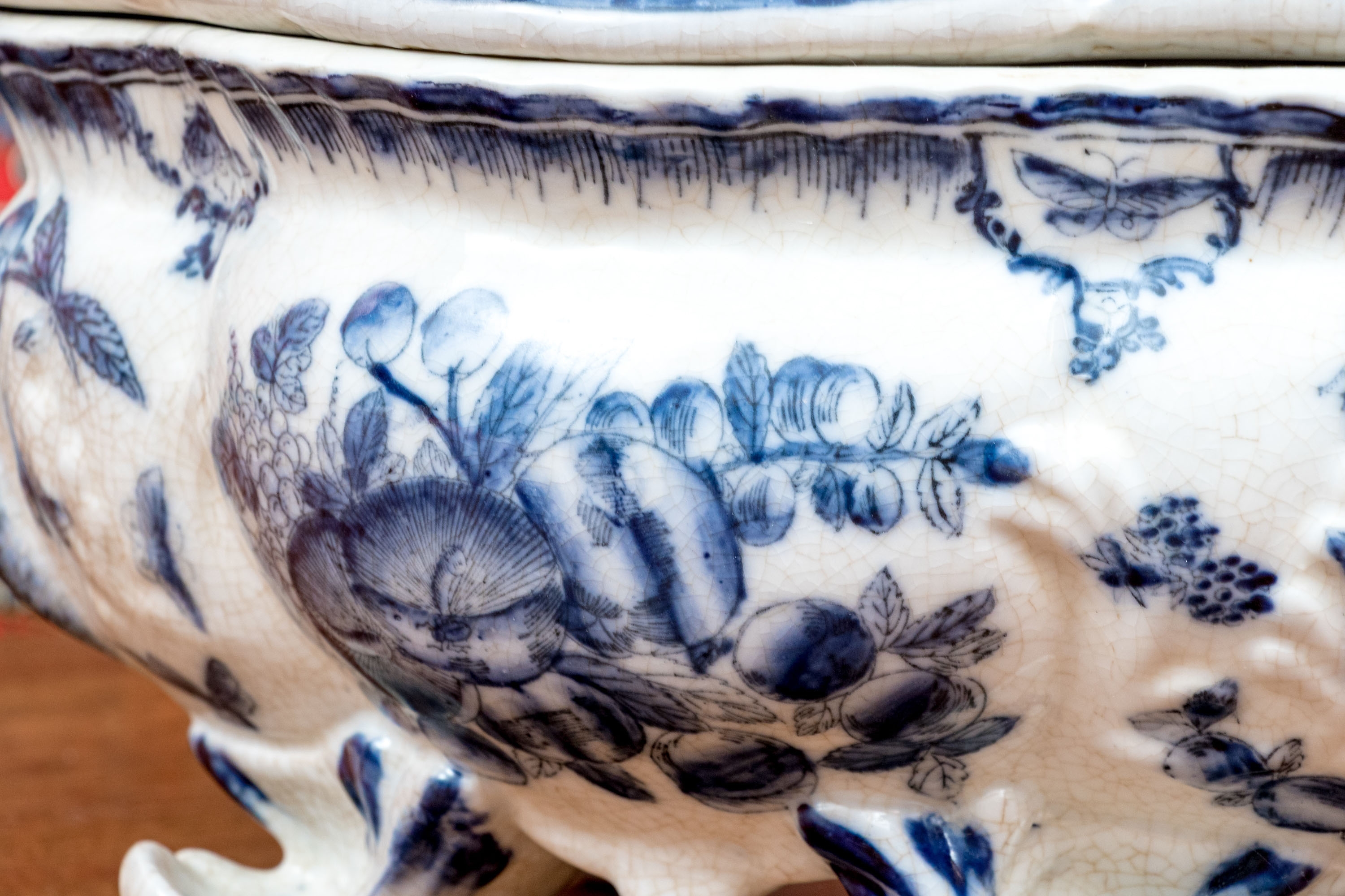A handsome porcelain tureen with an oval quatrefoil form, showcasing a nicely domed lid with a mushroom finial complimenting scenes of foliage and moths. The body is detailed with a large center motif, flanked by dramatic branch-like handles, and raised over four swooping feet.