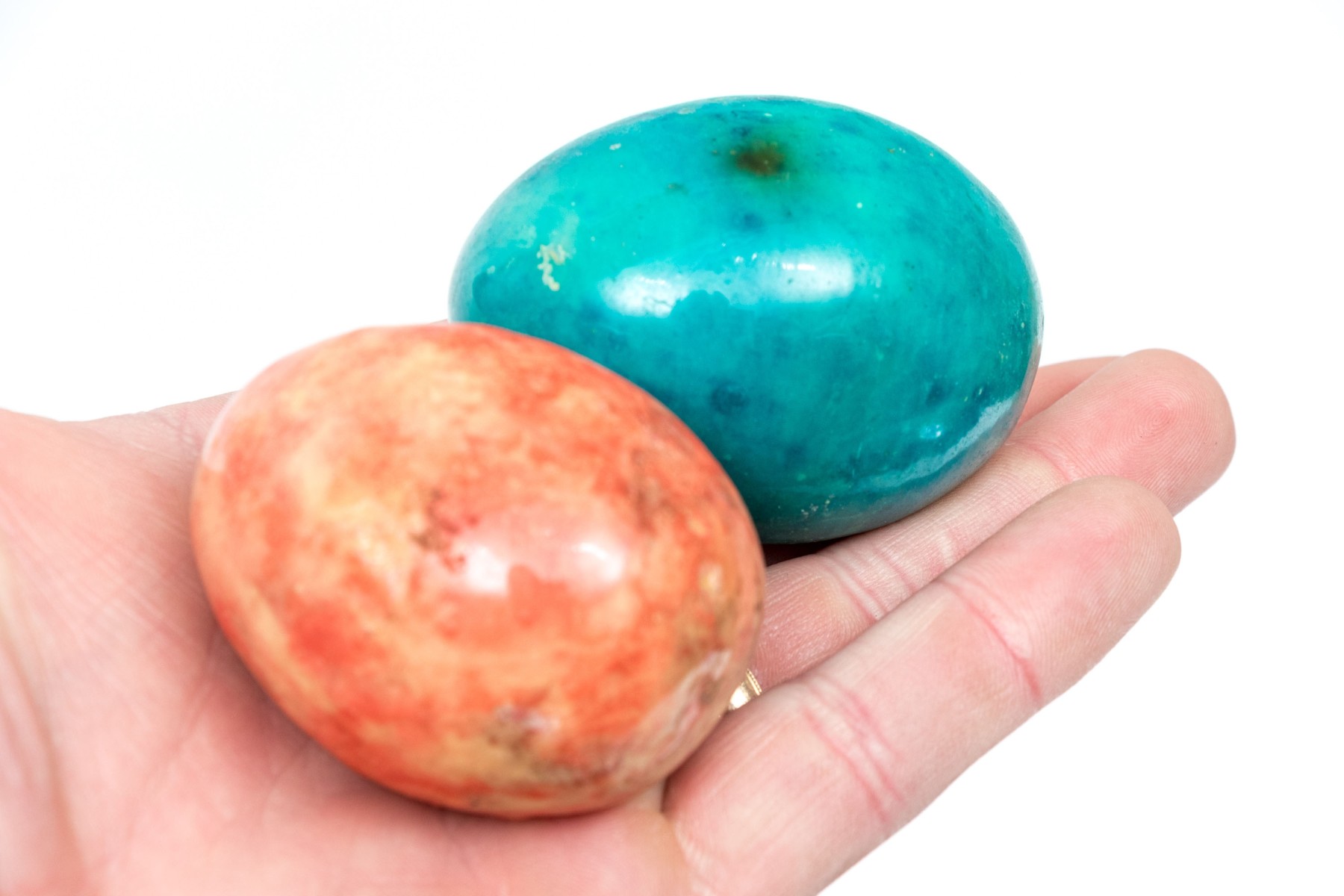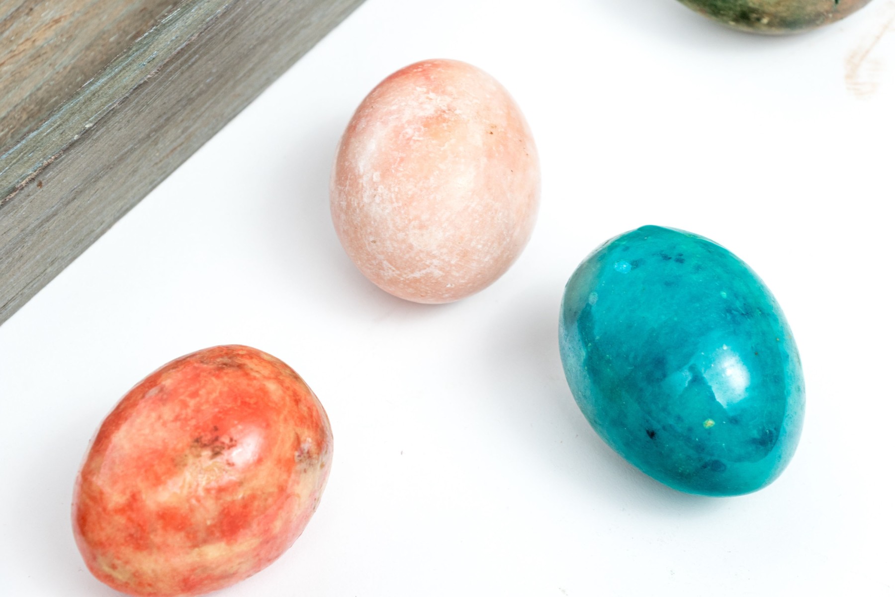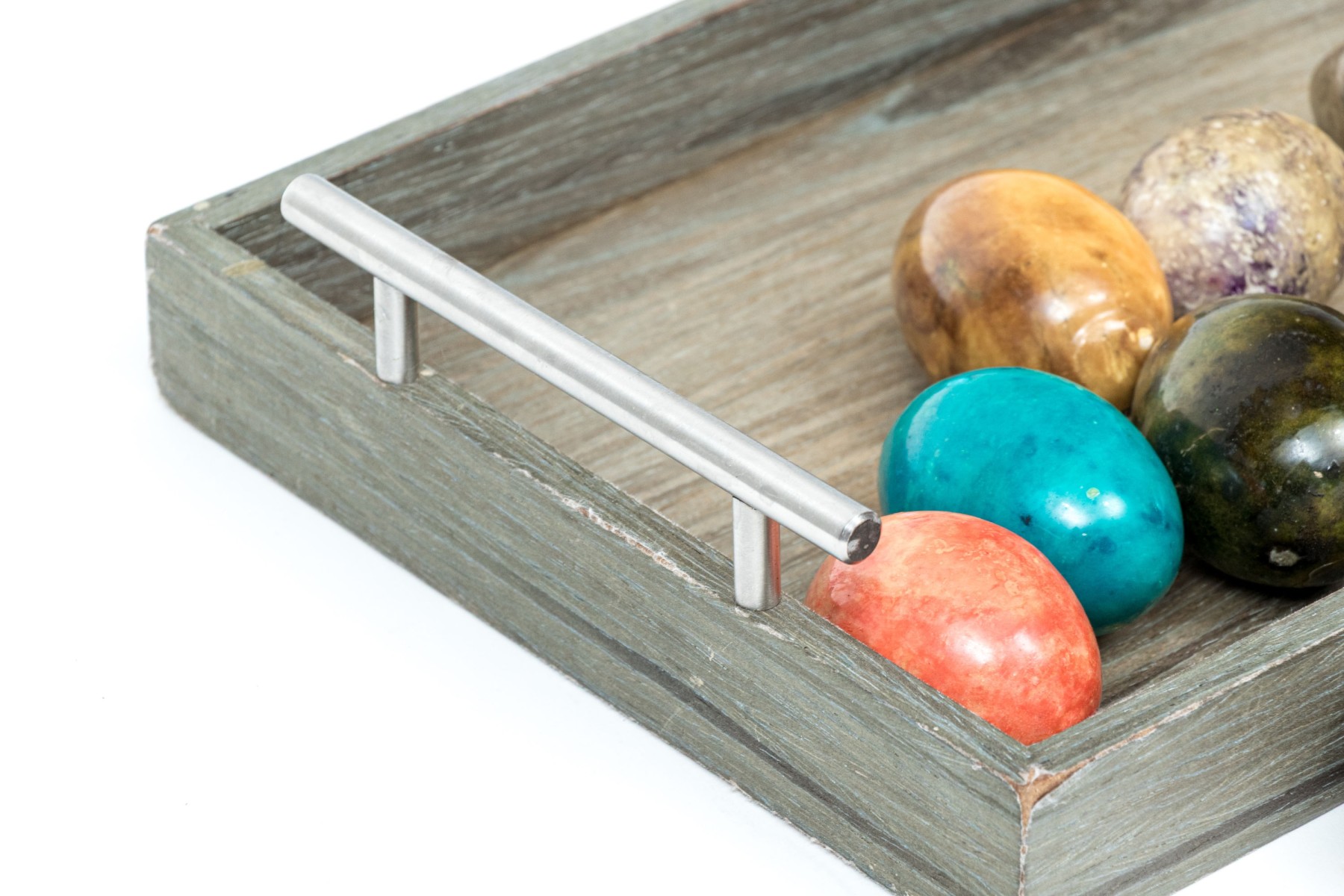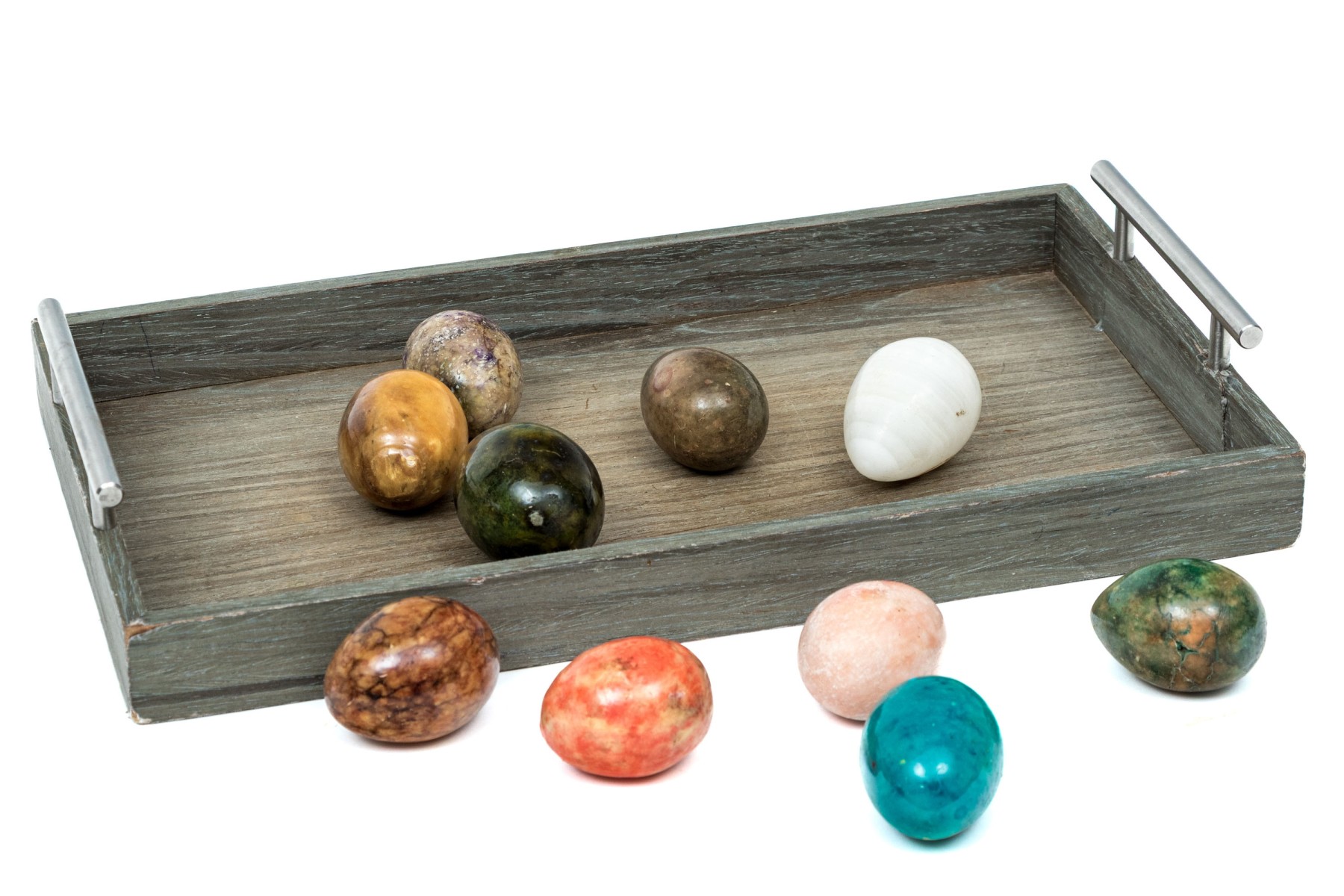 Decorative twin handled tray with two chrome handles and ten carved and polished stone eggs.