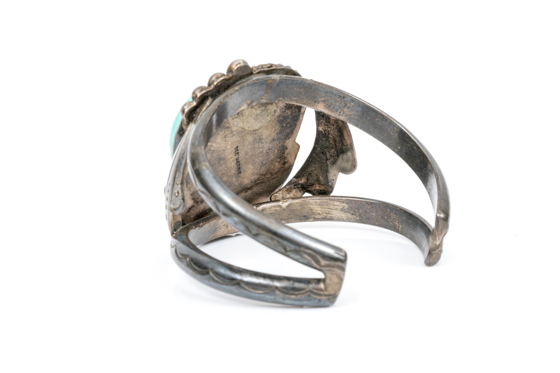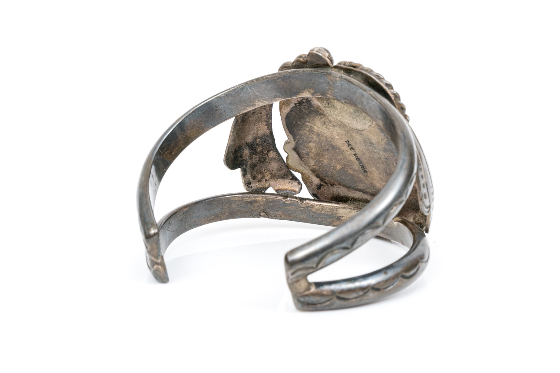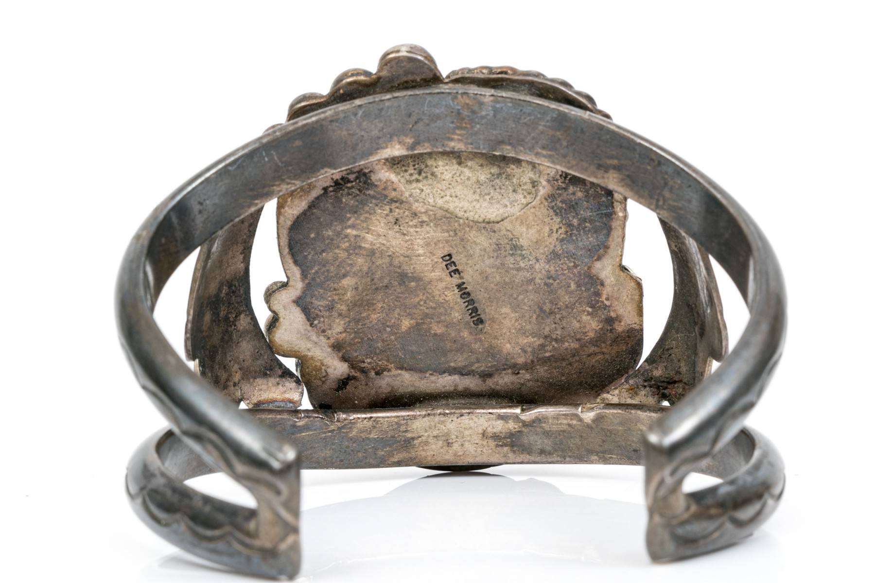 Dee Morris sterling silver and rope and fan edged turquoise Southwestern style cuff bracelet