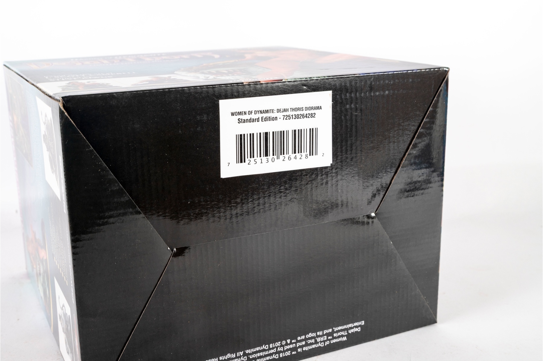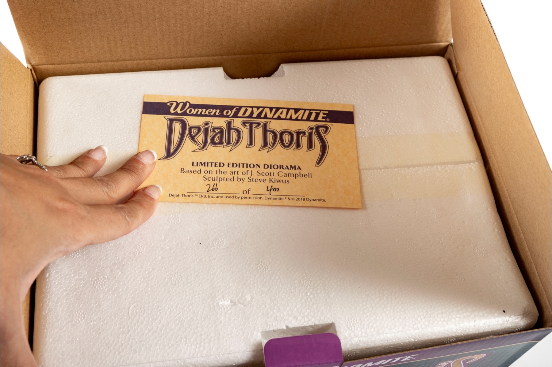 From the Women of Dynamite collectible line, this stunning Dejah Thoris limited edition diorama brings the legendary Princess of Mars to life, inspired by the art of J. Scott Campbell and sculpted by Steve Kiwus. Produced by Dynamite Entertainment and The Brewing Factory, the piece captures the alluring Martian queen seated regally beside a roaring great cat of Barsoom, featuring exquisite sculptural detail and rich paintwork.