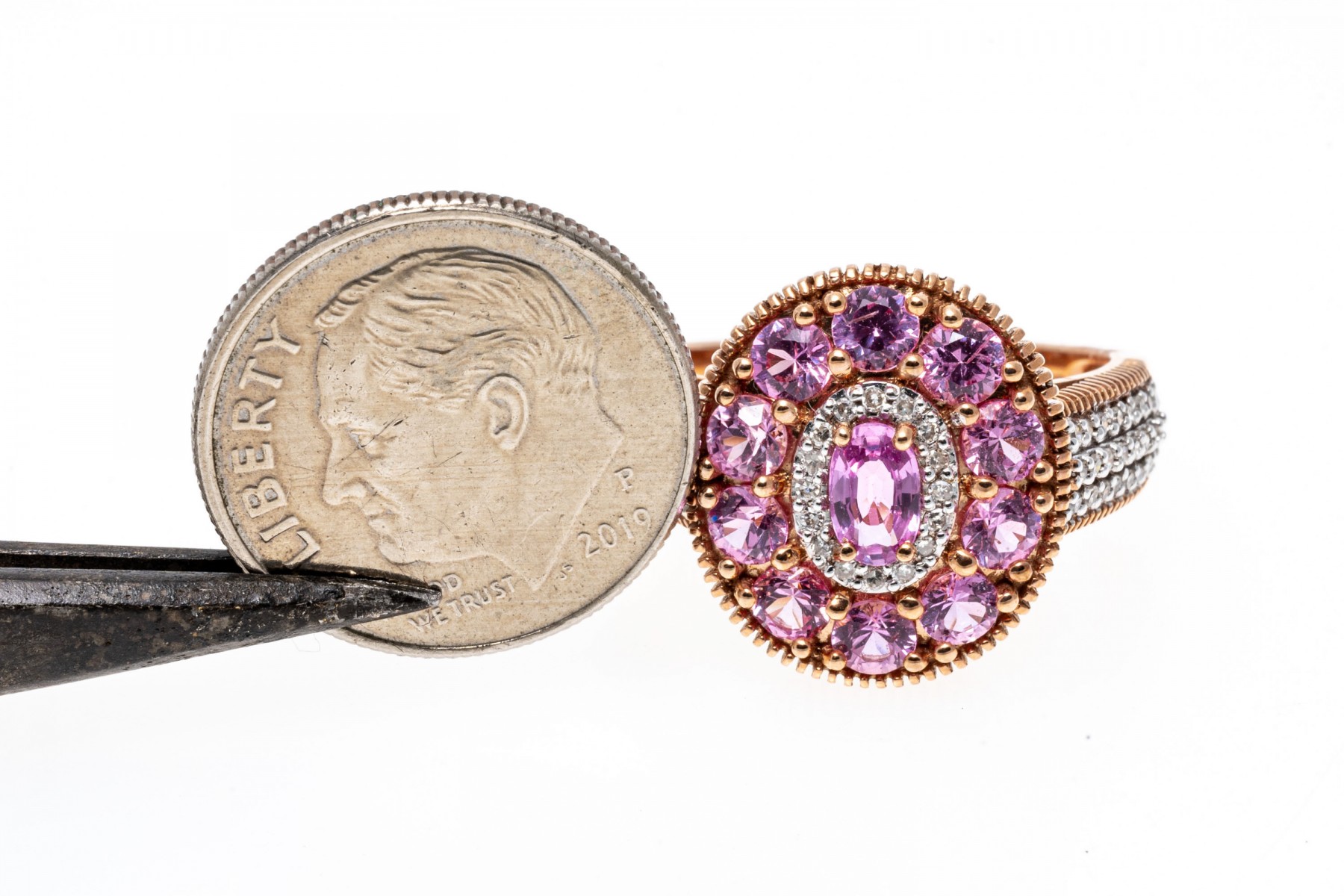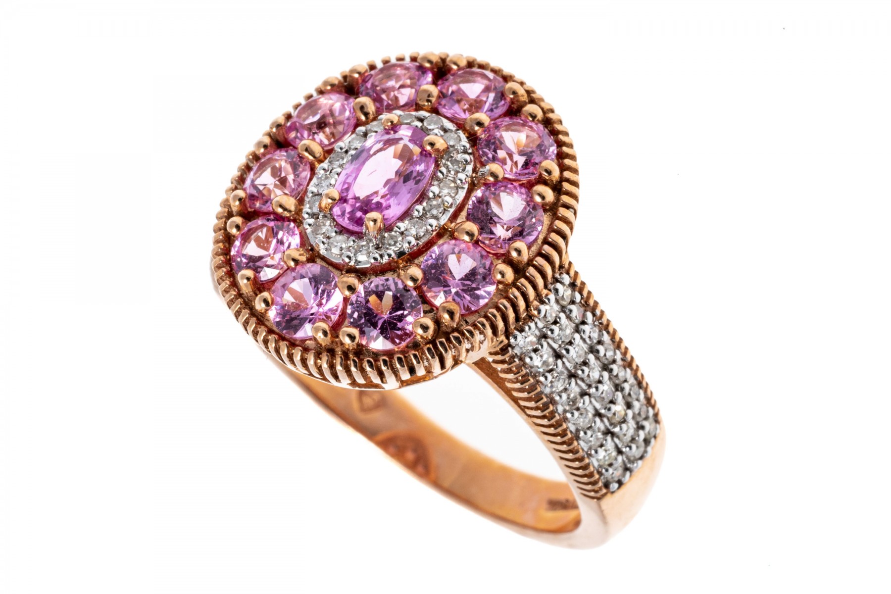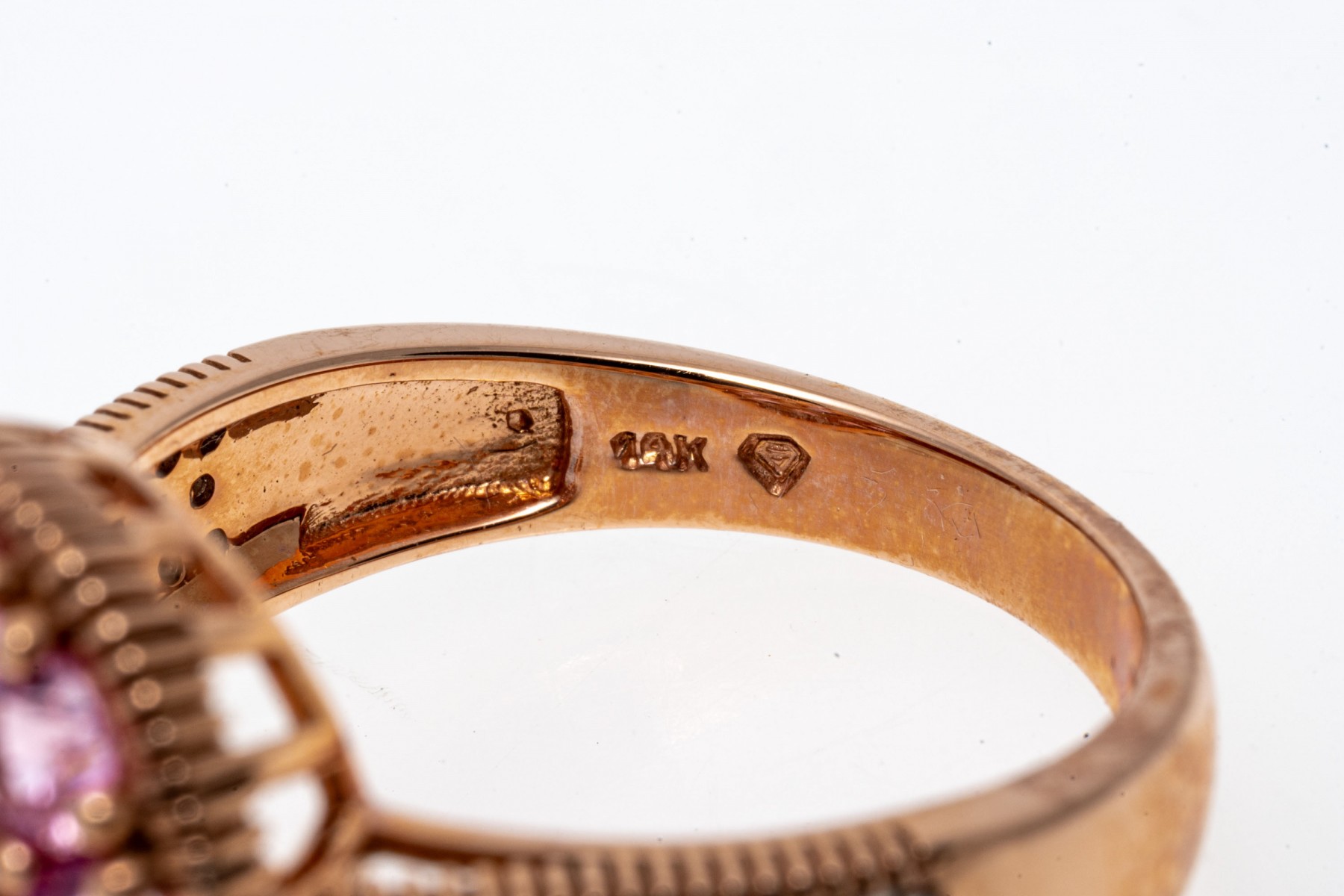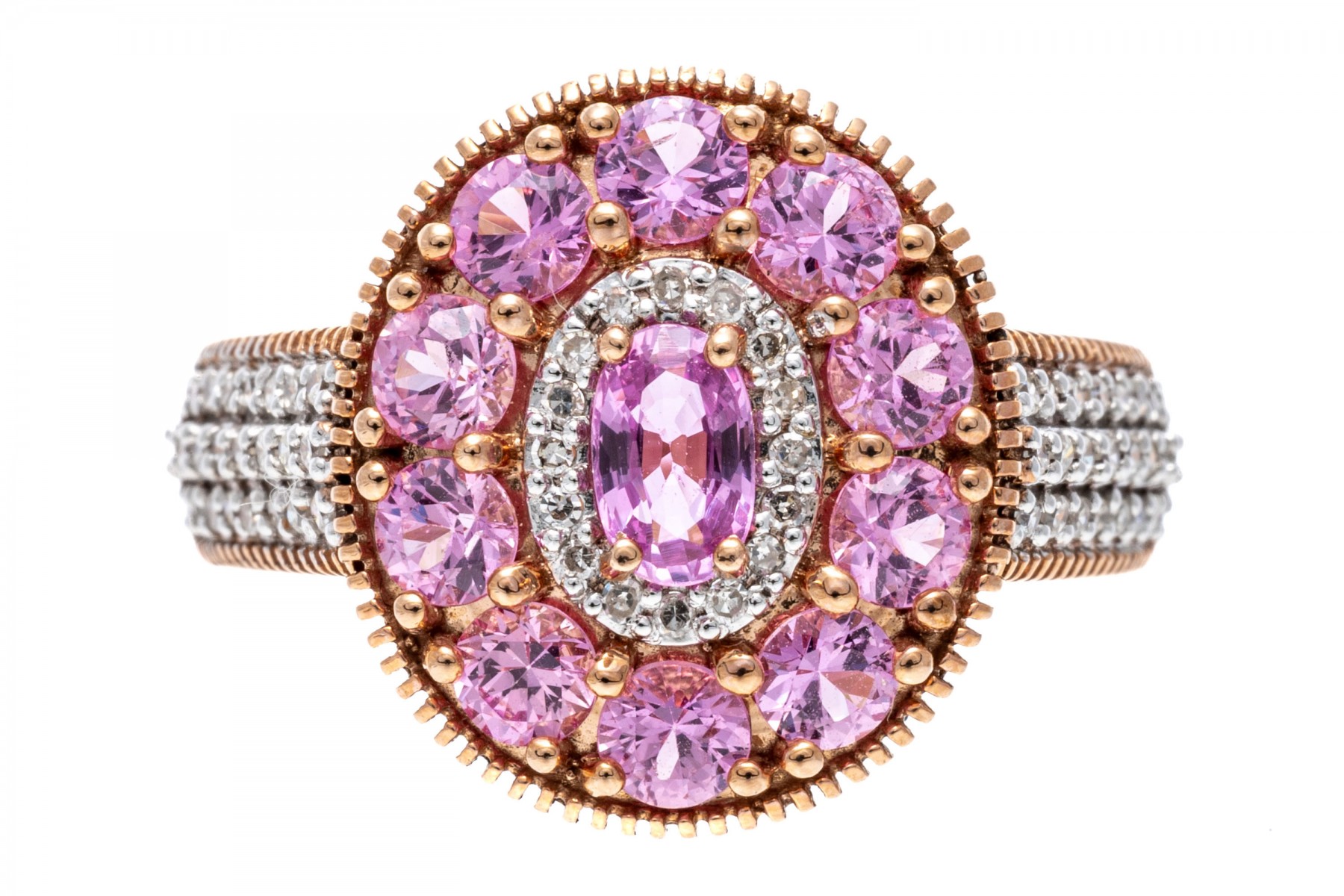 A 14K gold ring set with light to pale pink round cut sapphires surrounding a single oval cut at the center. Accent diamonds add a bright shine. Sapphires are approximately 1.39 TCW. Ring size 7.