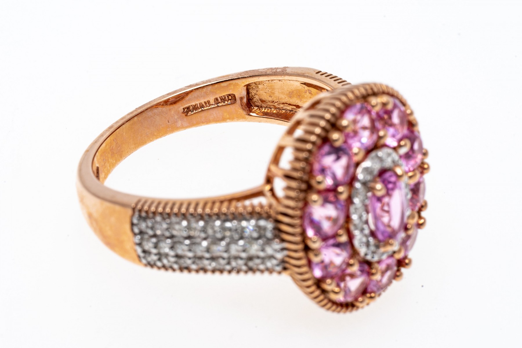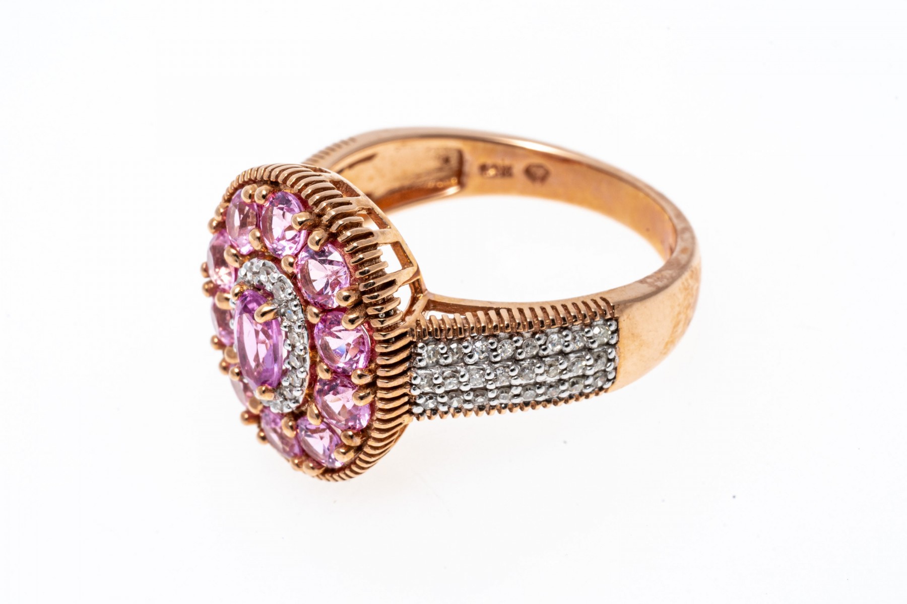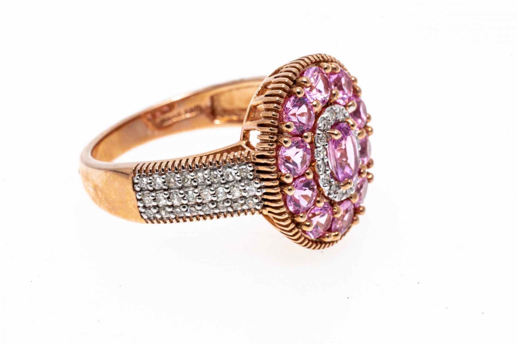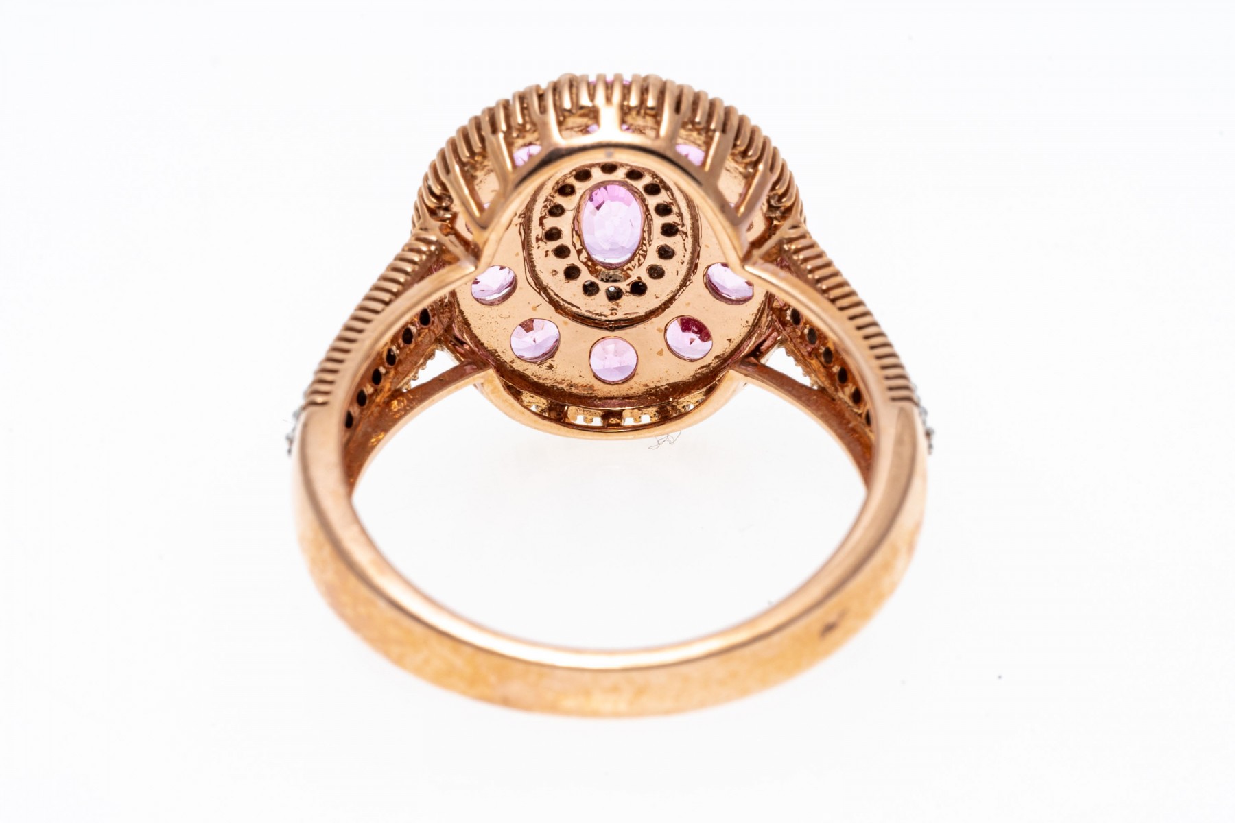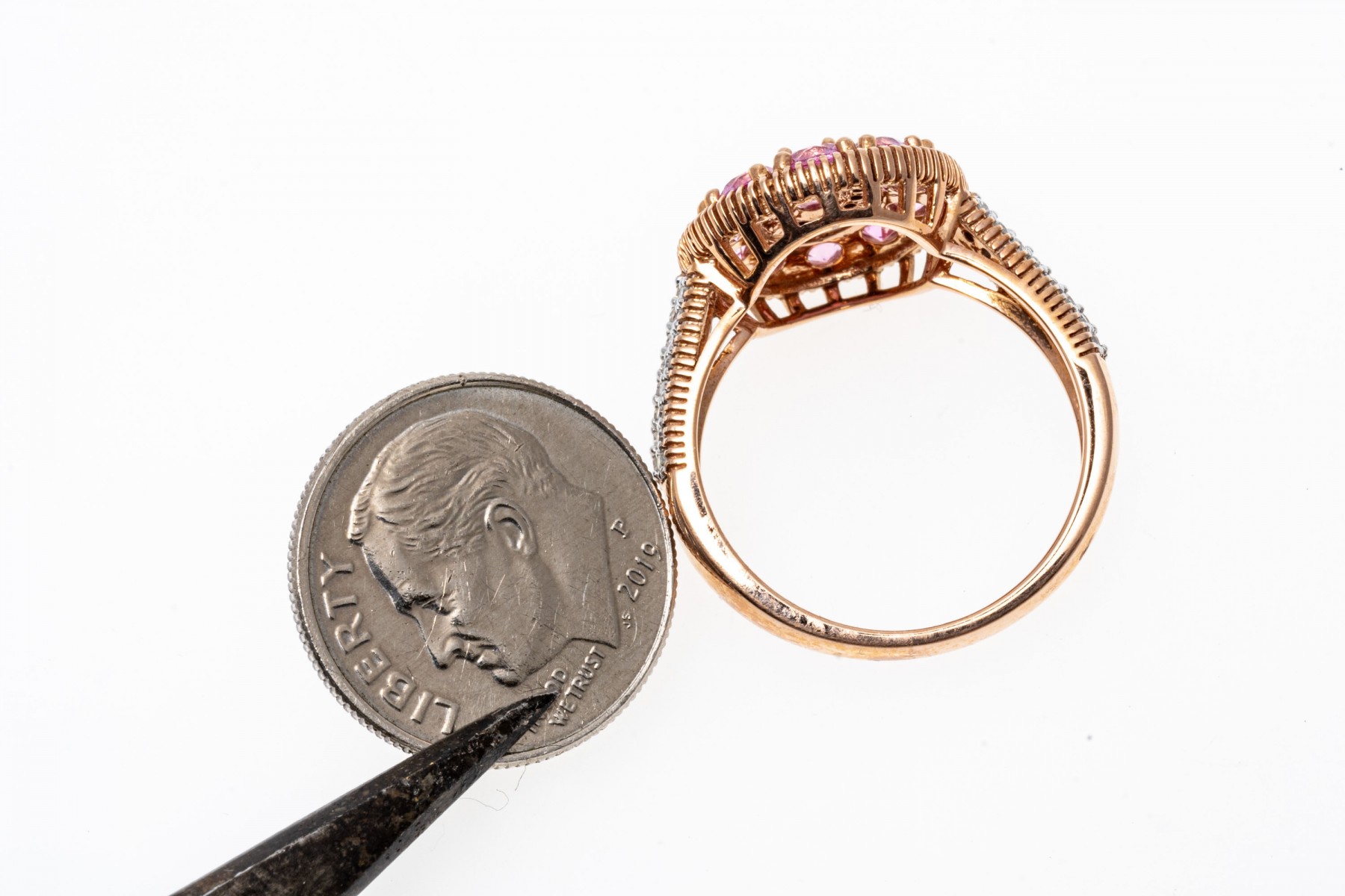 A 14K gold ring set with light to pale pink round cut sapphires surrounding a single oval cut at the center. Accent diamonds add a bright shine. Sapphires are approximately 1.39 TCW. Ring size 7.
