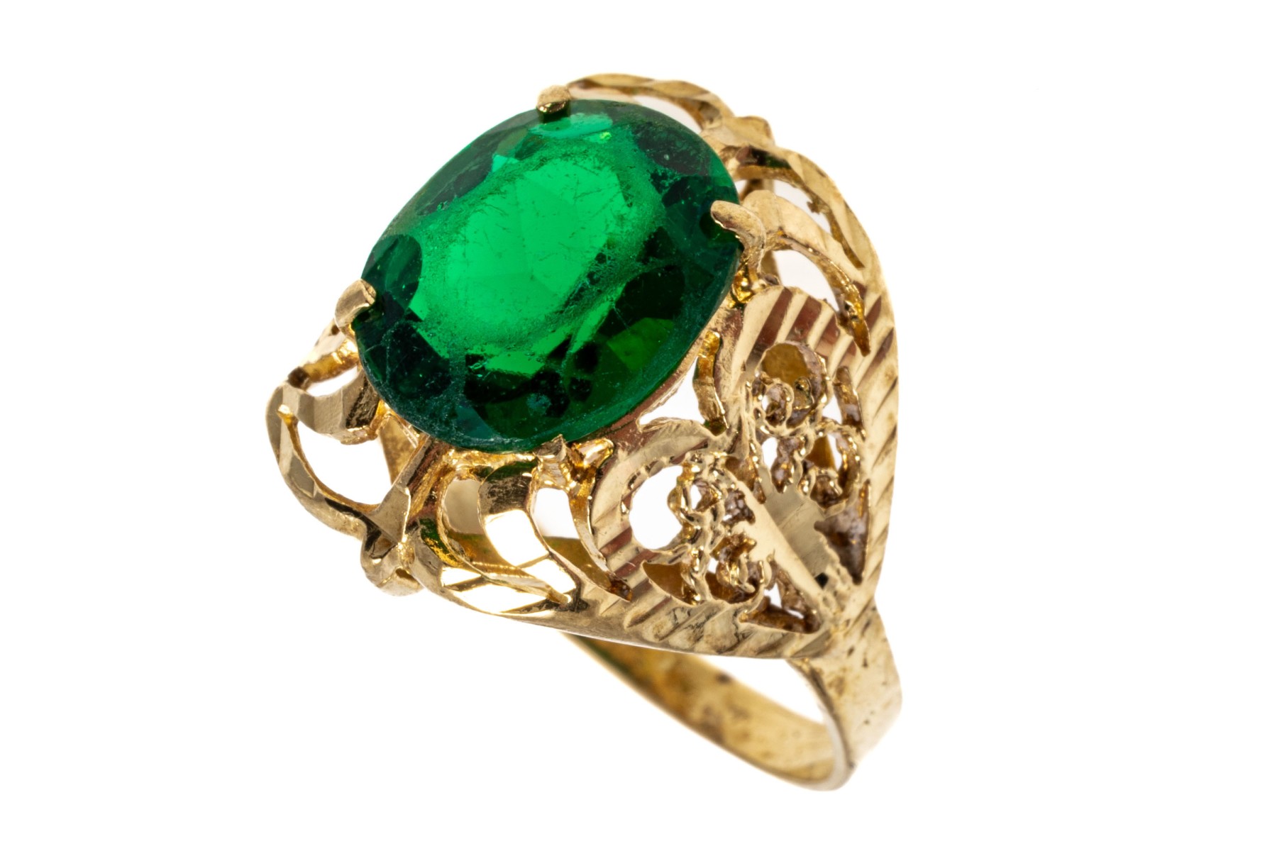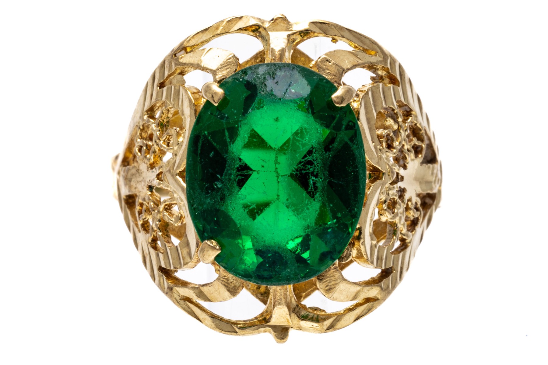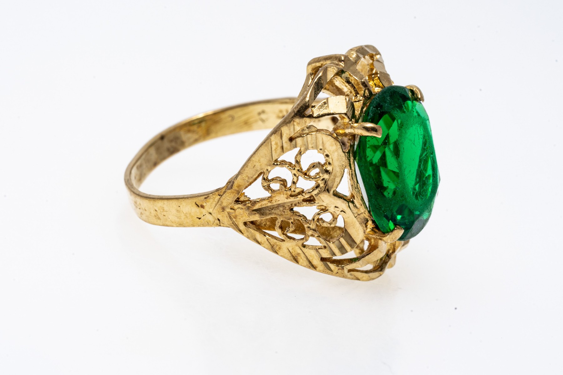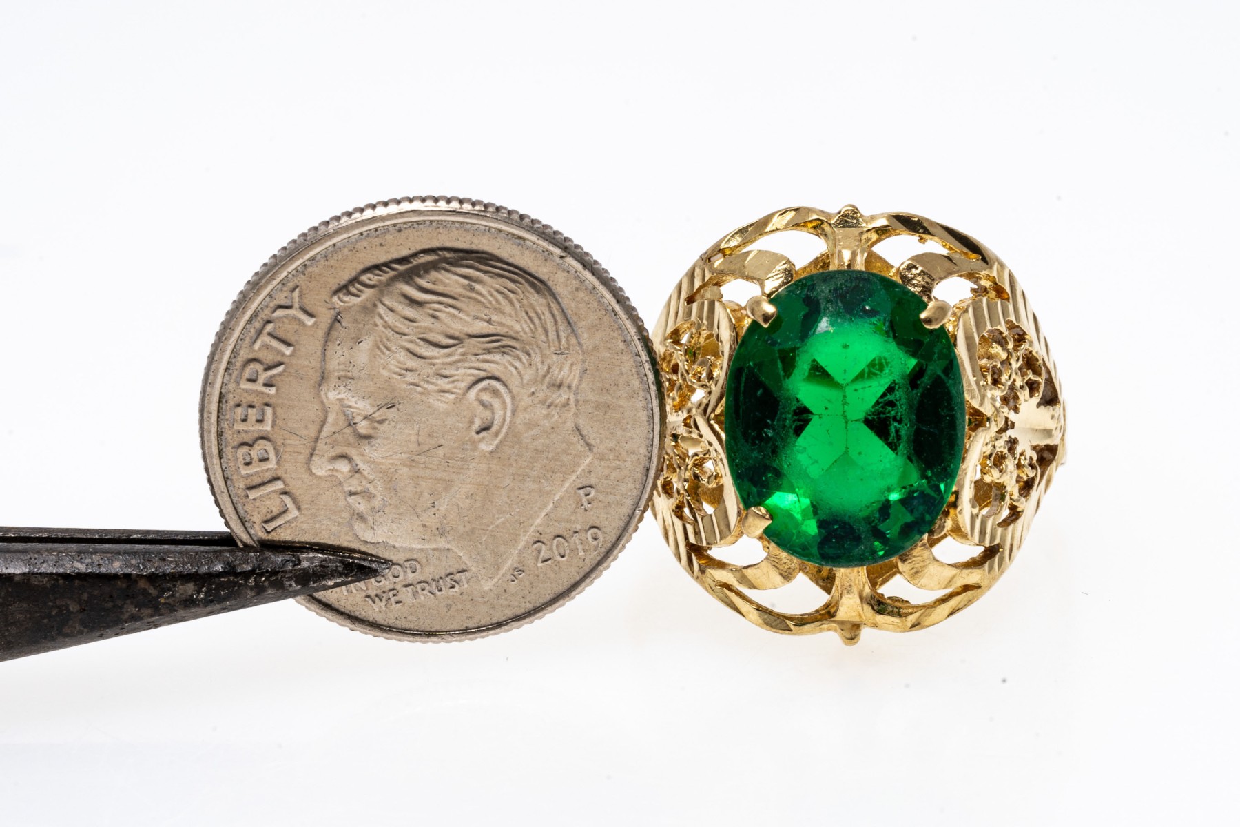 A rich green stimulant stone displayed in a 14K yellow gold ring. The ring has a delicate, open filigree design with diamond cut accenting. Ring size 6.