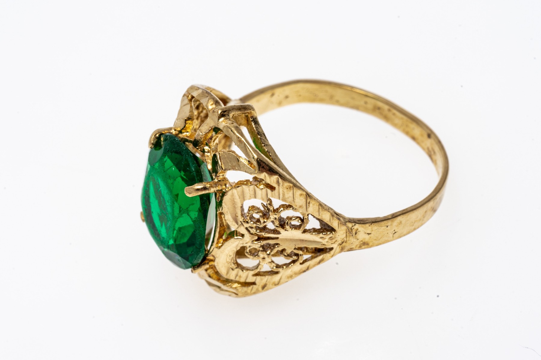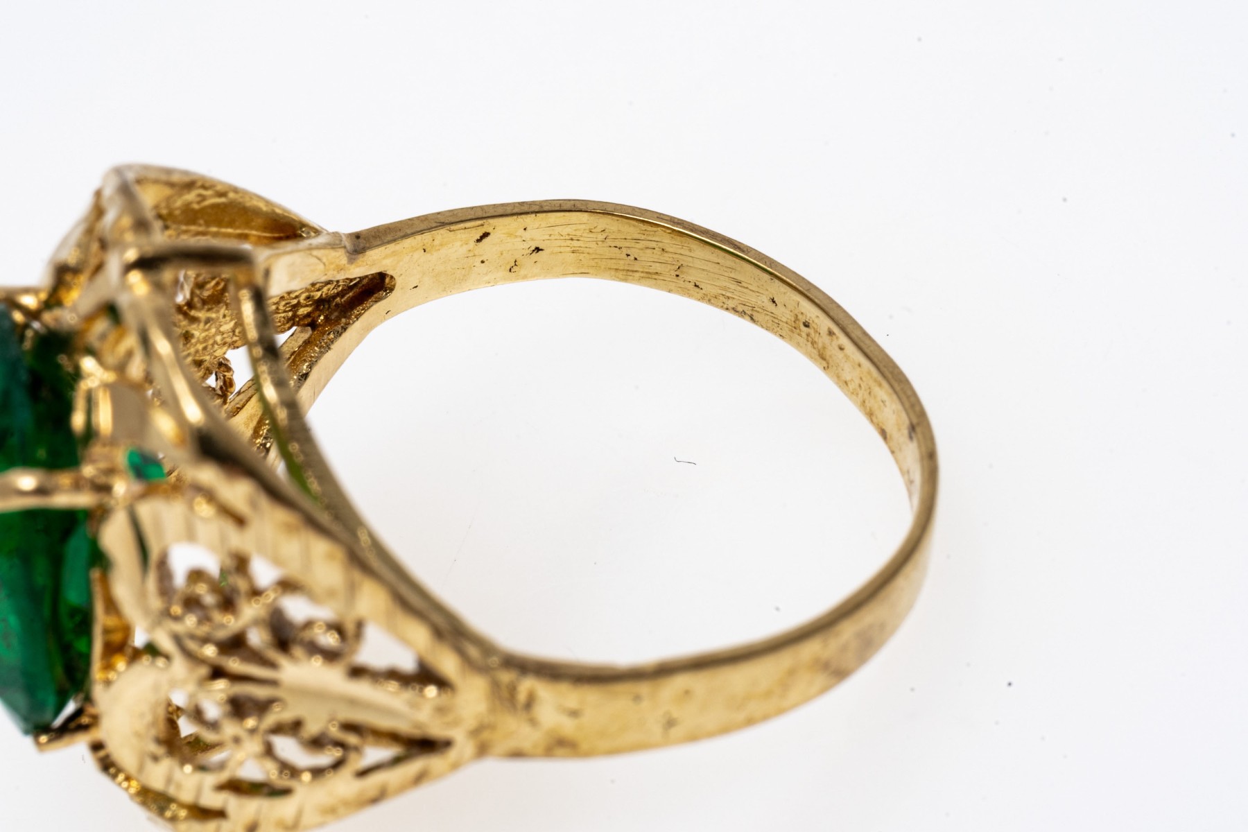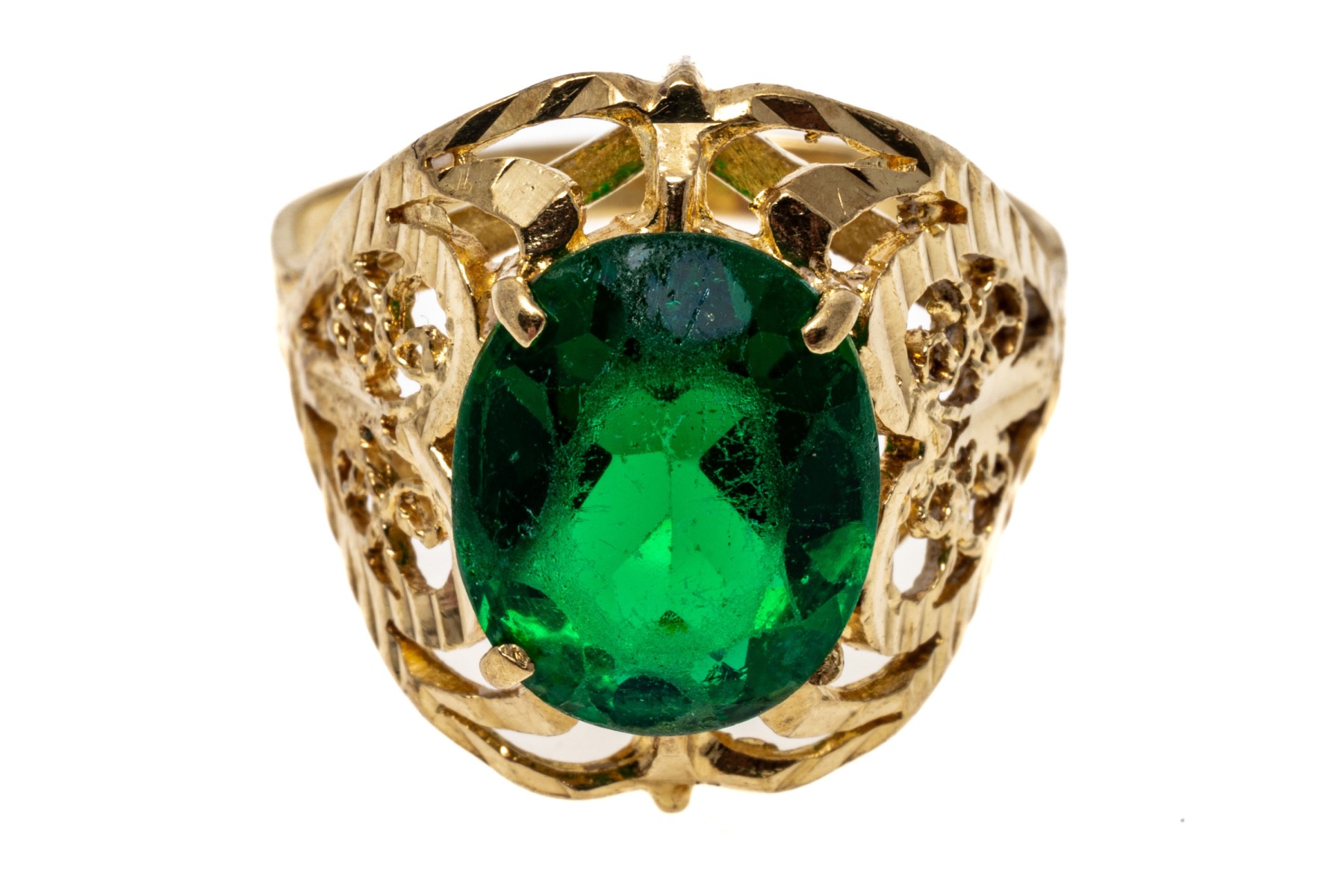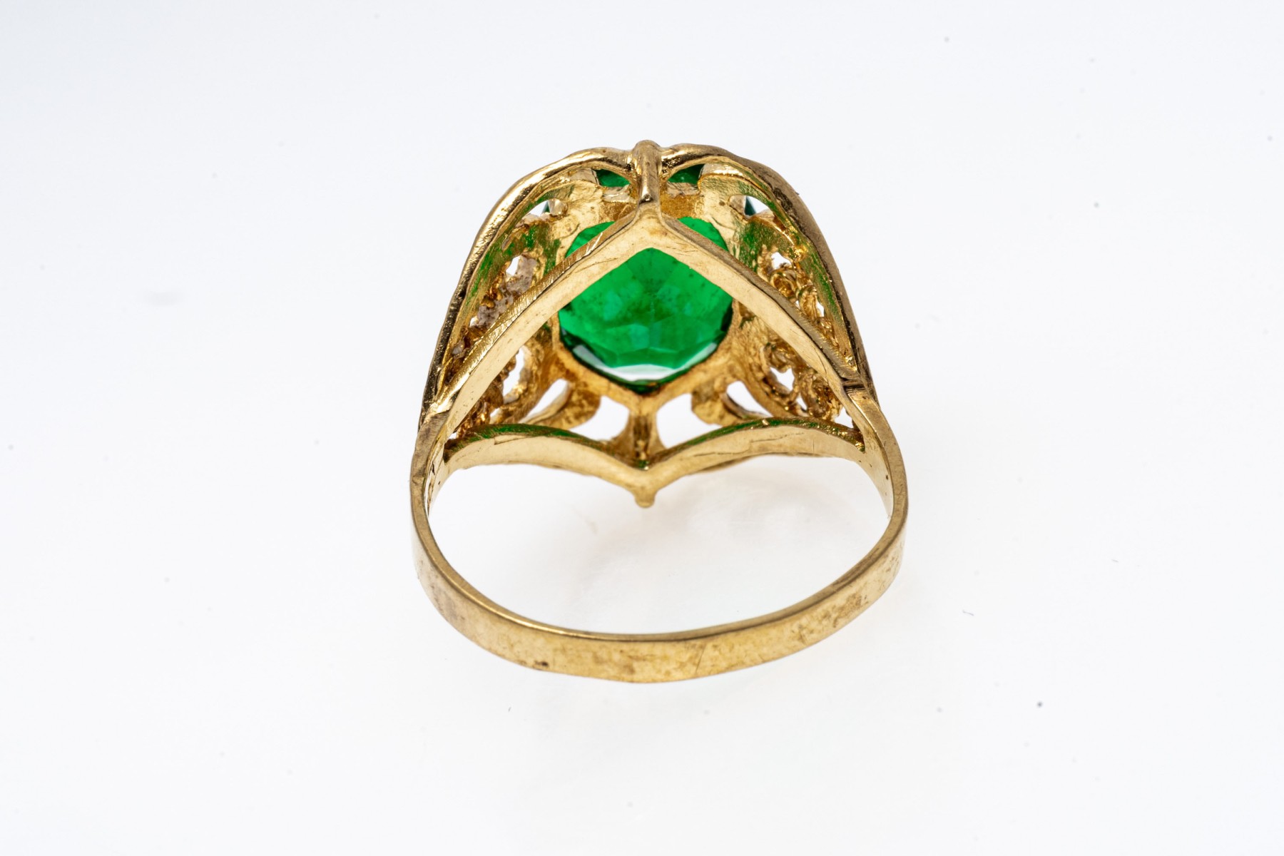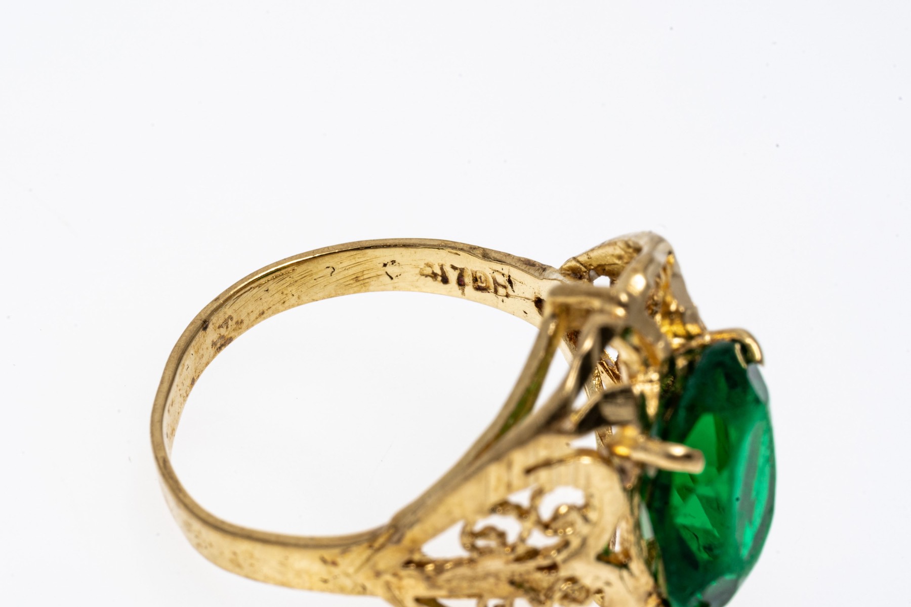 A rich green stimulant stone displayed in a 14K yellow gold ring. The ring has a delicate, open filigree design with diamond cut accenting. Ring size 6.