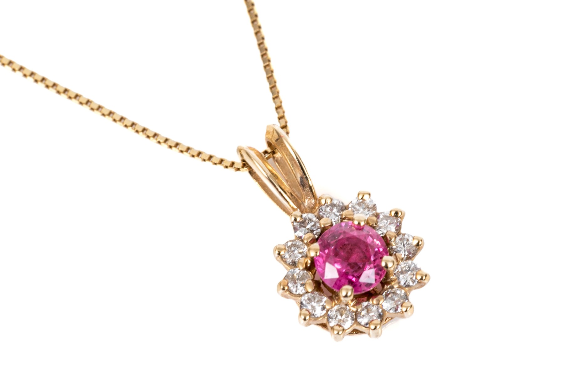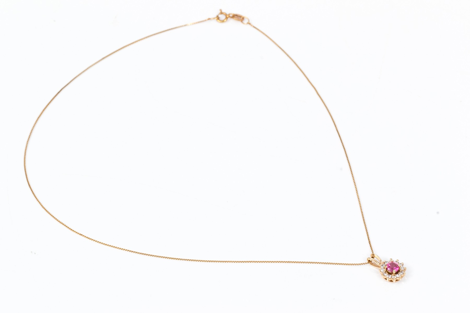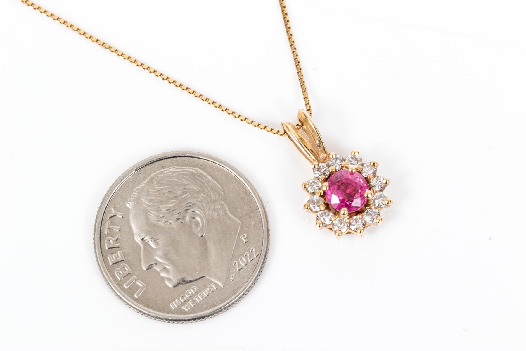 Delicate 14K yellow gold pendant necklace. Box style chain displays a small cluster pendant with split bale. Set into the pendant is a pink sapphire surrounded by round brilliant cut diamonds. The sapphire is approximately 2.54 cts and the diamonds are approximately 0.22 TCW. Spring ring clasp.