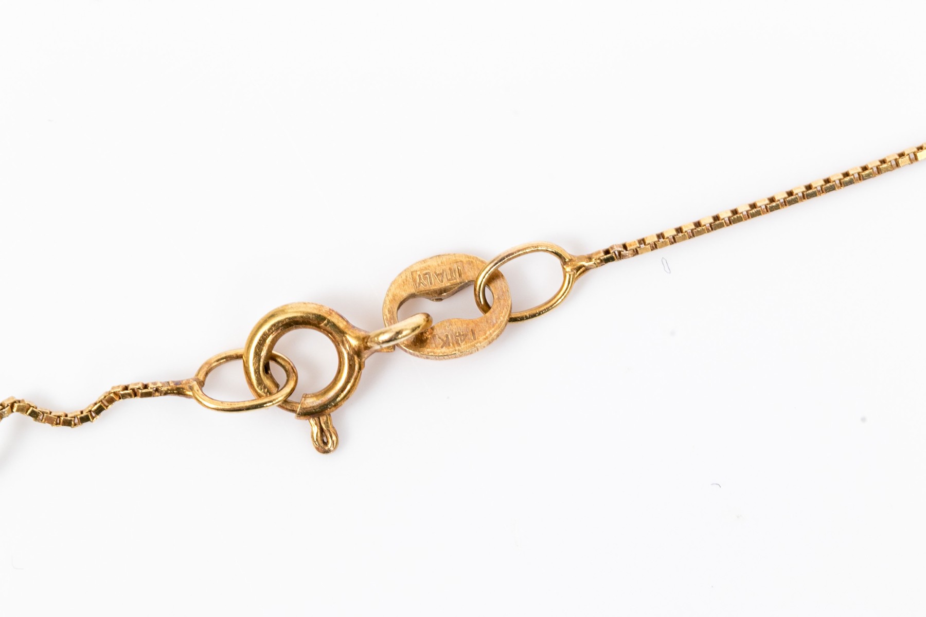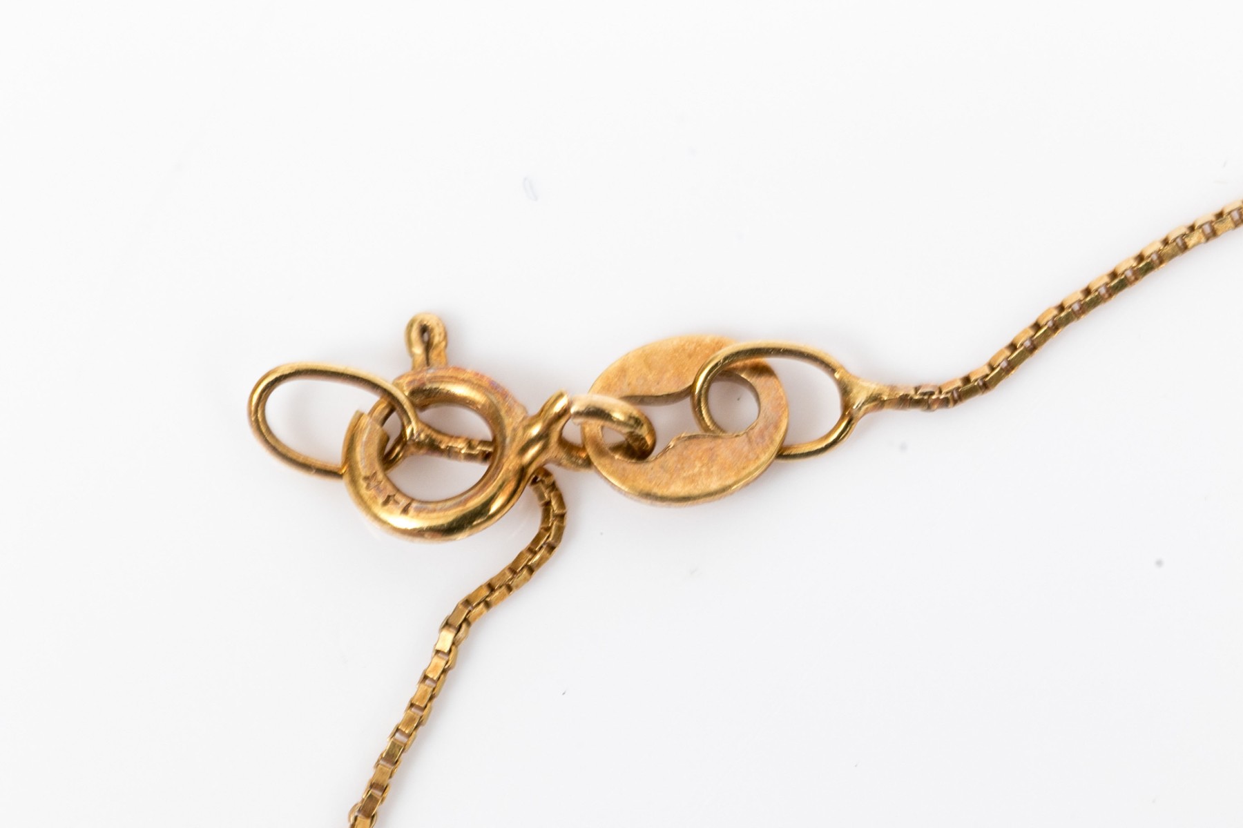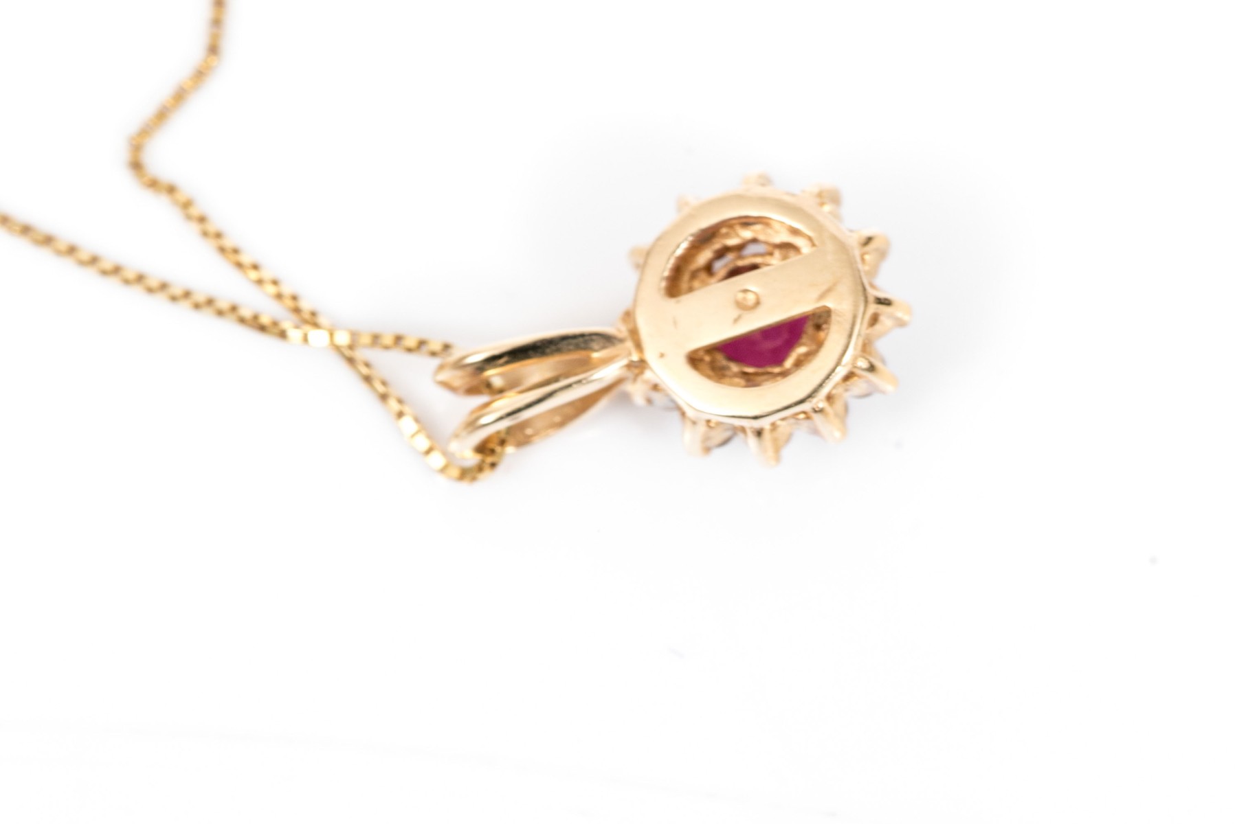 Delicate 14K yellow gold pendant necklace. Box style chain displays a small cluster pendant with split bale. Set into the pendant is a pink sapphire surrounded by round brilliant cut diamonds. The sapphire is approximately 2.54 cts and the diamonds are approximately 0.22 TCW. Spring ring clasp.