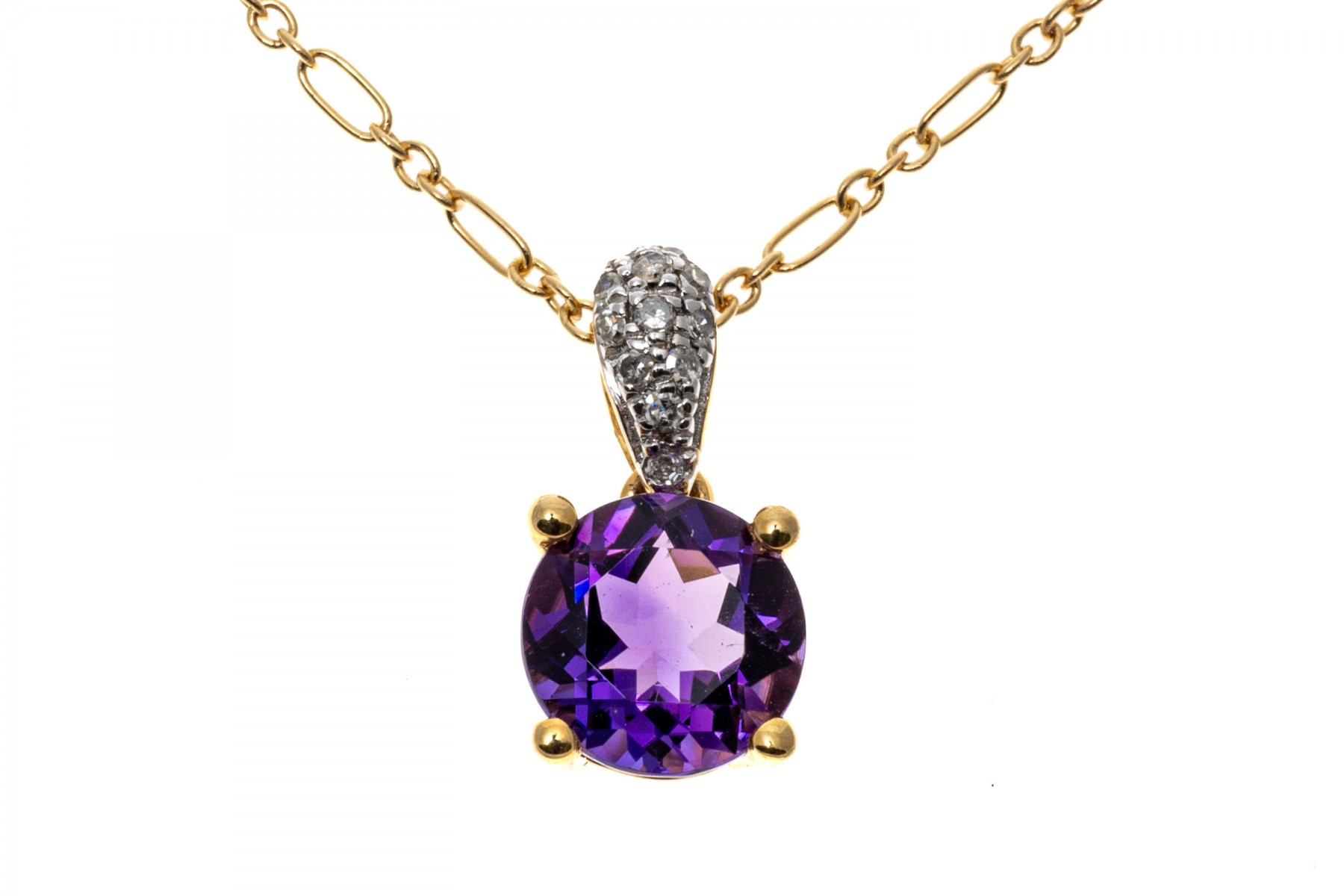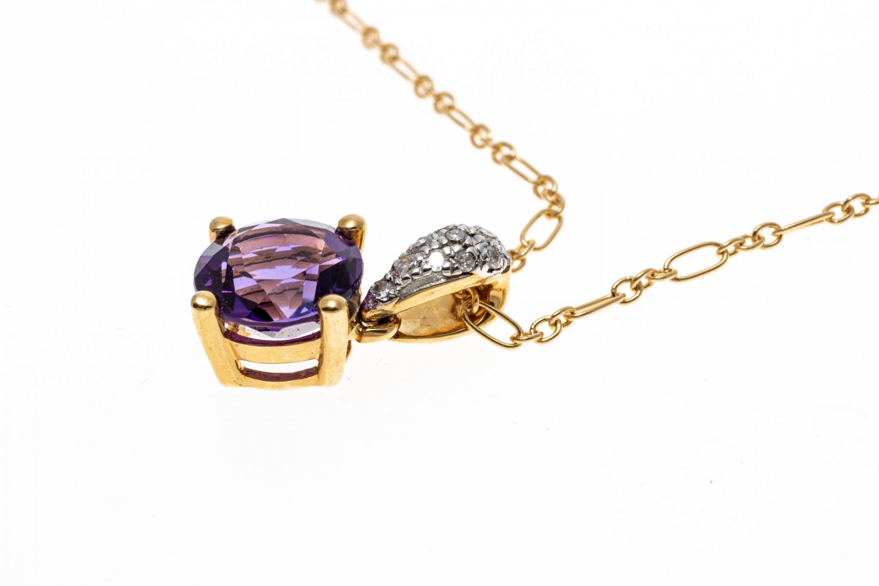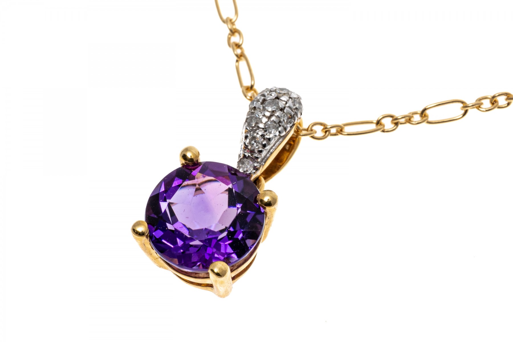 14K yellow gold pendant necklace. A delicate chain displays a small pendant set with a single round faceted amethyst, approximately 0.94 cts. Accent diamonds are set into the pendant bale. The chain secures with a spring ring clasp.