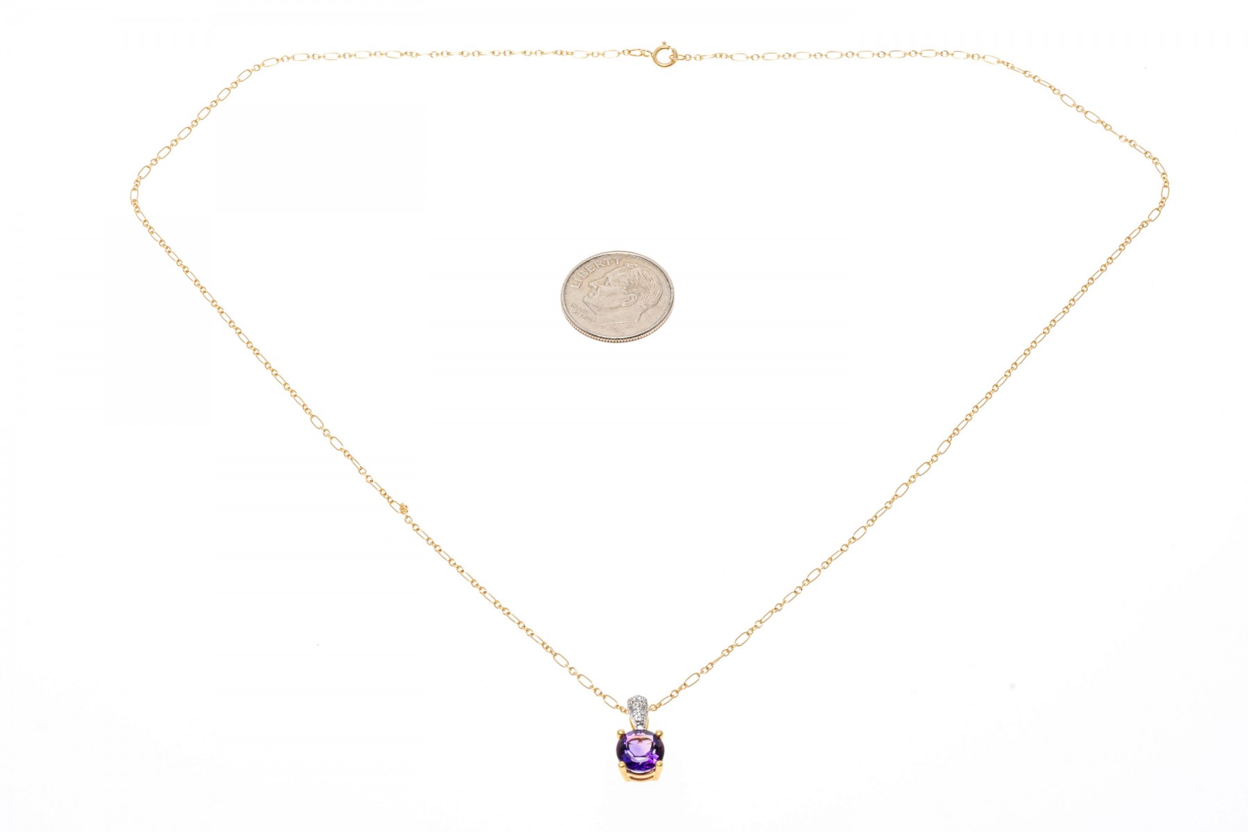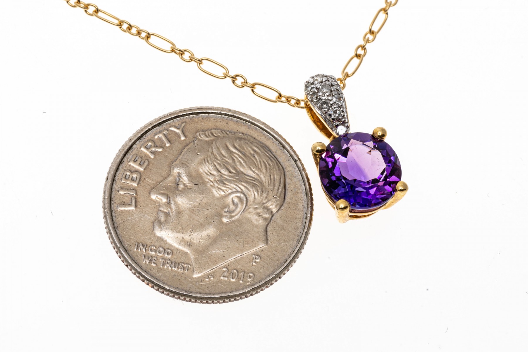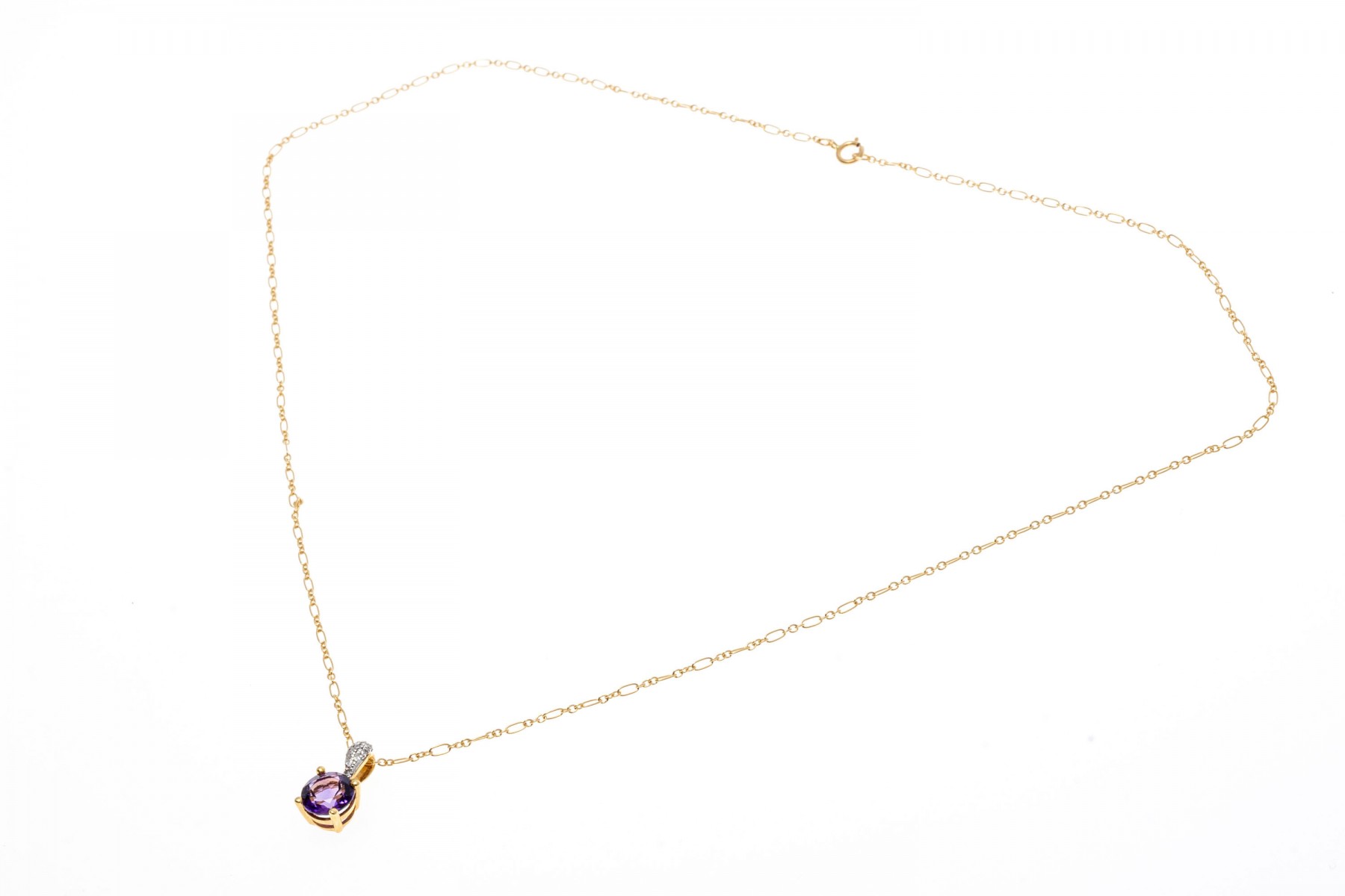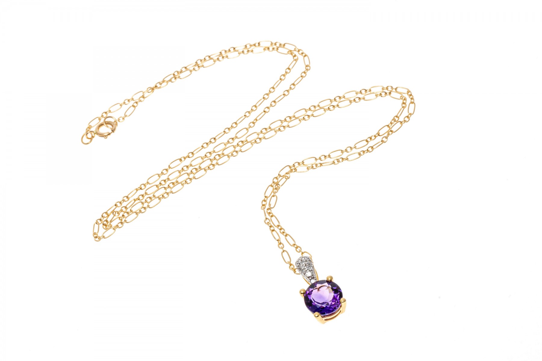 14K yellow gold pendant necklace. A delicate chain displays a small pendant set with a single round faceted amethyst, approximately 0.94 cts. Accent diamonds are set into the pendant bale. The chain secures with a spring ring clasp.