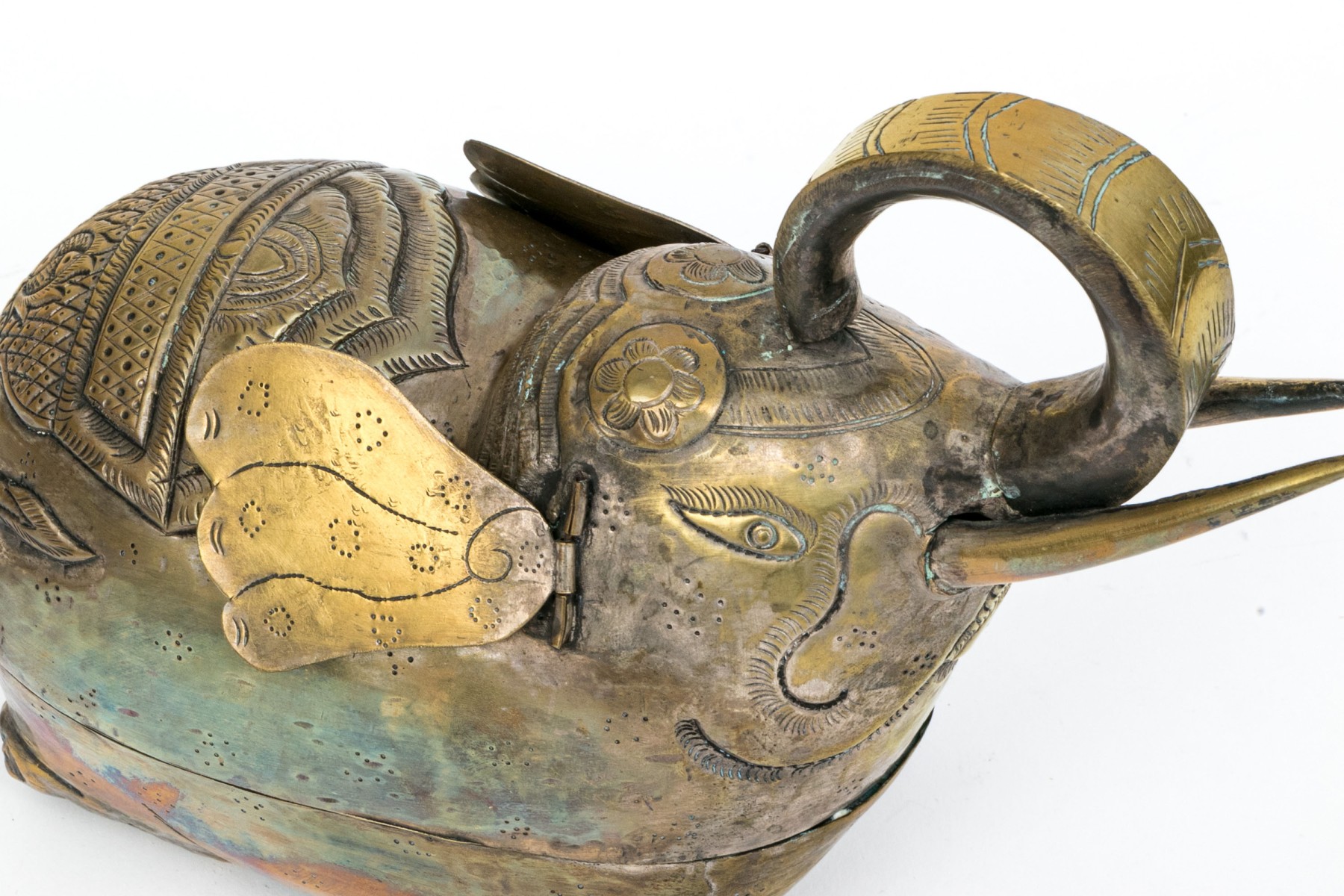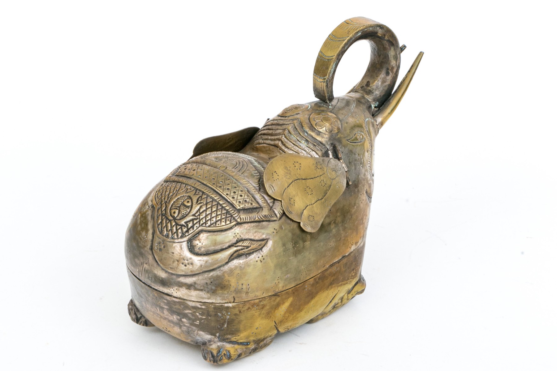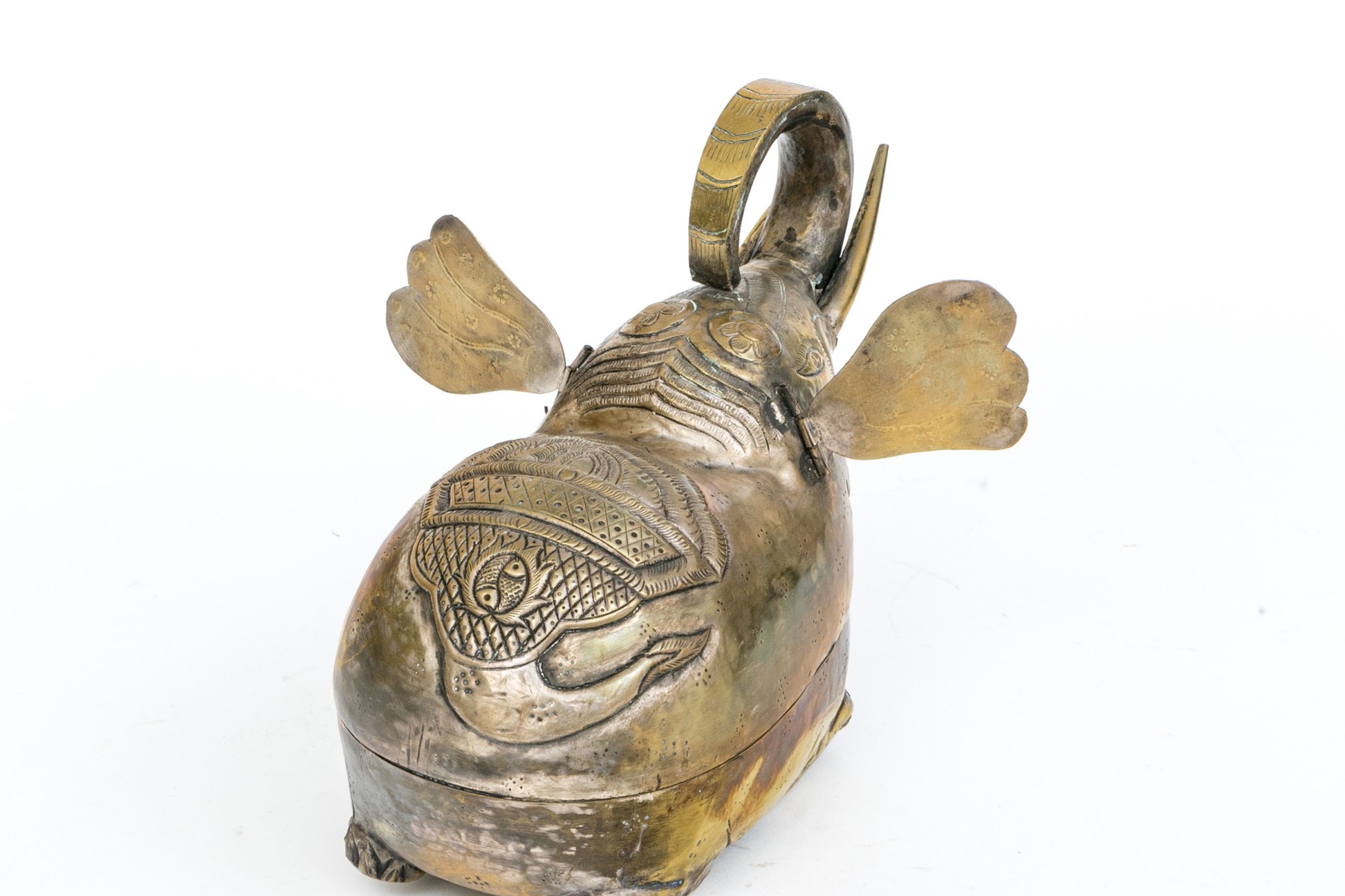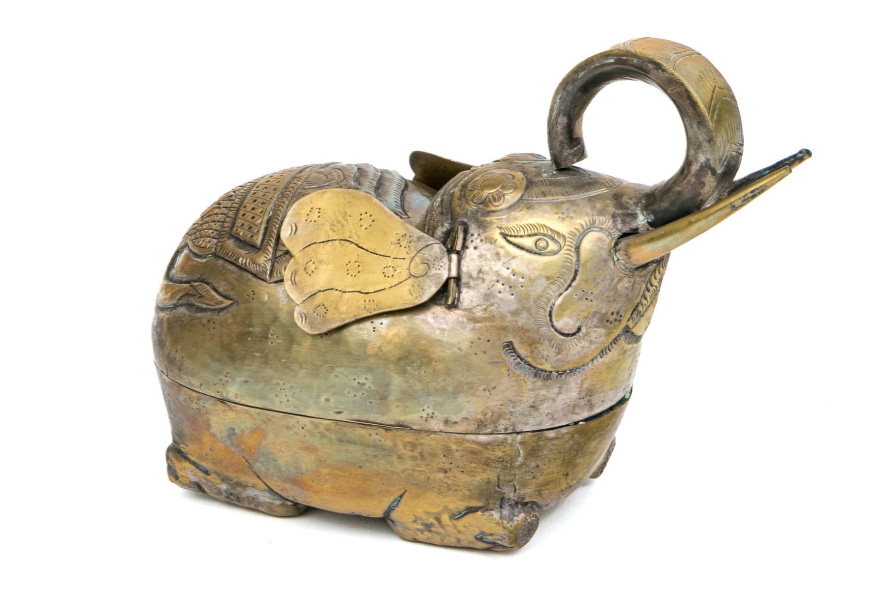A beautifully aged, figural box in the form of an elephant, likely Cambodian or Burmese. Subtly silvered over brass or copper. and detailed with hand tooled designs throughout, featuring a basket pattern and yin-yang fish motif along the back. Finished with delightful, hinged ears with scalloped edges.