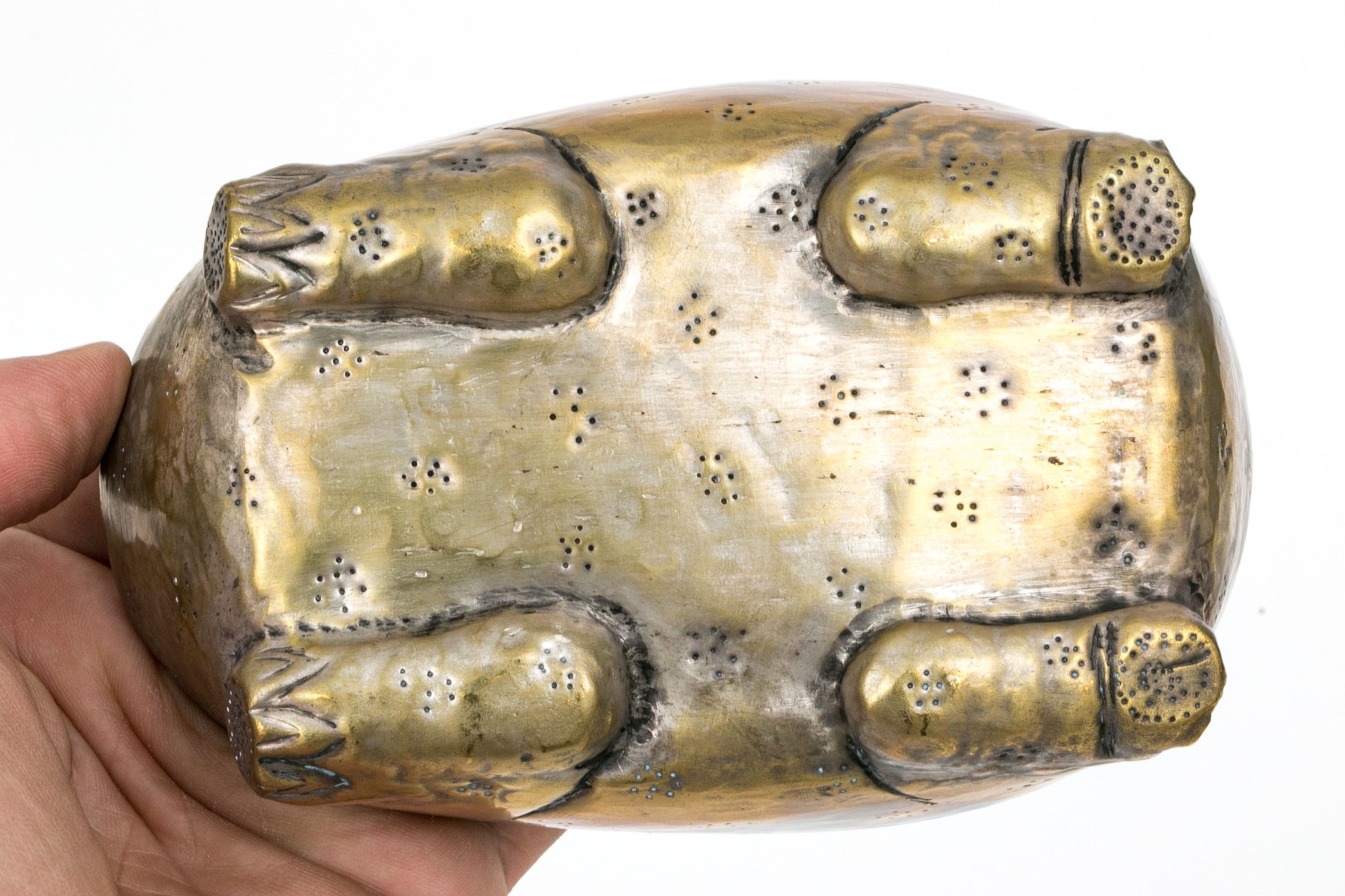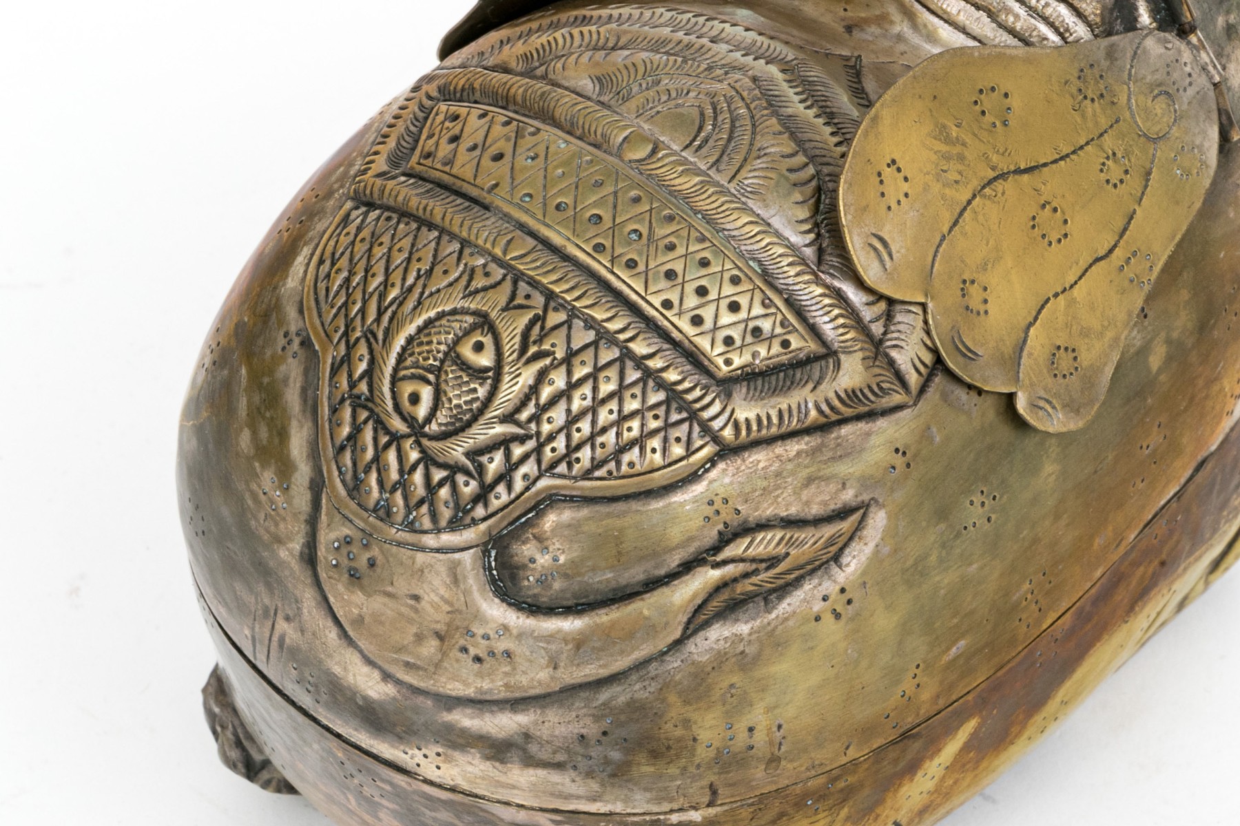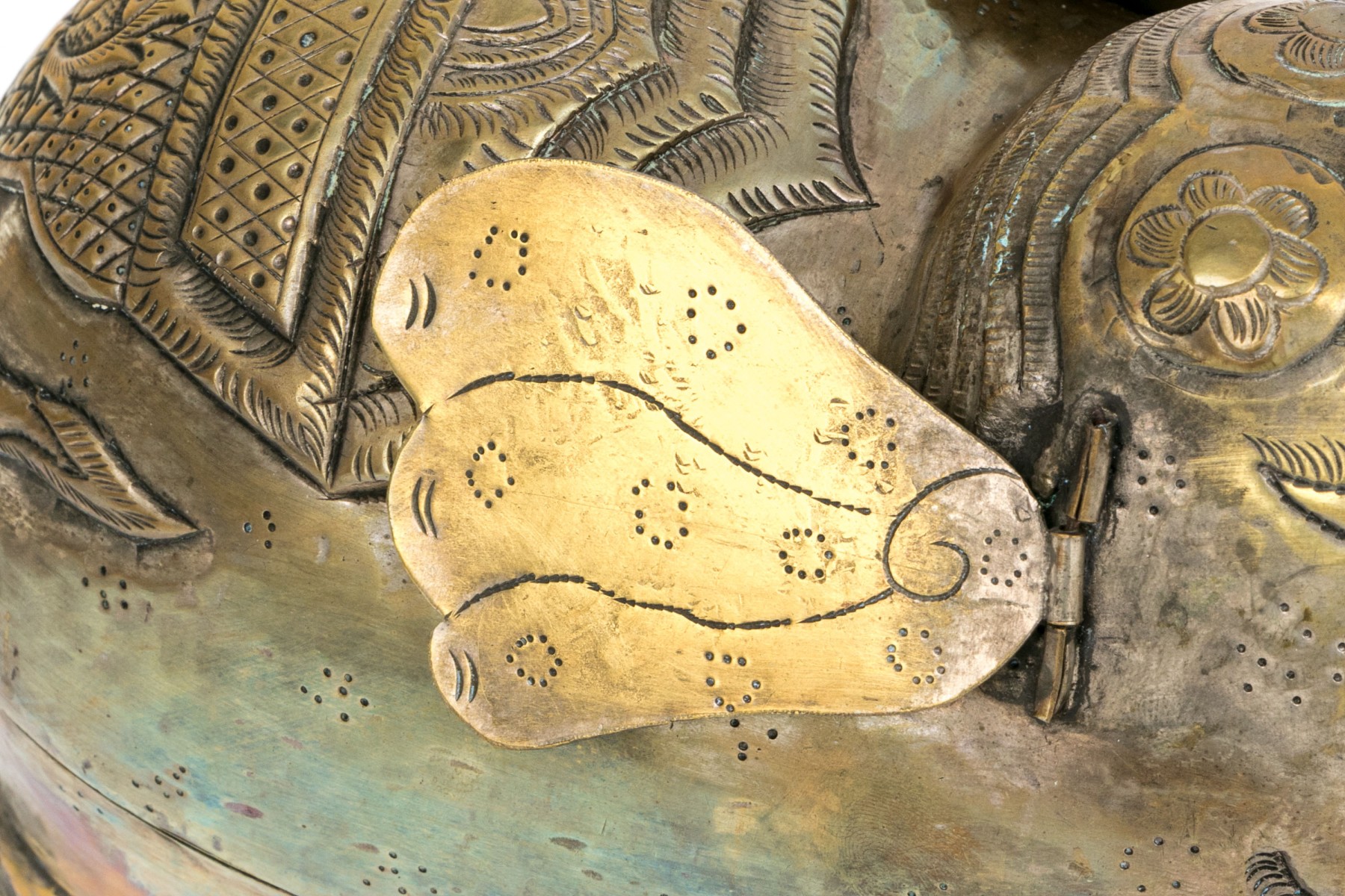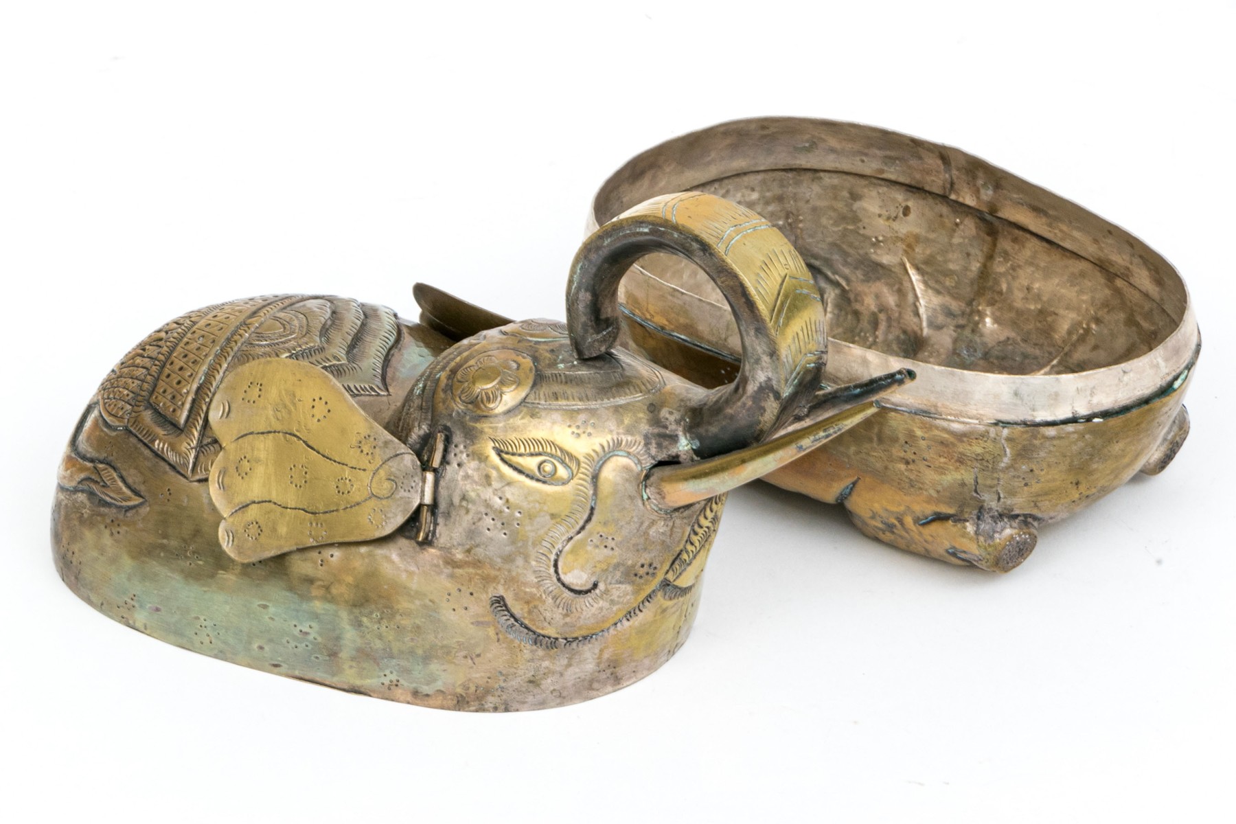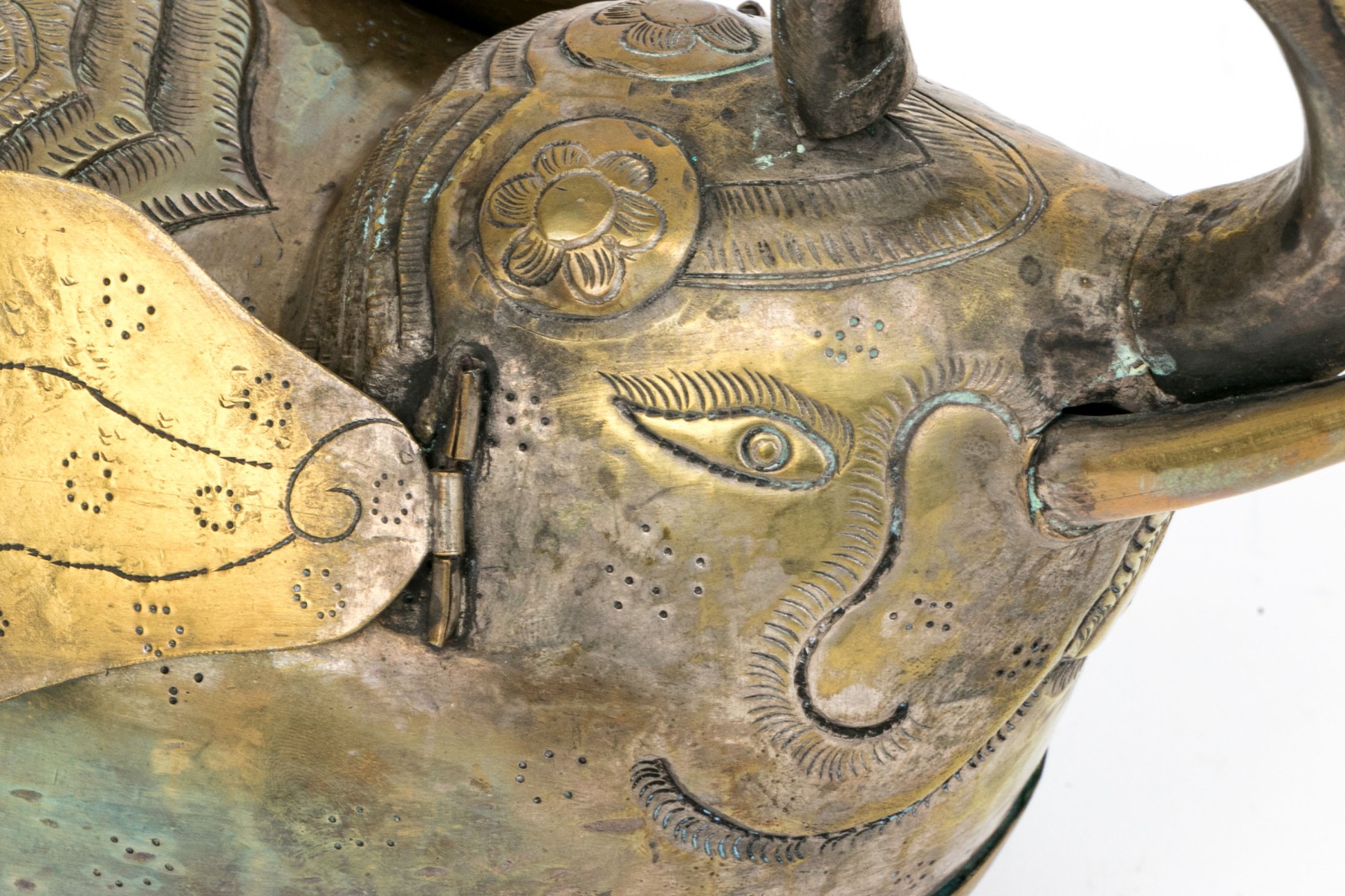 A beautifully aged, figural box in the form of an elephant, likely Cambodian or Burmese. Subtly silvered over brass or copper. and detailed with hand tooled designs throughout, featuring a basket pattern and yin-yang fish motif along the back. Finished with delightful, hinged ears with scalloped edges.