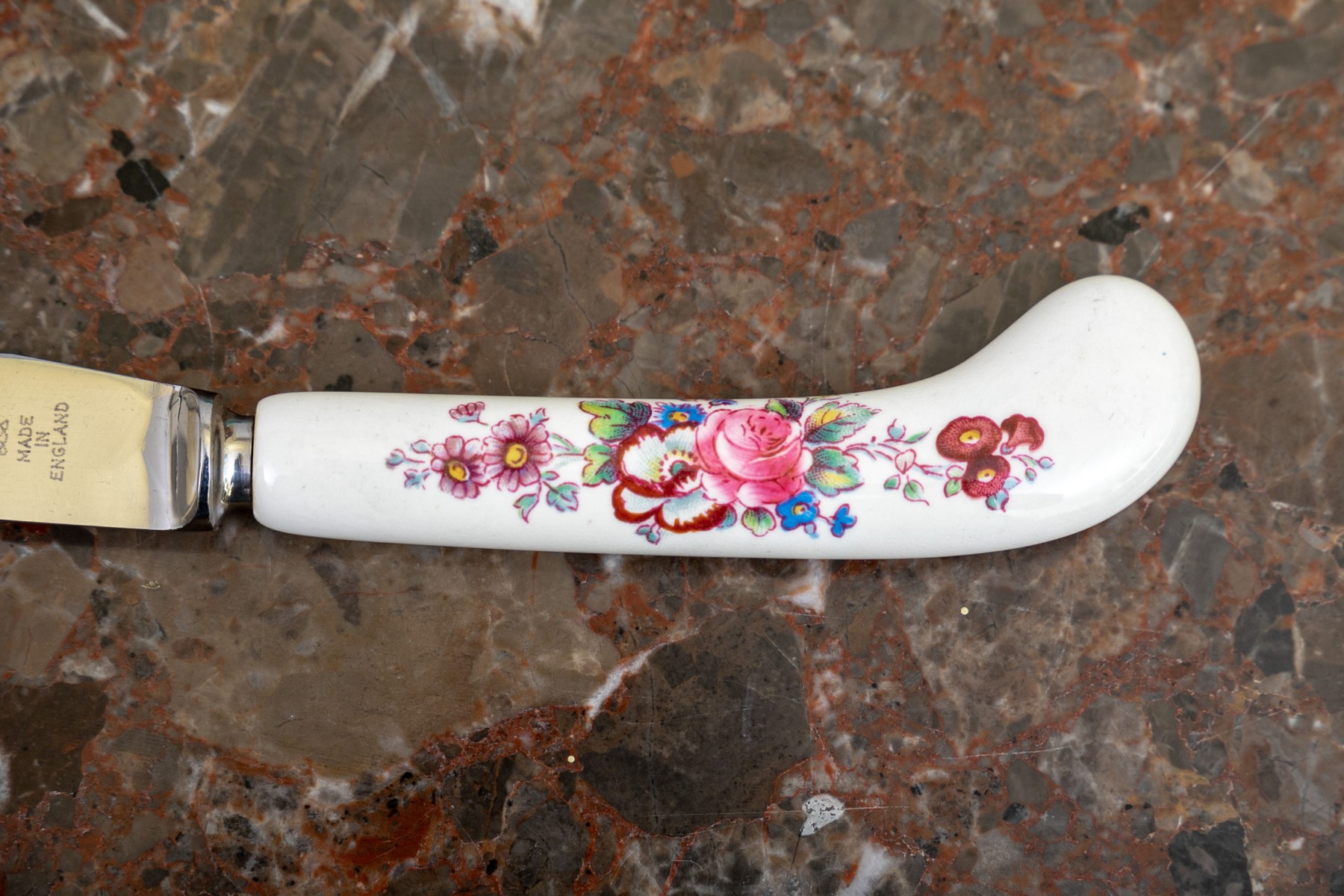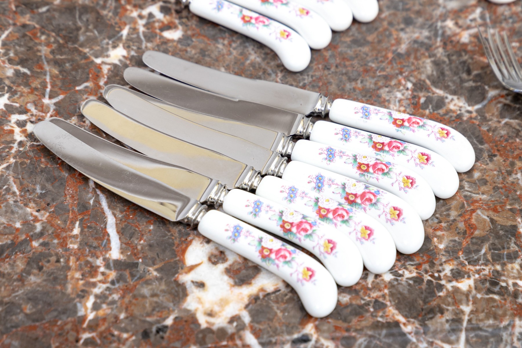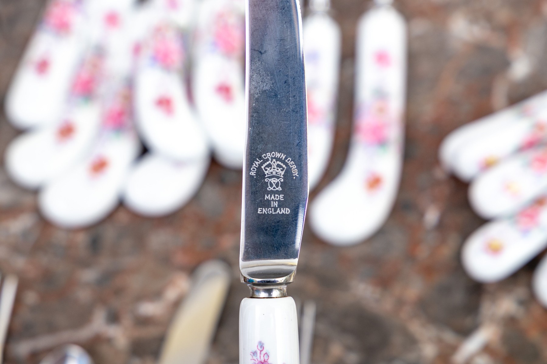 The service features blades marked "Royal Crown Derby / Made In England". All pieces feature polychrome floral sprays on "J" form white china handles.